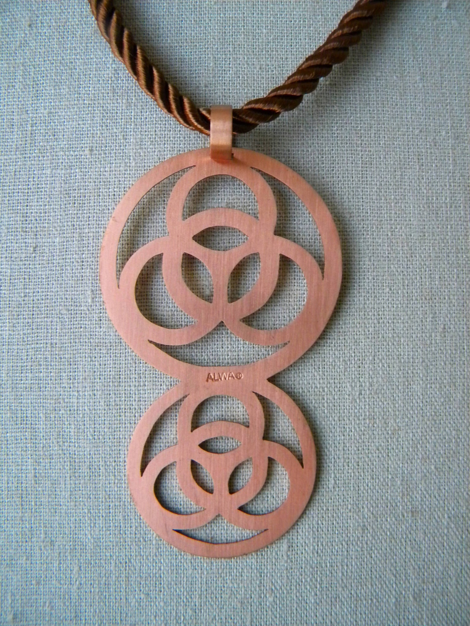 Este collar corto, que pertenece a la colección multicírculos de Alwacobre, viene con una seda color chocolate con tubos y terminales de cobre y un colgante hecho 100% a mano en cobre, con dos multi-círculos unidos, que mide en total 8,5cm de largo y 4,5cm de ancho.