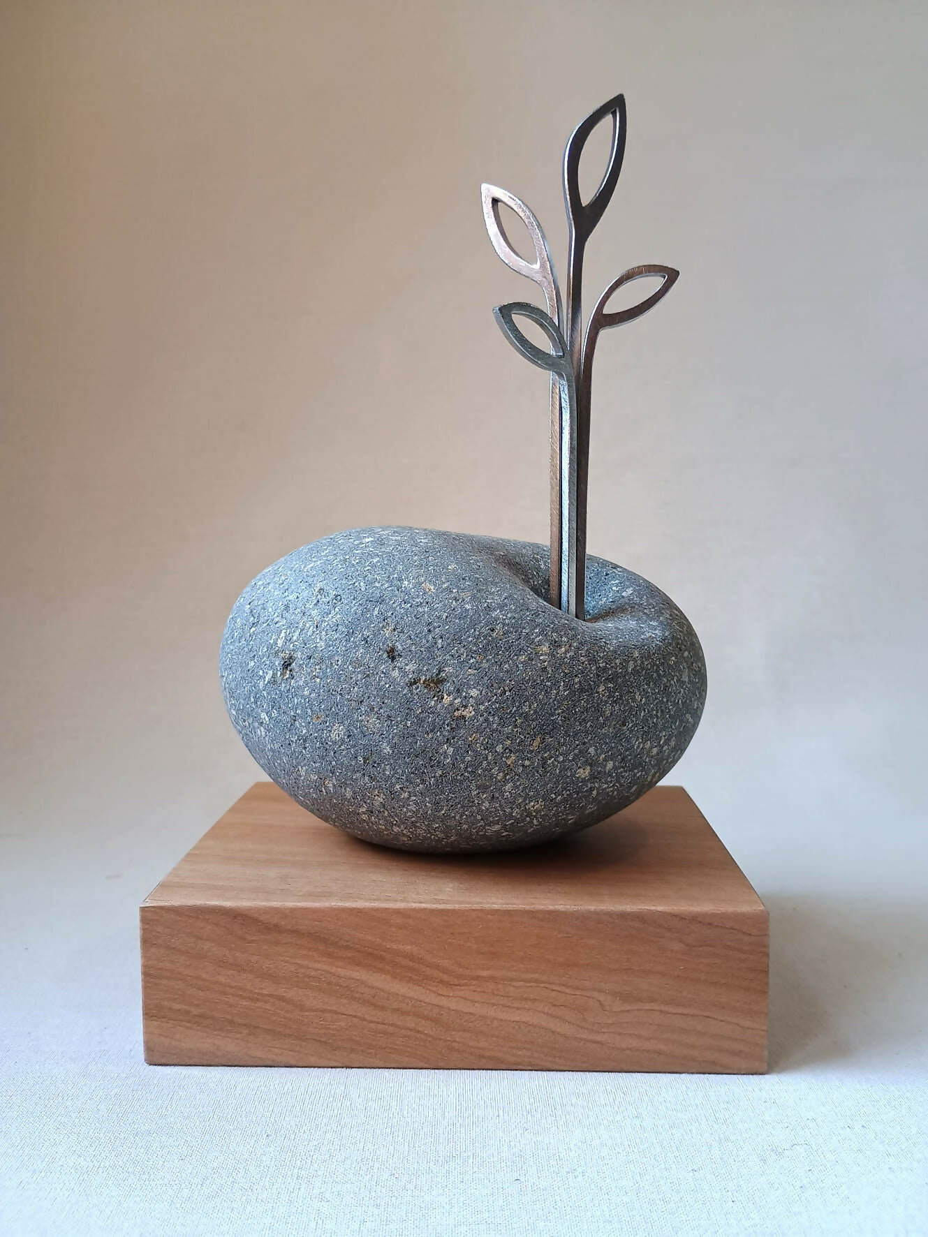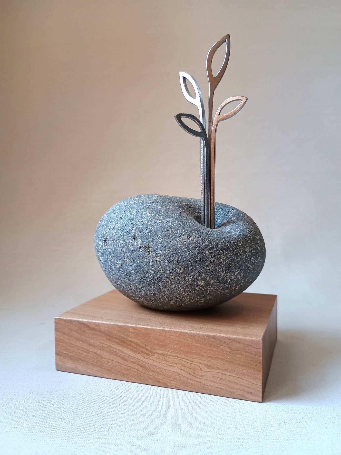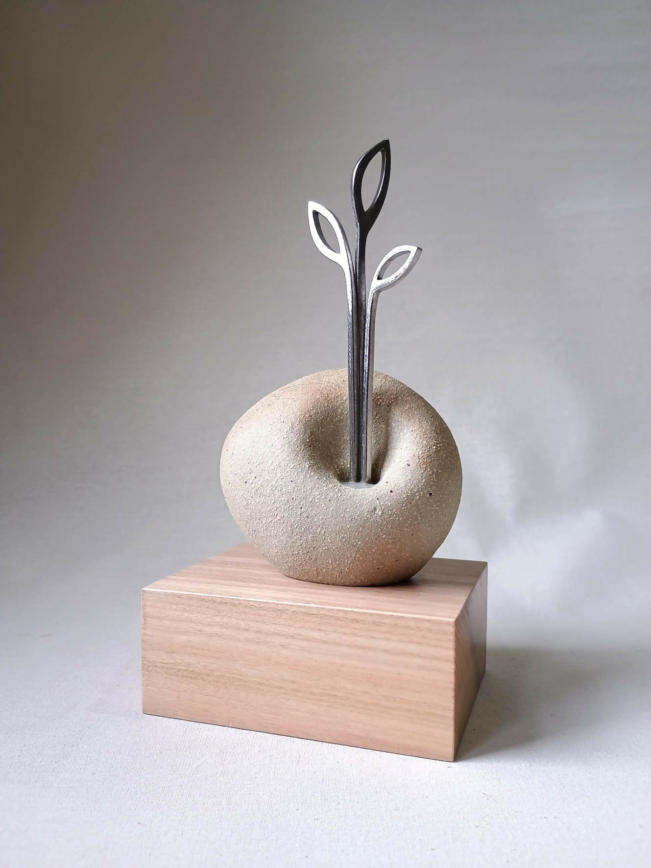 Escultura Cerámica Gres y Acero inoxidableBase madera de coigüe.Dimensiones 21 x 8,5 x 11 cmEscultura Piedra y Acero inoxidableBase madera de coigüe.Dimensiones 22 x 13 x 11 cm