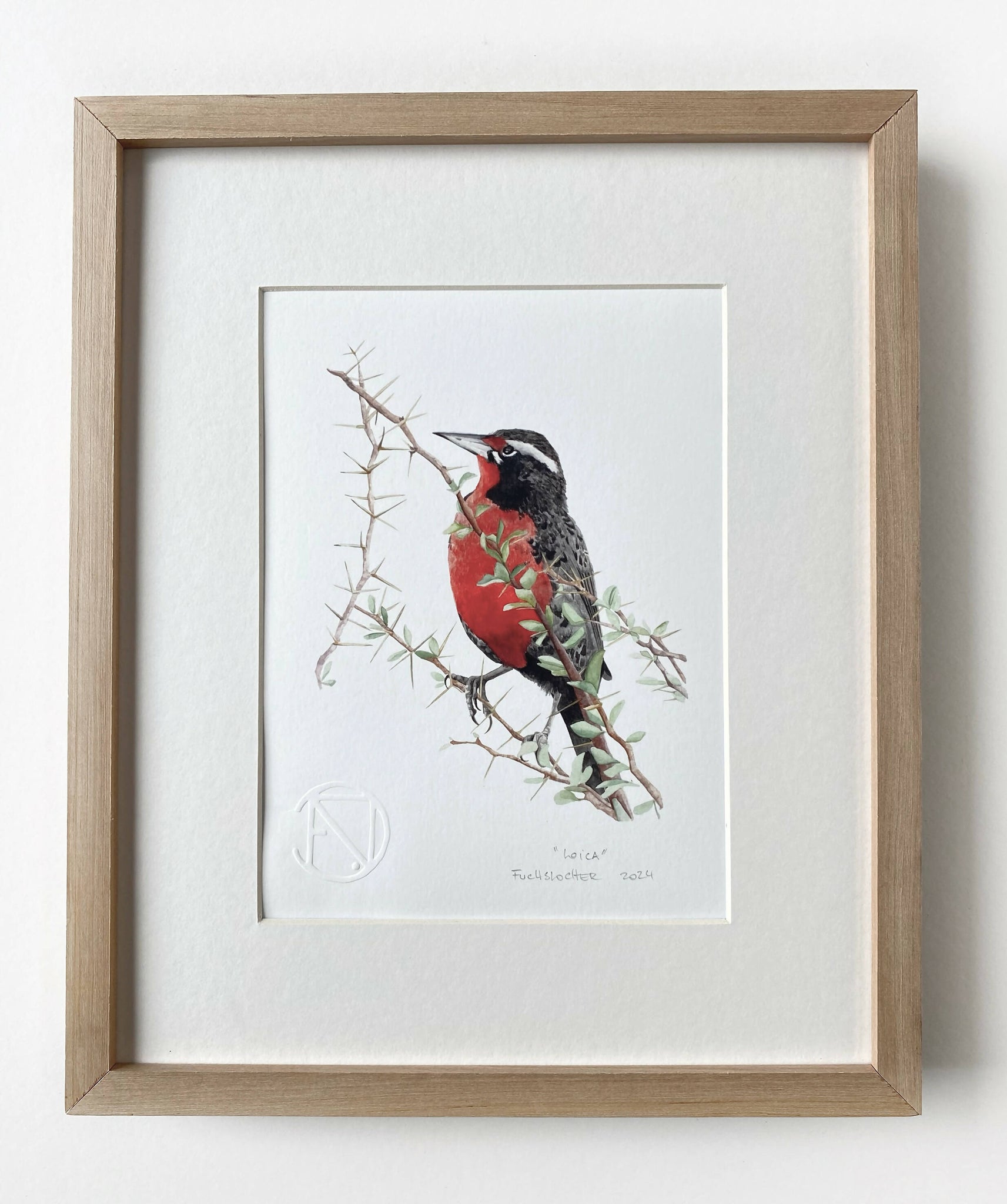 Ilustración del ave chilena, Loica que forma parte de la colección en acuarela de Aves Nativas de Daniela Fuchslocher.