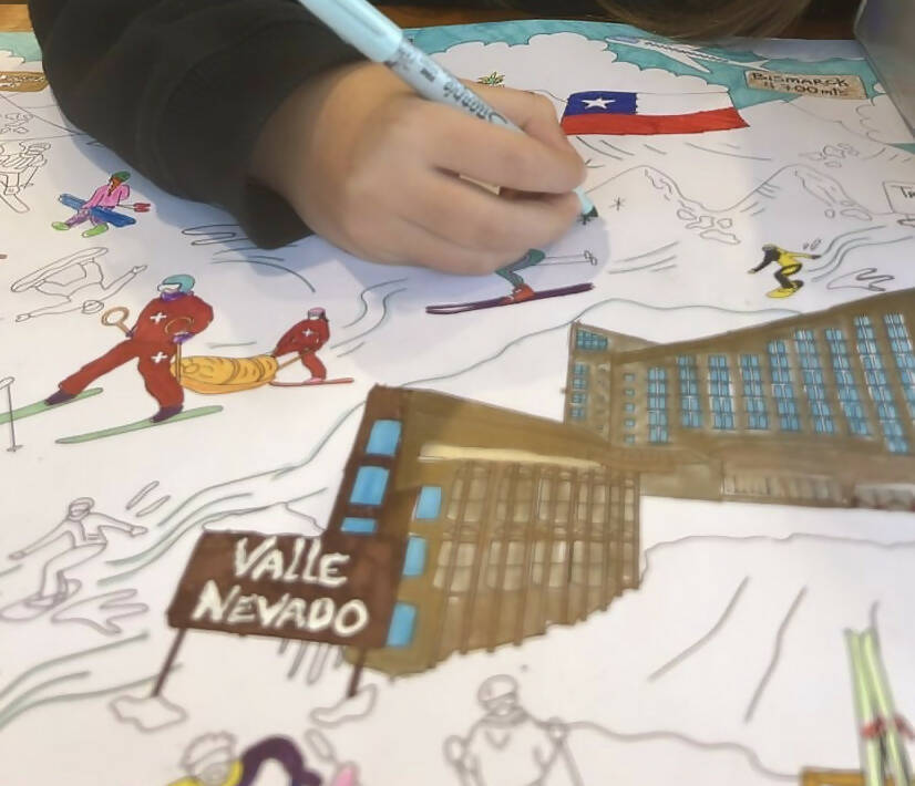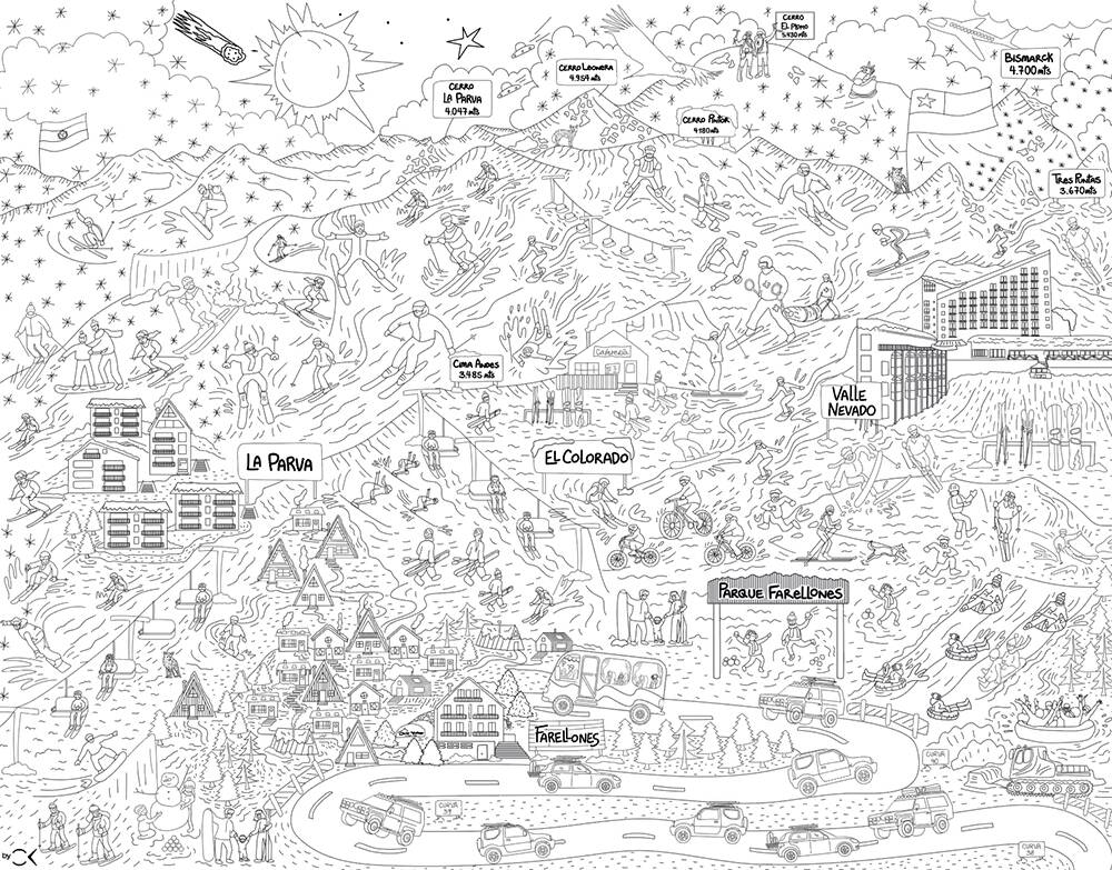Esta lámina ilustra Farellones con sus 3 valles: COLORADO, LA PARVA y VALLE NEVADO. Promueve la imaginación de los niños, los entretiene por largo rato, genera un espacio de trabajo en equipo y ayuda con la motricidad fina.