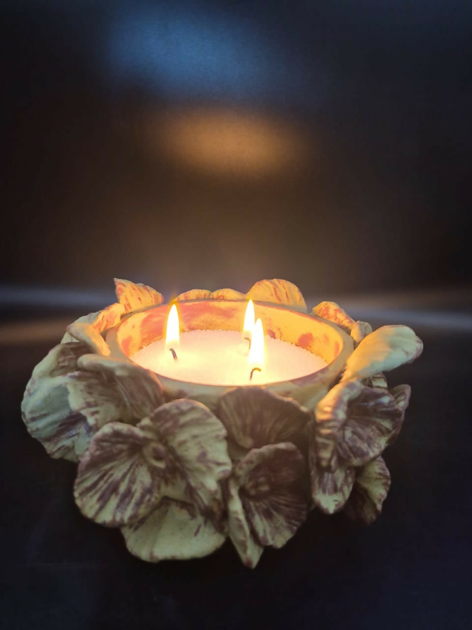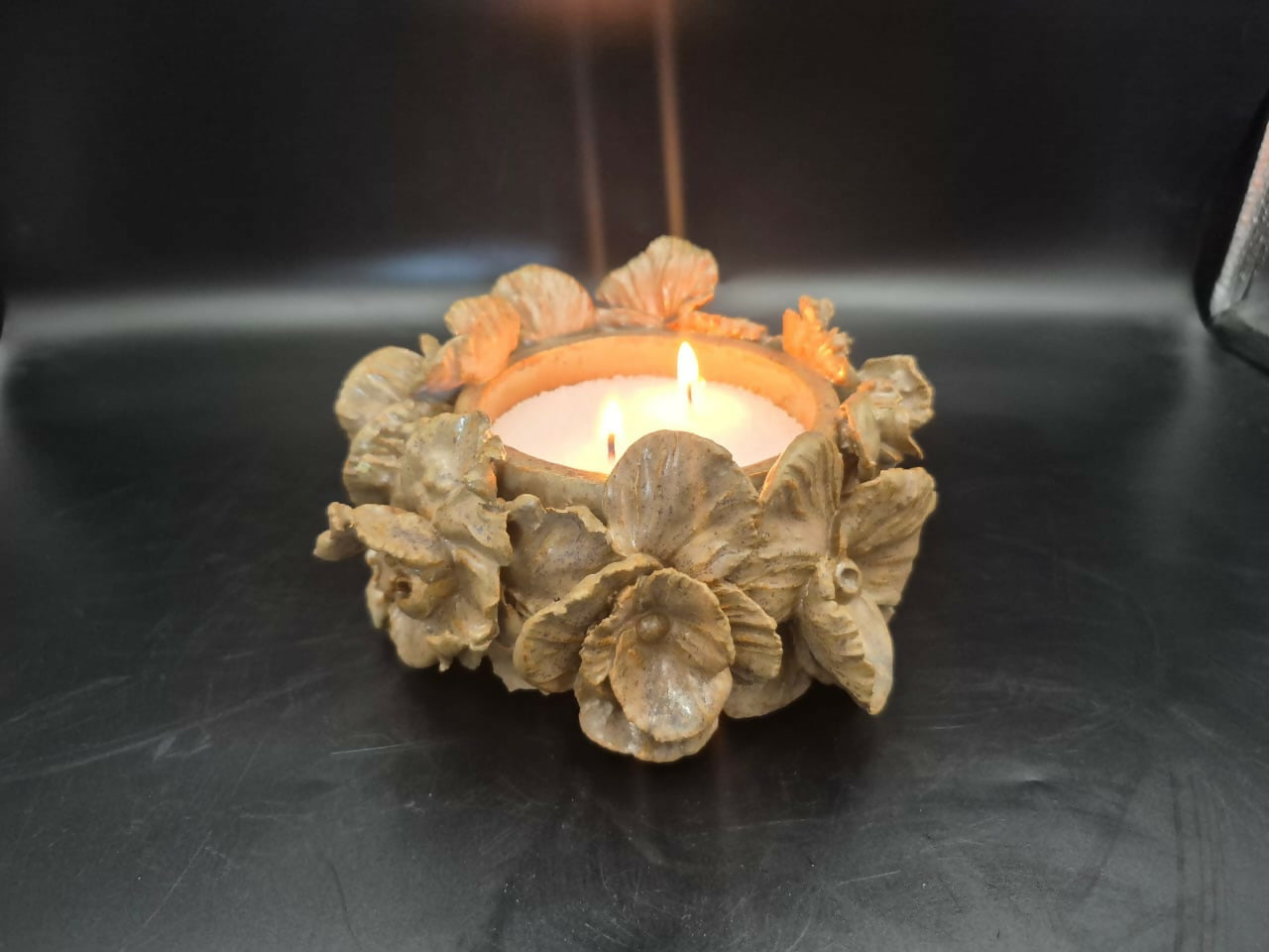 Original Portavela de cerámica gres, redonda con aplicación de flores, esmalte ocre mate