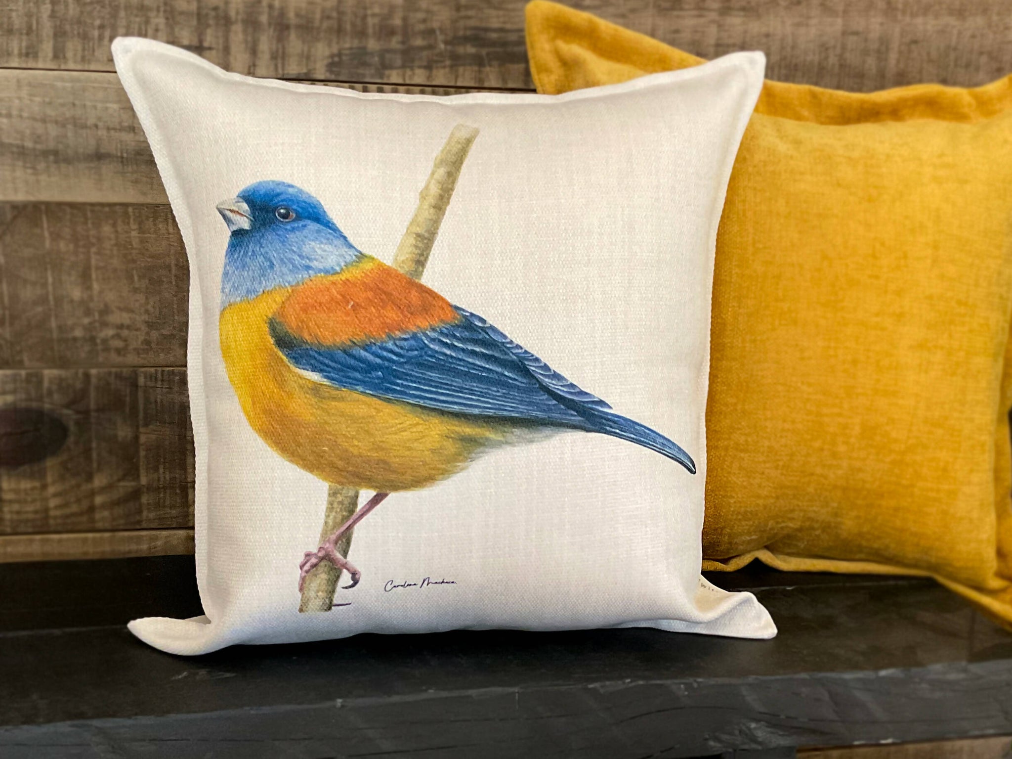 Funda de cojín impresa con ilustración realizadas en acuarela de la fauna nativa del sur de Chile por la ilustradora Carolina Machuca.