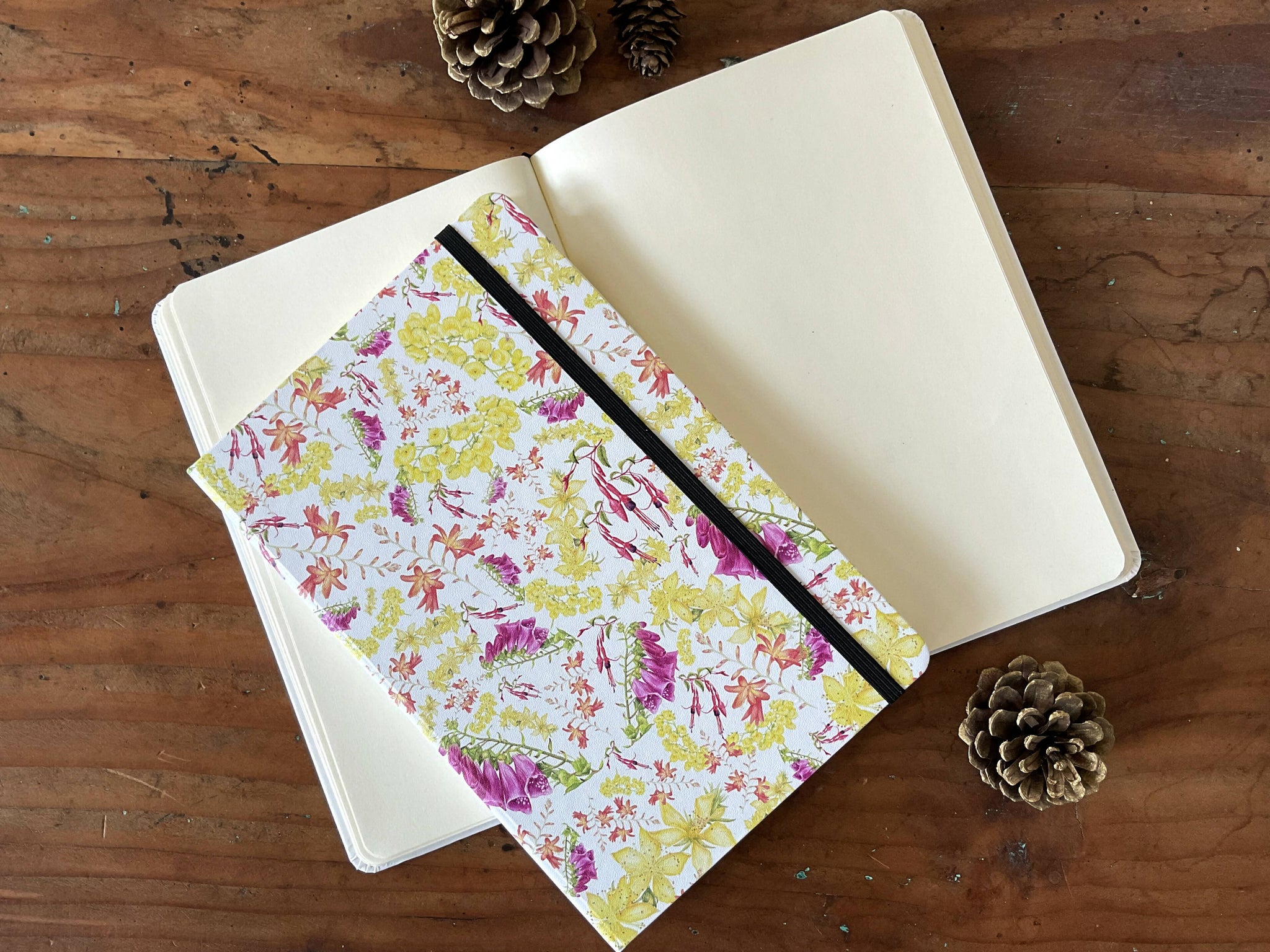 Libreta de tapa dura de cuerina impresa con ilustraciones de la flora y fauna del sur de Chile realizadas en acuarela por la artista Carolina Machuca. Su interior consta de 50 páginas amarillas de 80 grs.