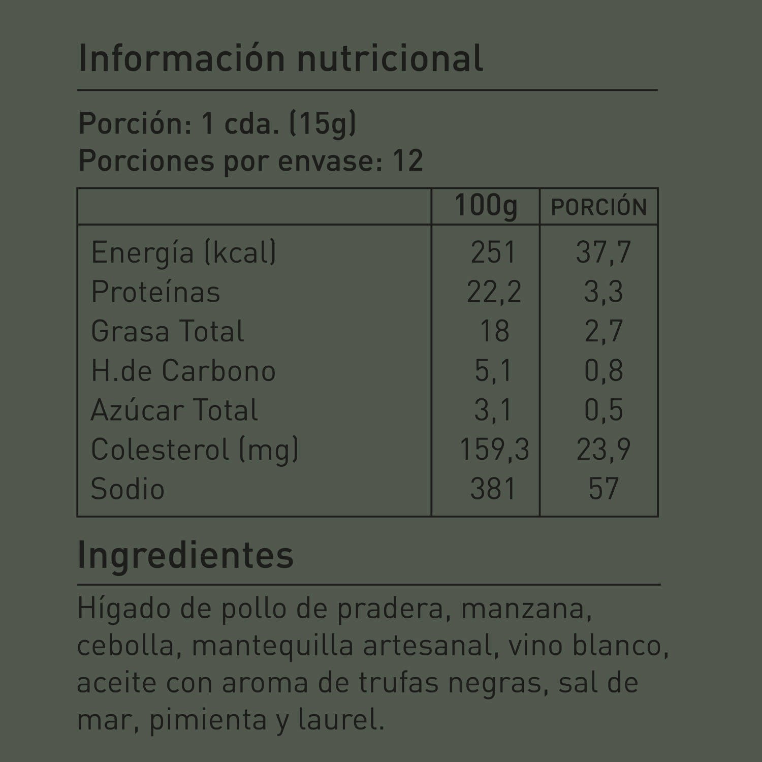 Paté Trufado, 100% natural, sin preservantes ni aditivos. Está hecho con hígado de pollo de pradera y aceite con trufas negras. Tiene un sabor único y textura suave como un mousse. Es un complemento ideal para cualquier aperitivo. Recomendamos servir sobre tostadas. Envase conservero de vidrio de 180 grs. No necesita refrigeración. Duración: sin abrir, un año en la despensa y 7 días en el refrigerador una vez abierto.