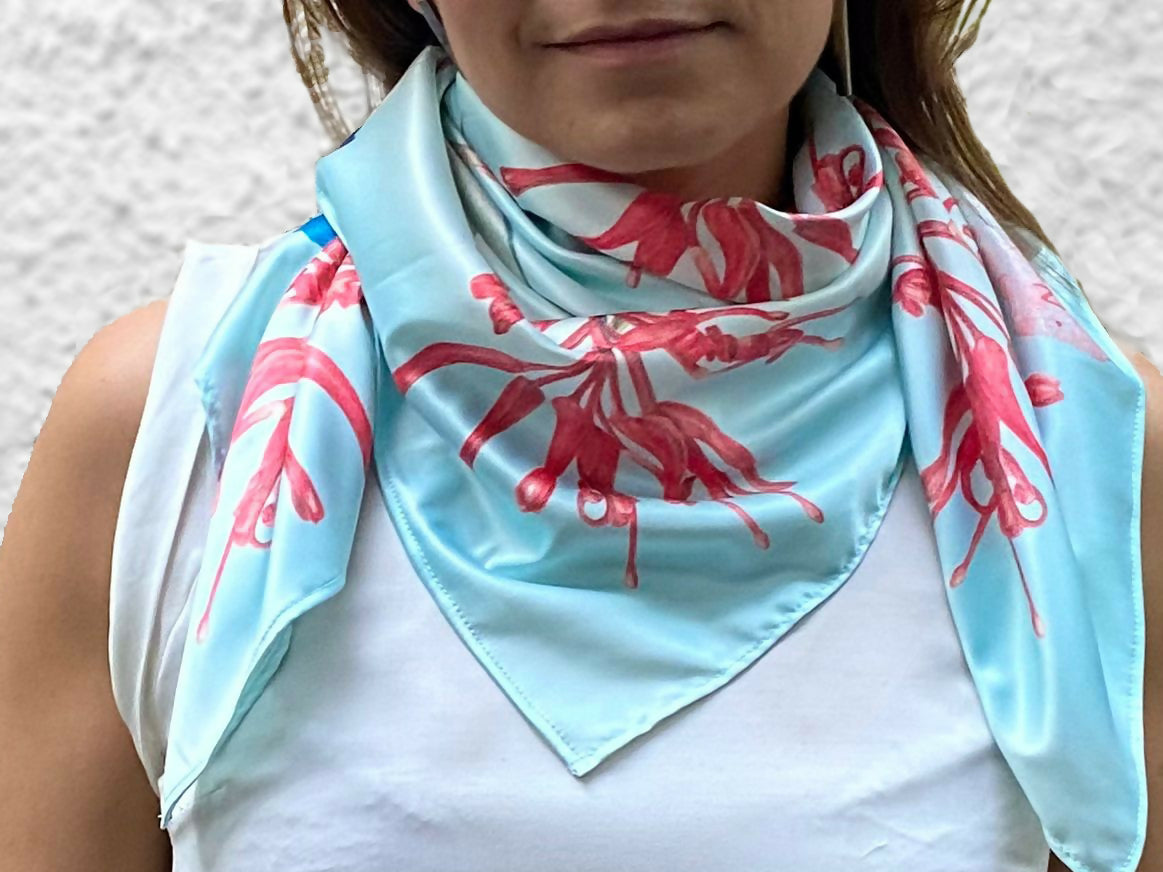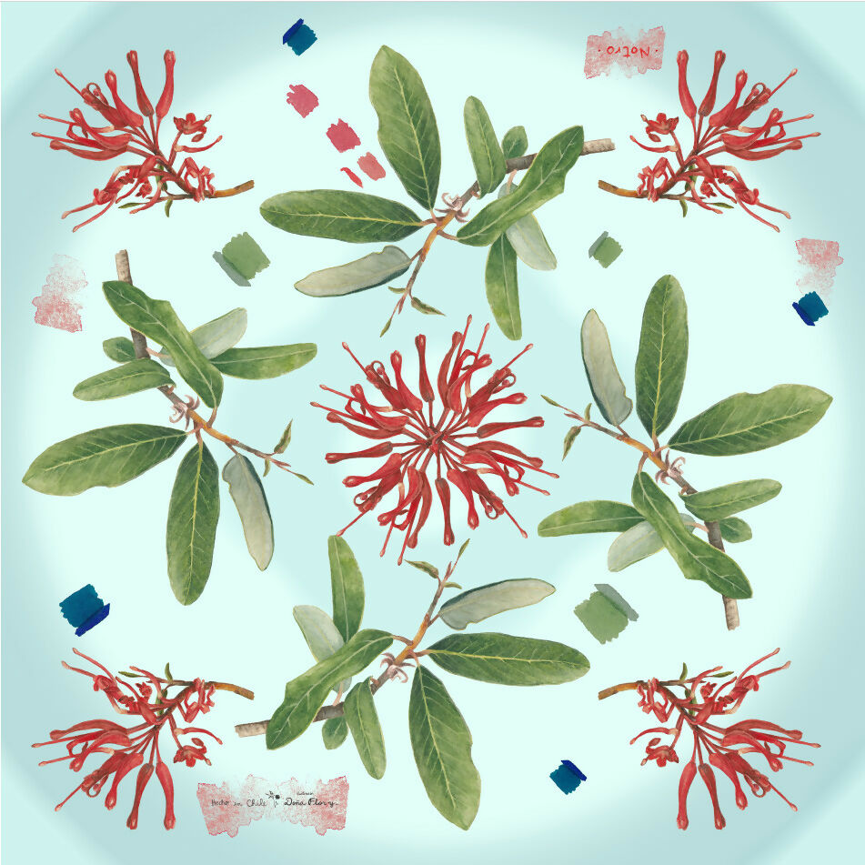 Pañuelo con ilustraciones flora nativa chilena pintadas por Luz María García.