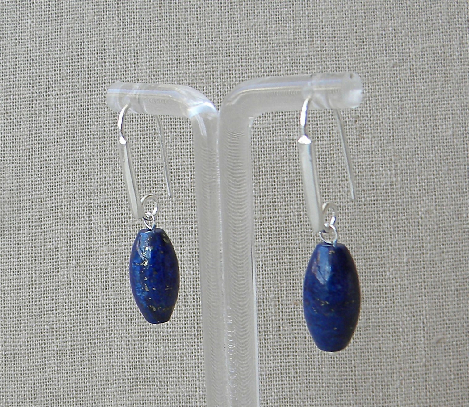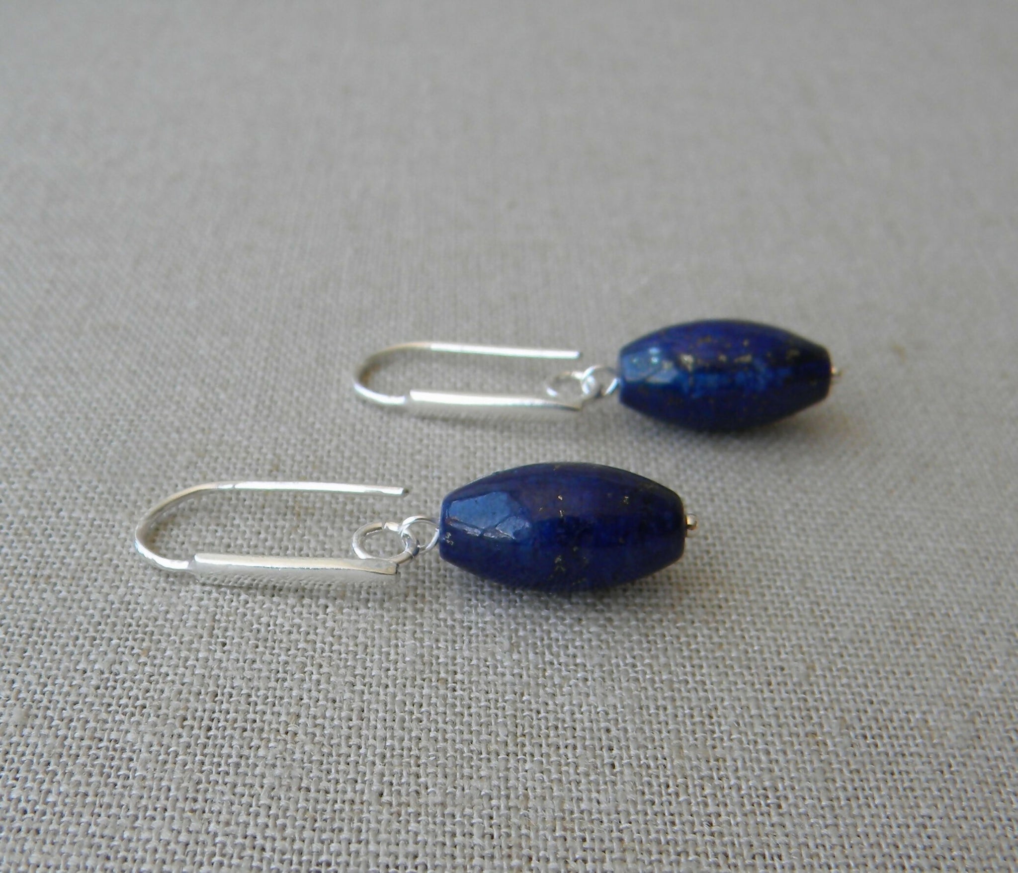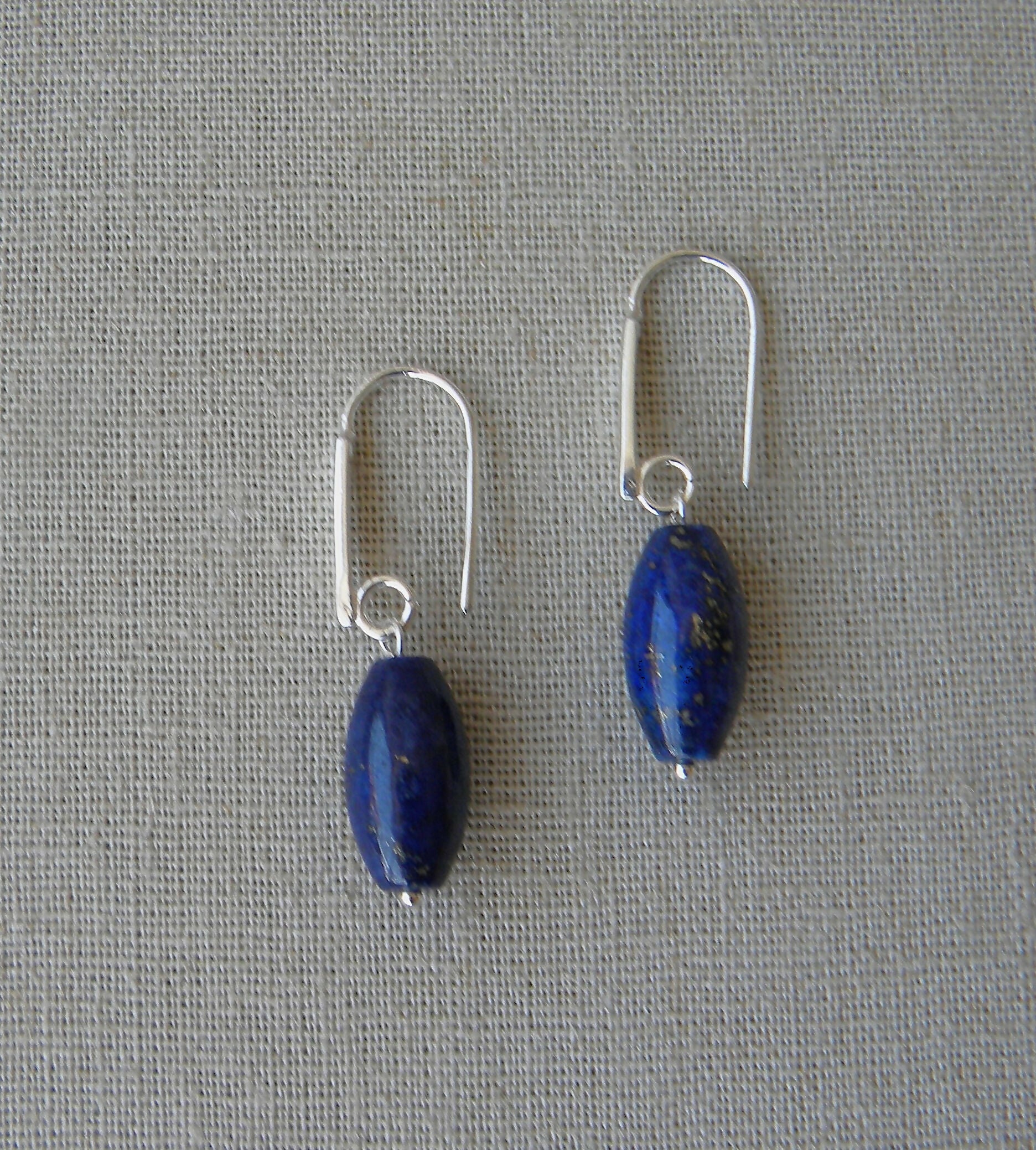 Son aros largos con una base en plata 950 en forma de gancho recto, muy fácil de poner y sacar, donde cuelga un lapislázuli grande en forma de barril.