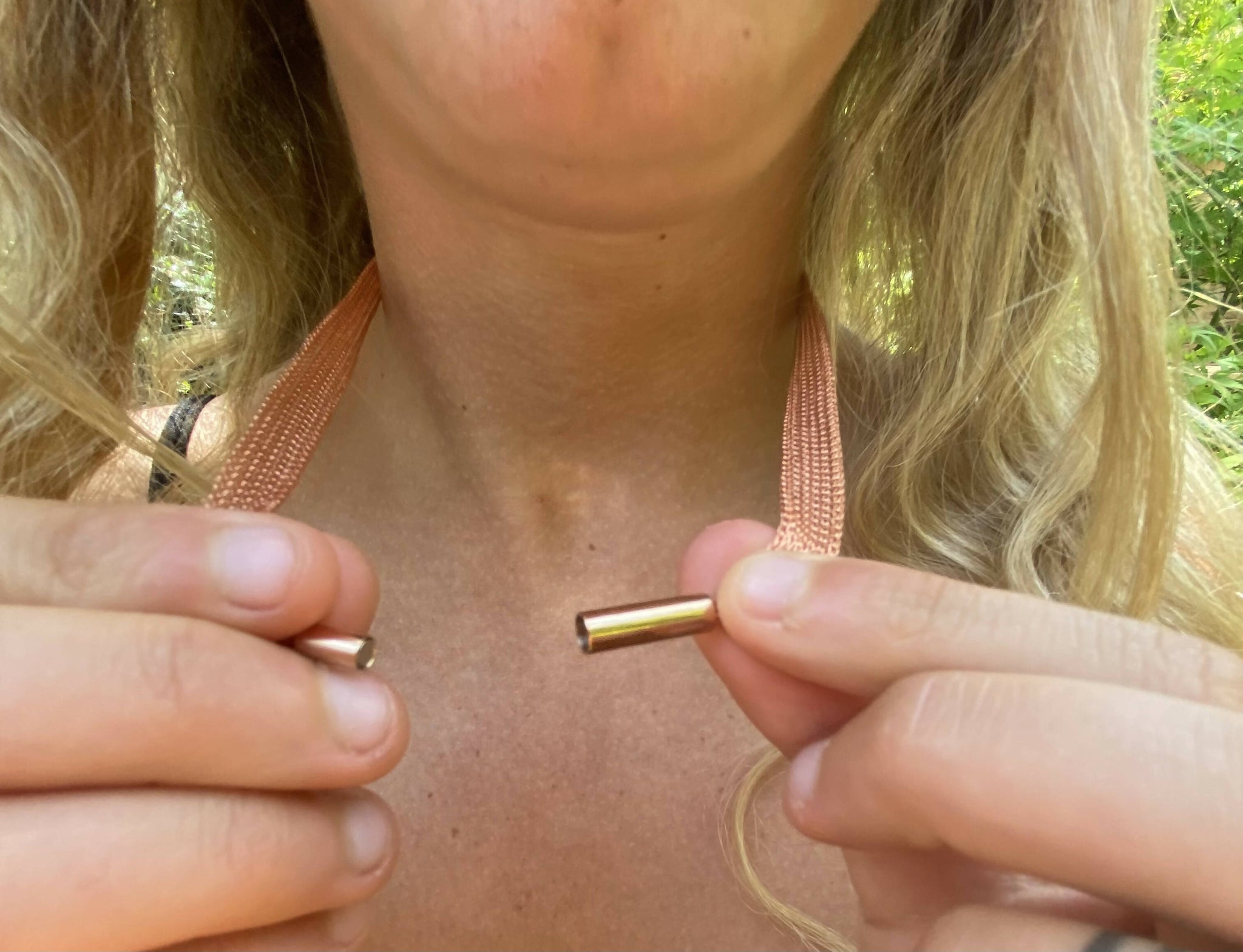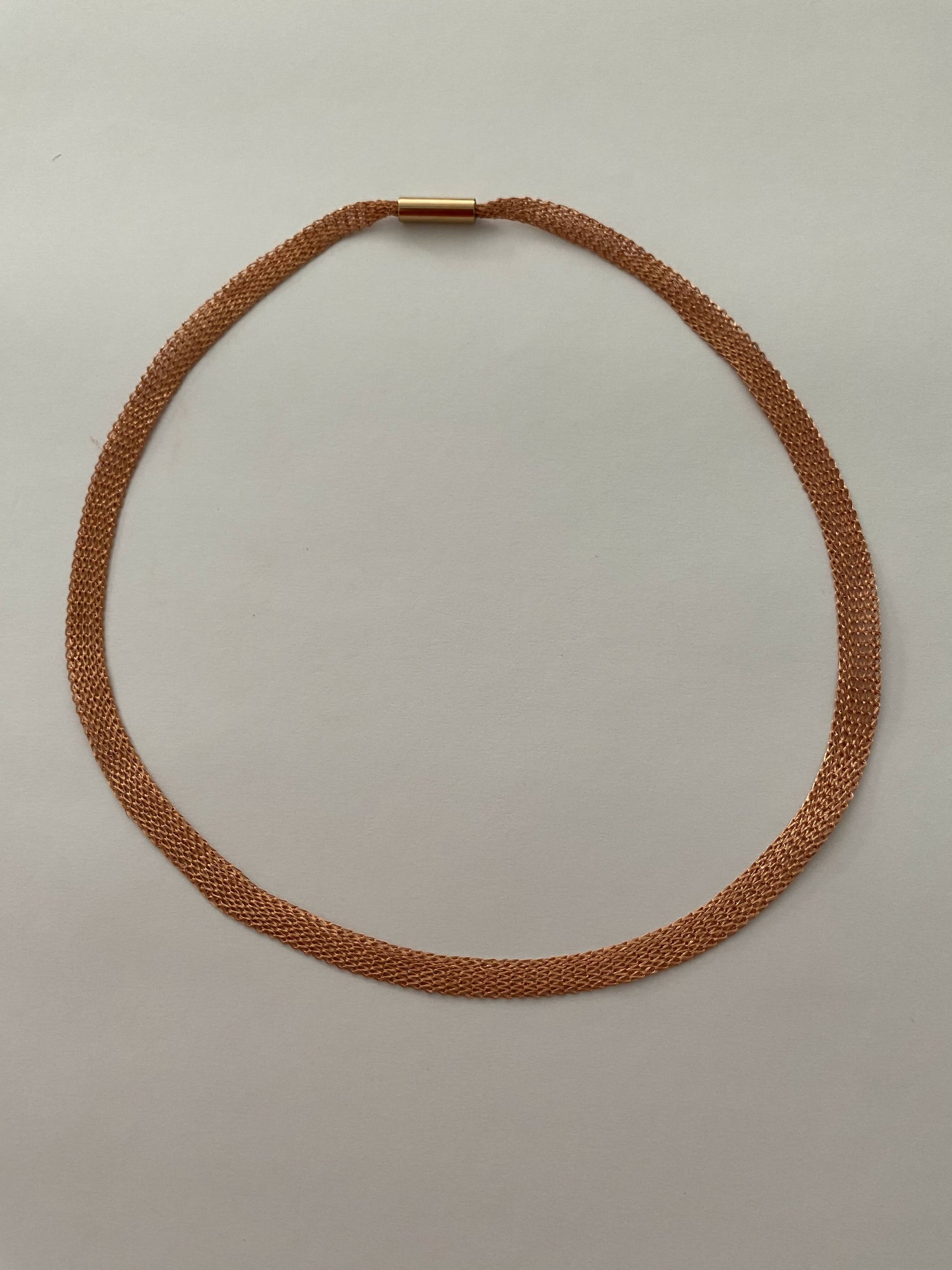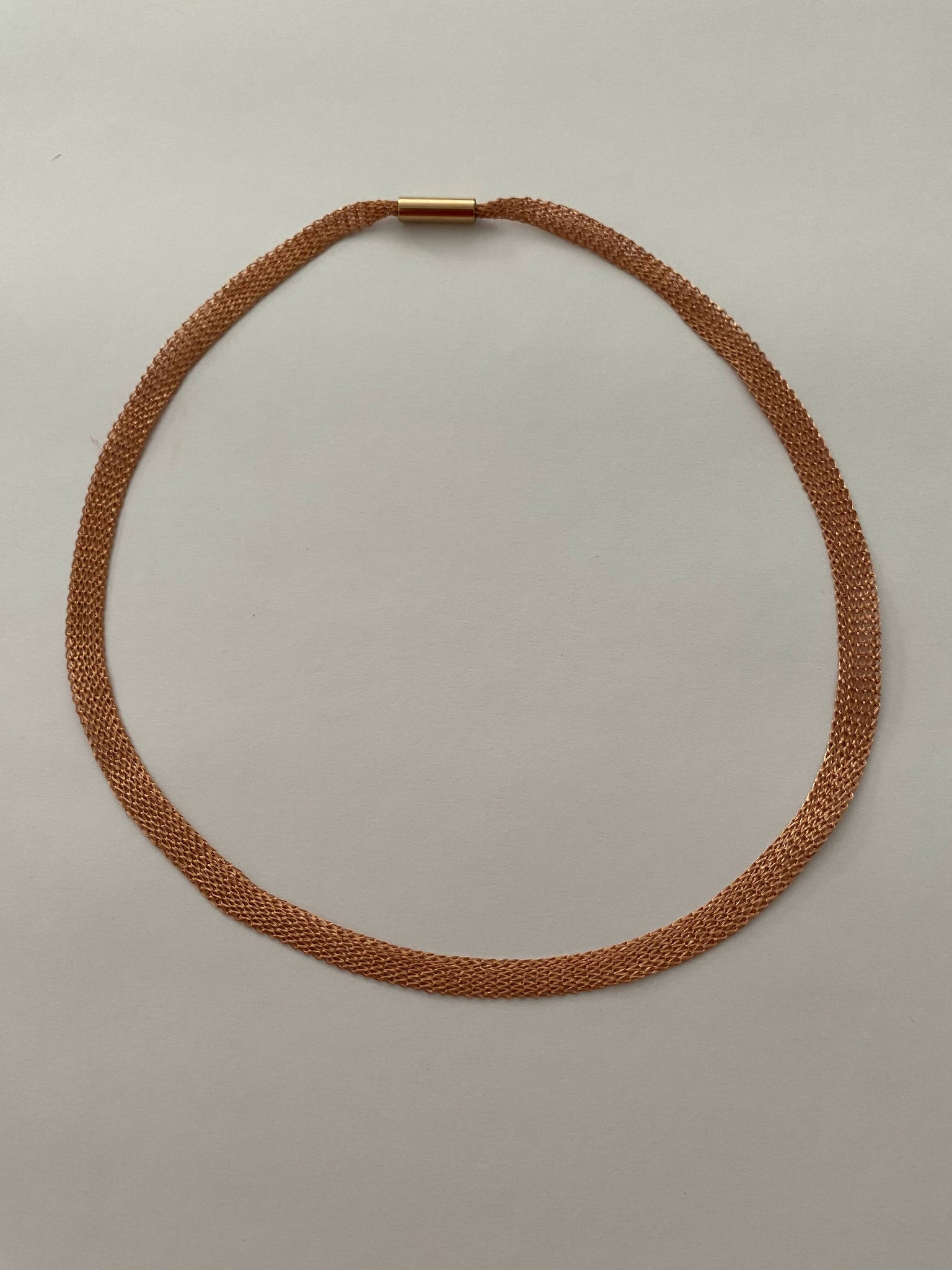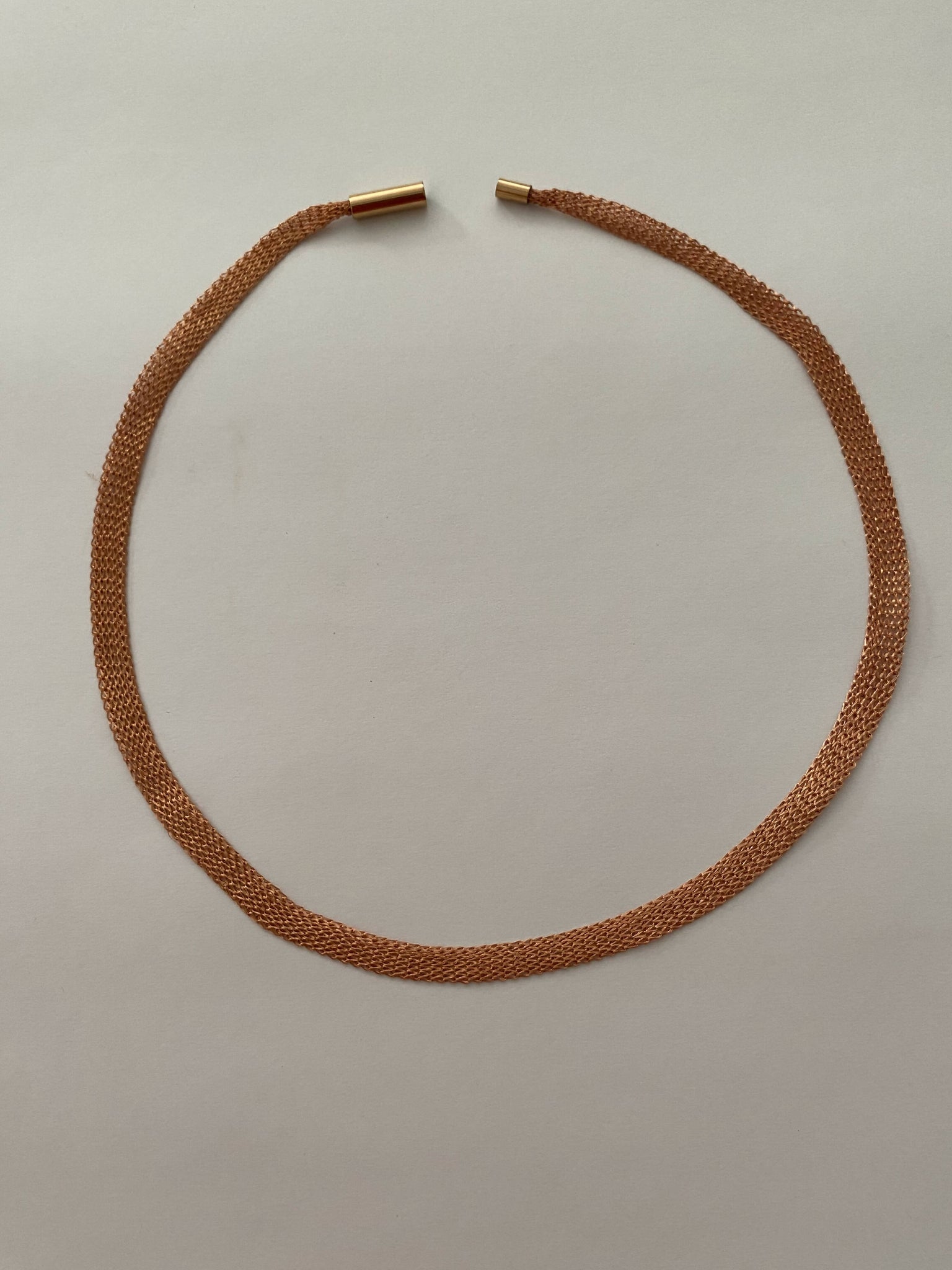 Collar plano tejido con filamentos de cobre esmaltado, broche imán dorado.
