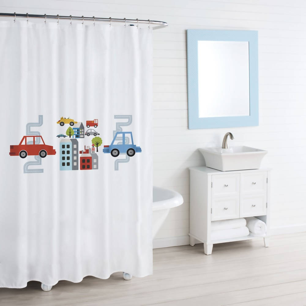 Cortina de Baño Stella elaborada en algodón blanco 180 x 180 cm. Parte superior reforzada con 12 ojales.