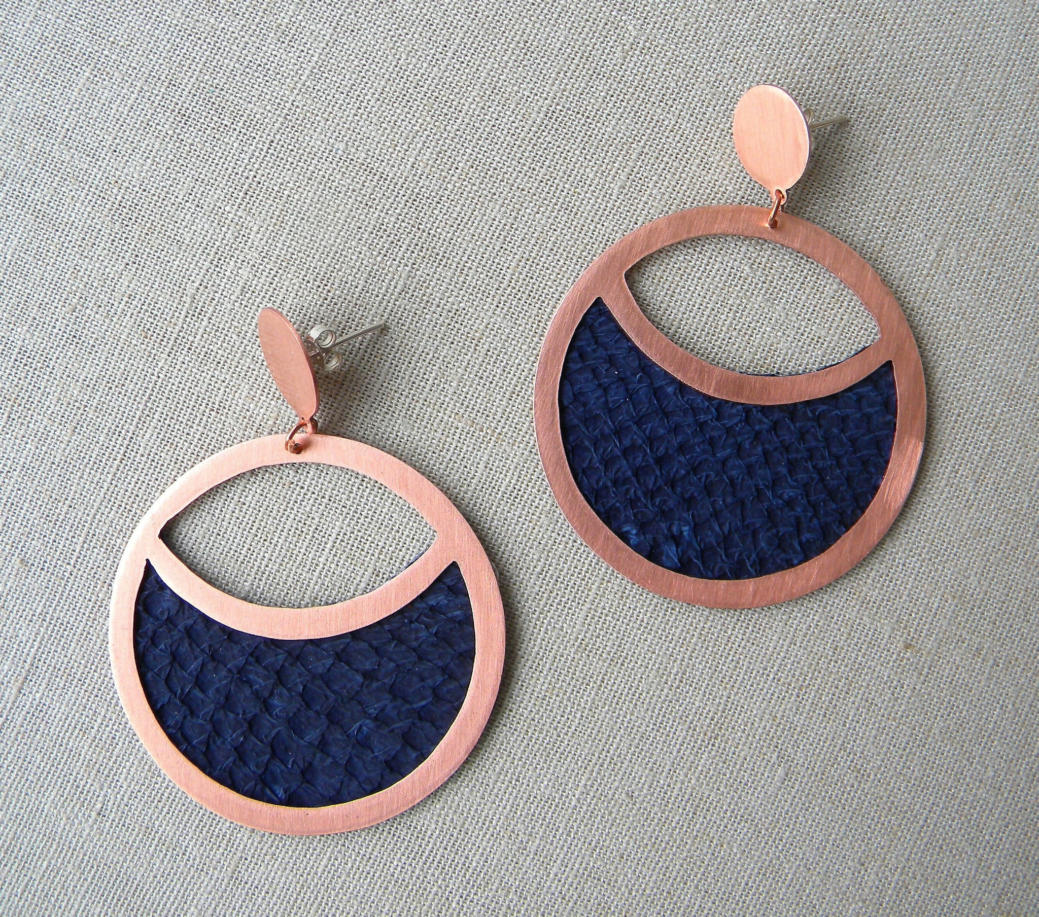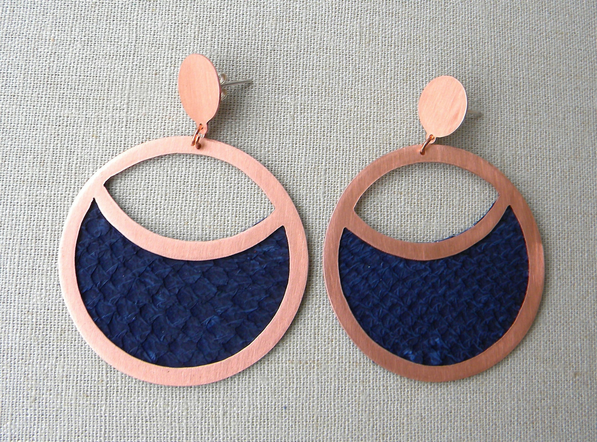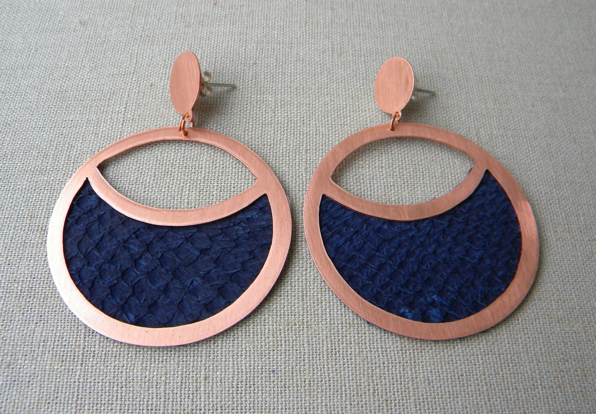 Estos aros de cobre con cuero de salmón teñido azul, son una pieza que representan a nuestro país ya que Chile es uno de los mayores exportadores de cobre y salmón del mundo.
