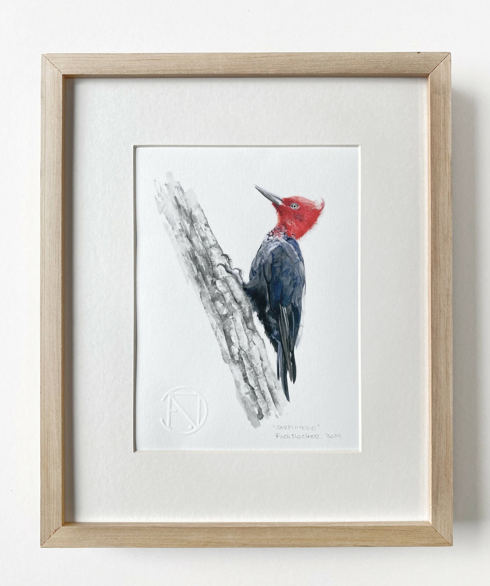 Ilustración del ave chileno, Carpintero Cabeza Roja que forma parte de la colección en acuarela de Aves Nativas de Daniela Fuchslocher.