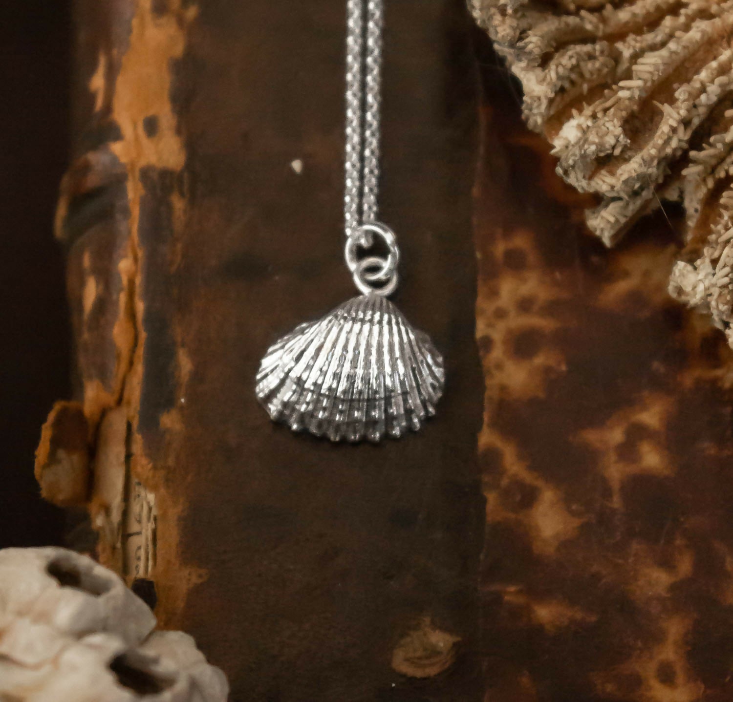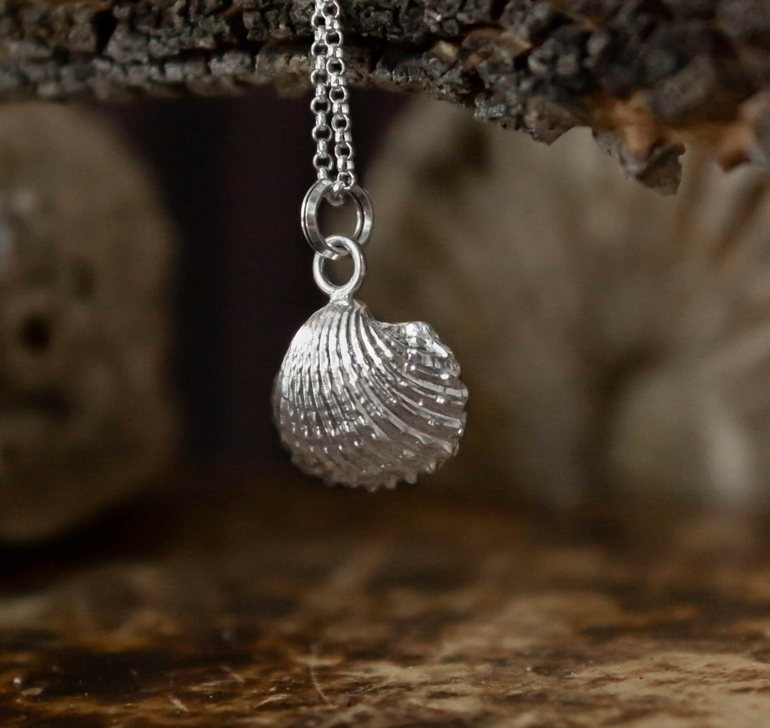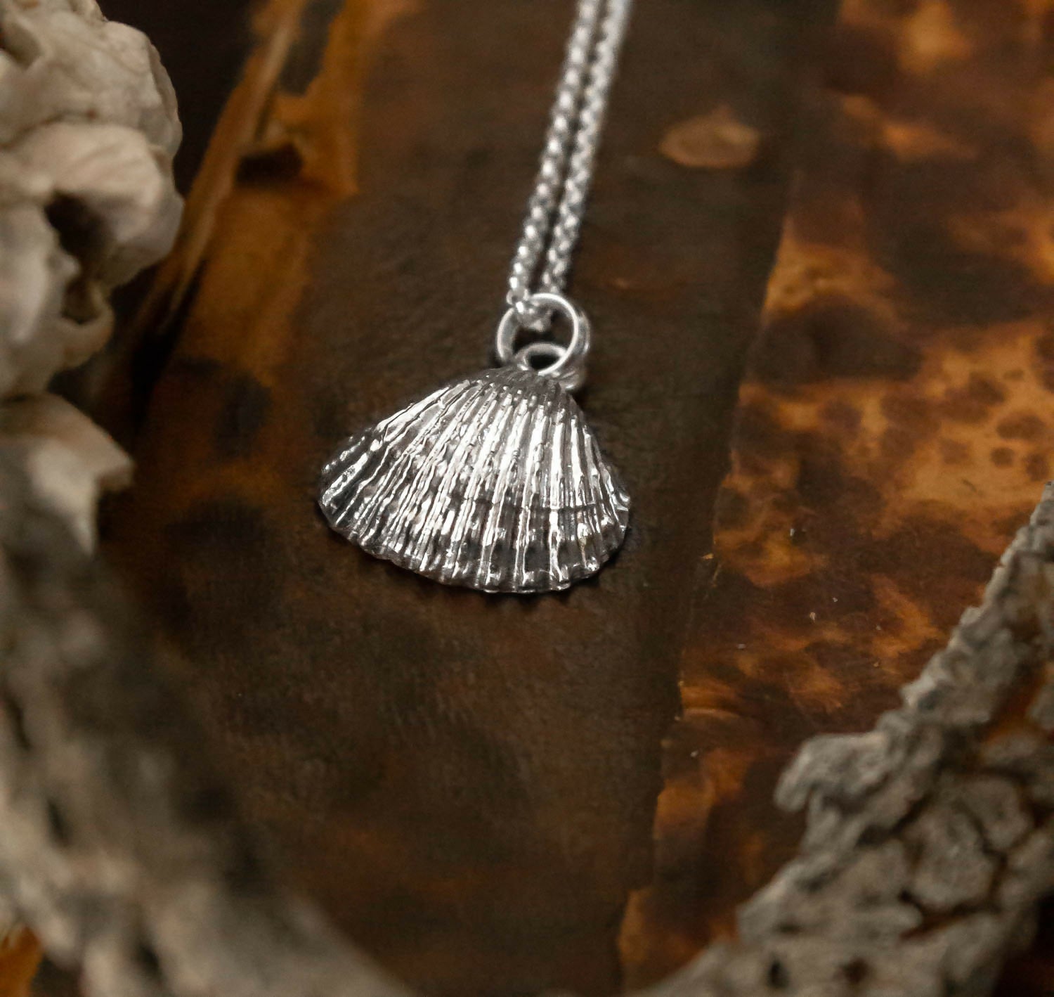 Colgante de conchita tipo almeja. Pertenece a la Serie Marina, fabricado con la técnica de casting orgánico, donde se parte de la matriz de la concha real, hecho en plata 950.
