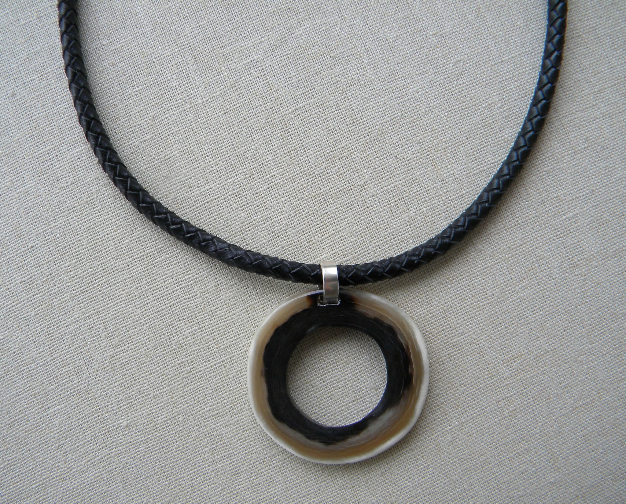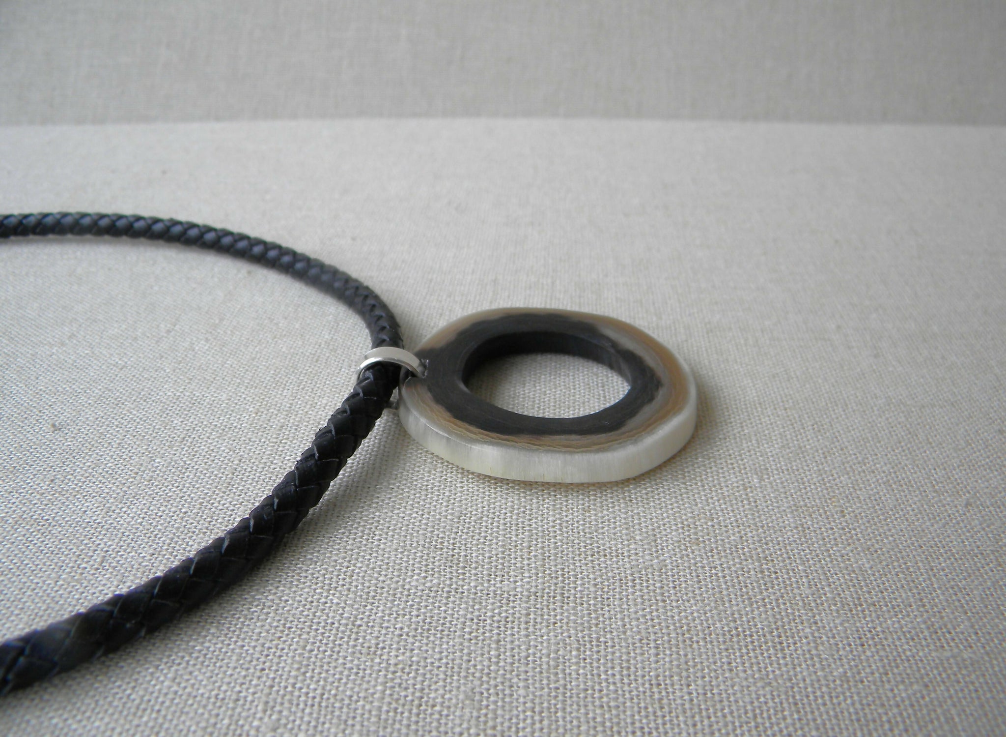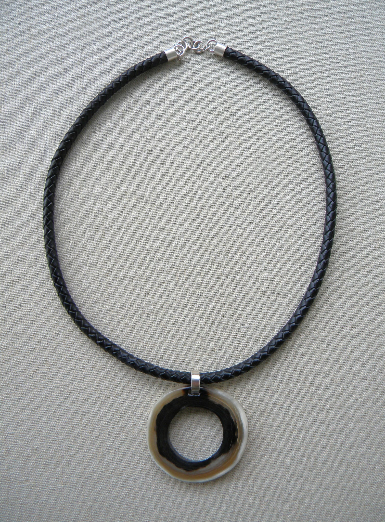 Está hecho con un cordón de cuero natural trenzado color negro con terminales de plata 950 y colgante de argolla de cuerno de vaca en tonos negro, beige y blanco de 5cm de largo. Tiene una cinta de plata gruesa entre el cordón y el cuerno.