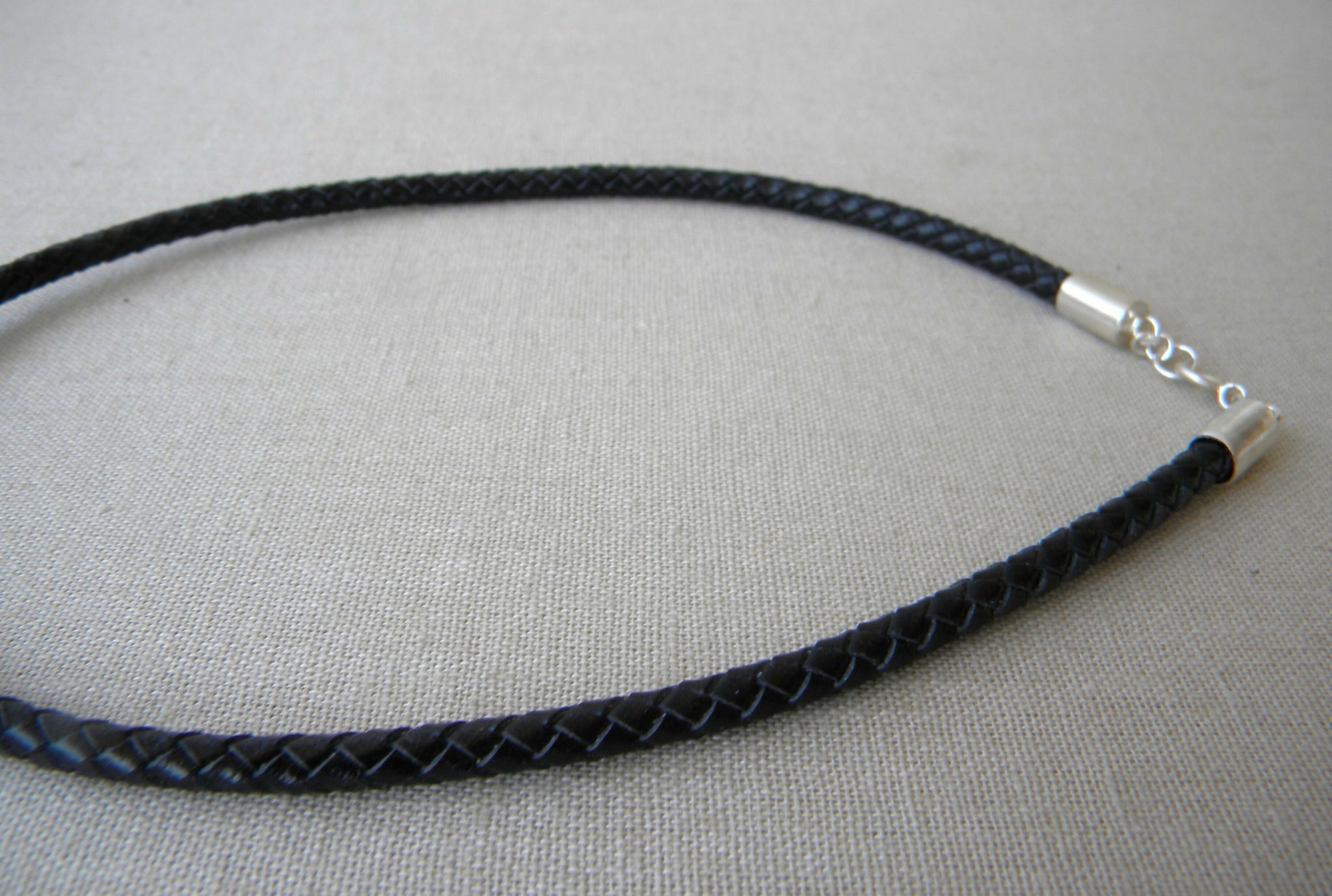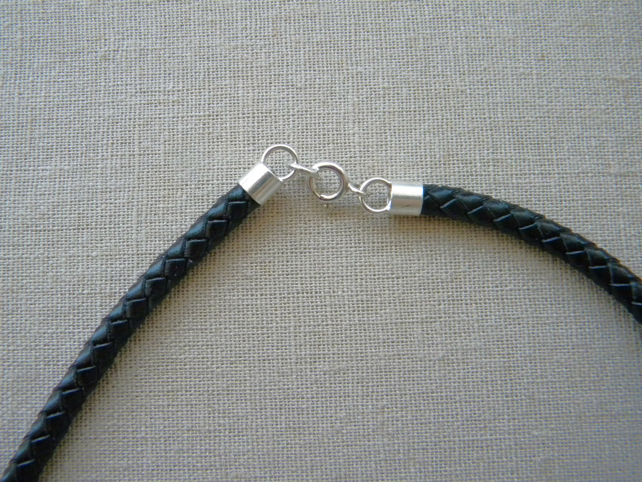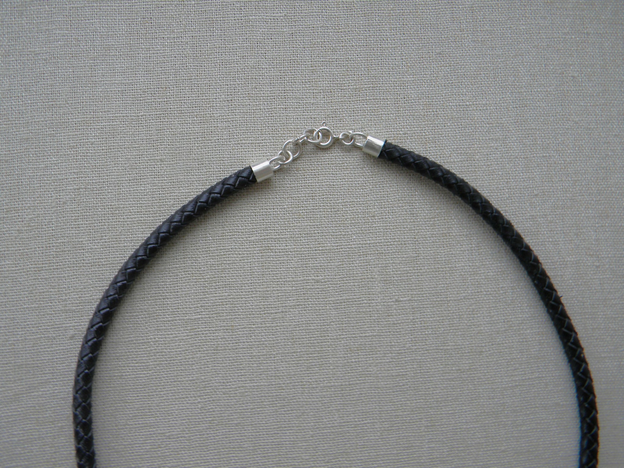 Está hecho con un cordón de cuero natural trenzado color negro con terminales de plata 950 y colgante de argolla de cuerno de vaca en tonos negro, beige y blanco de 5cm de largo. Tiene una cinta de plata gruesa entre el cordón y el cuerno.