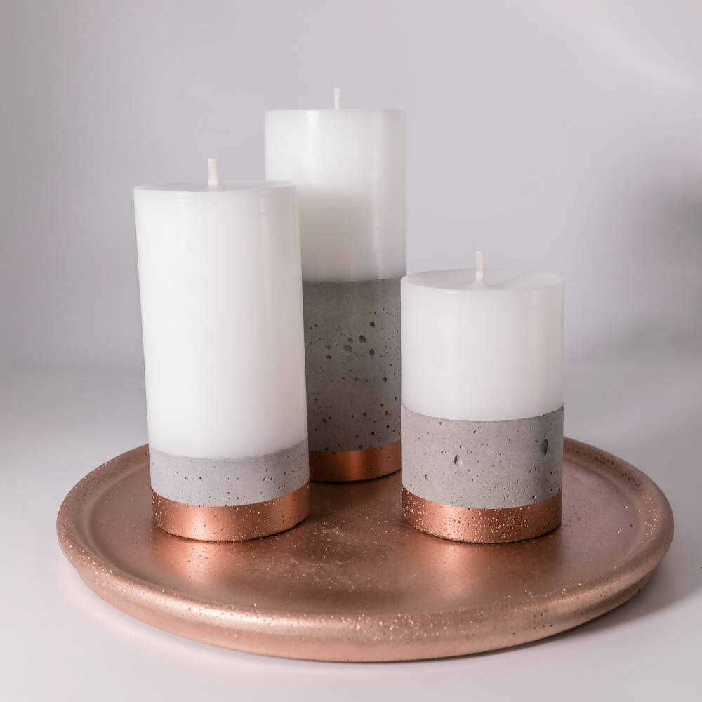 Conjunto de velas con base de Hormigón y línea cobre en bandeja de hormigón color cobre. Productos 100% hechos a mano en Chile, súper decorativos y de muy buena calidad, los fabricamos con los mejores materiales para lograrlo. Perfecto para hacer un lindo y original regalo, para la decoración de los diferentes espacios de tu hogar ( jardín, terraza, mesa de centro, arrimo, etc...), o para lograr un momento acogedor con la rica luz de las velas.