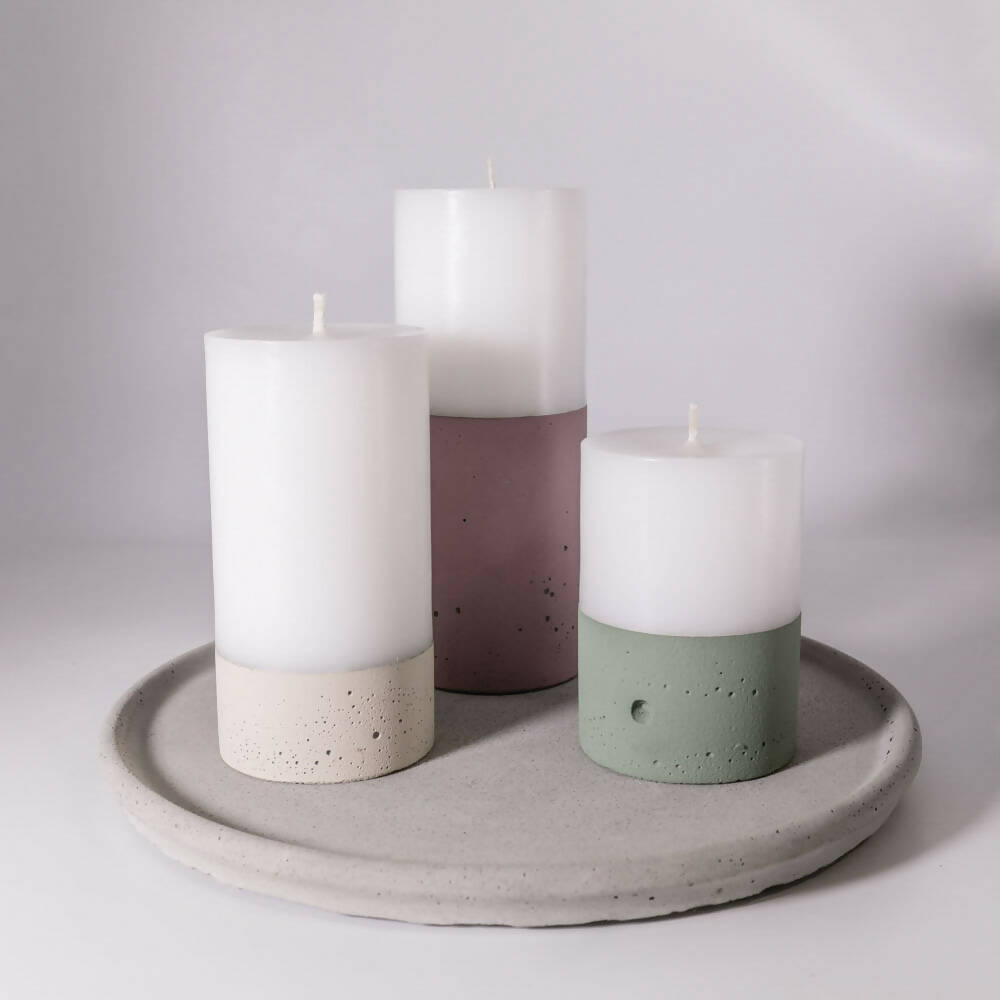 Conjunto de velas con base de Hormigón en tonos tierra en bandeja de hormigón natural. Productos 100% hechos a mano en Chile, súper decorativos y de muy buena calidad, los fabricamos con los mejores materiales para lograrlo. Perfecto para hacer un lindo y original regalo, para la decoración de los diferentes espacios de tu hogar ( jardín, terraza, mesa de centro, arrimo, etc...), o para lograr un momento acogedor con la rica luz de las velas.