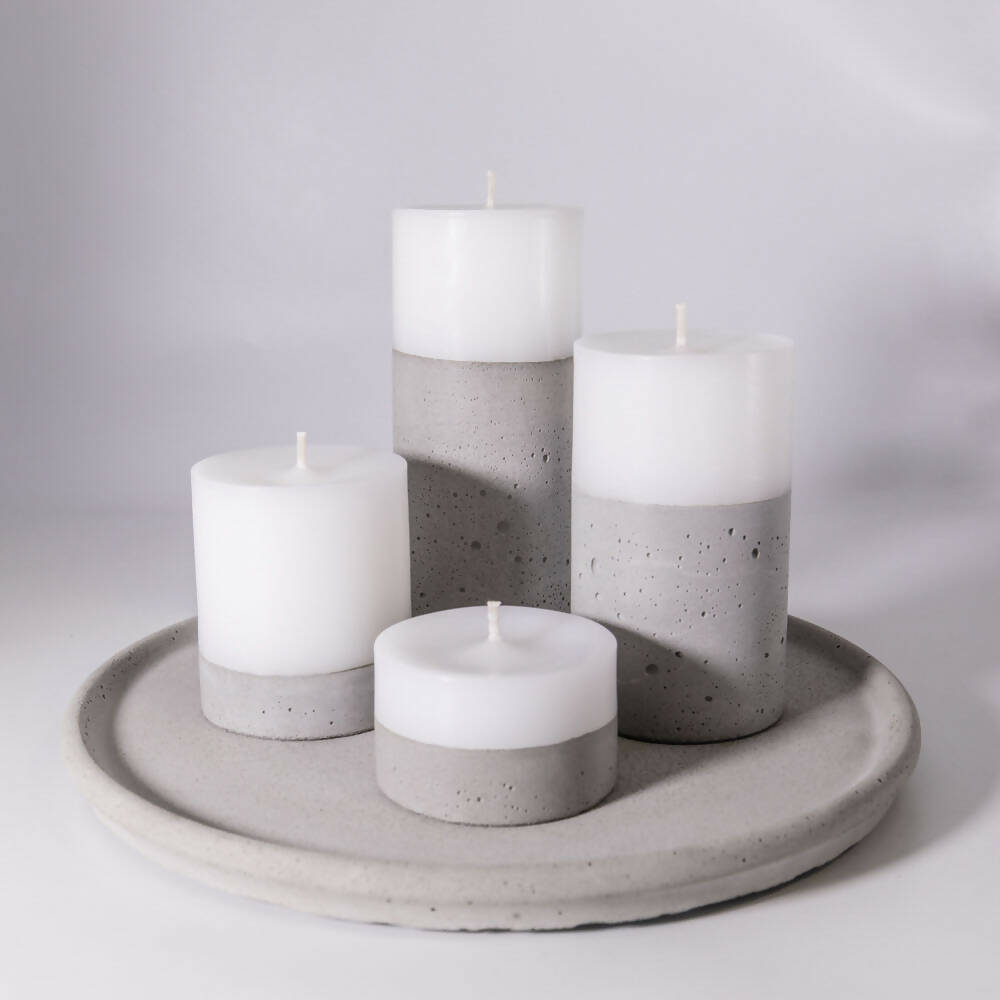Conjunto de velas con base de Hormigón Natural en bandeja de hormigón natural. Productos 100% hechos a mano en Chile, súper decorativos y de muy buena calidad, los fabricamos con los mejores materiales para lograrlo. Perfecto para hacer un lindo y original regalo, para la decoración de los diferentes espacios de tu hogar ( jardín, terraza, mesa de centro, arrimo, etc...), o para lograr un momento acogedor con la rica luz de las velas.