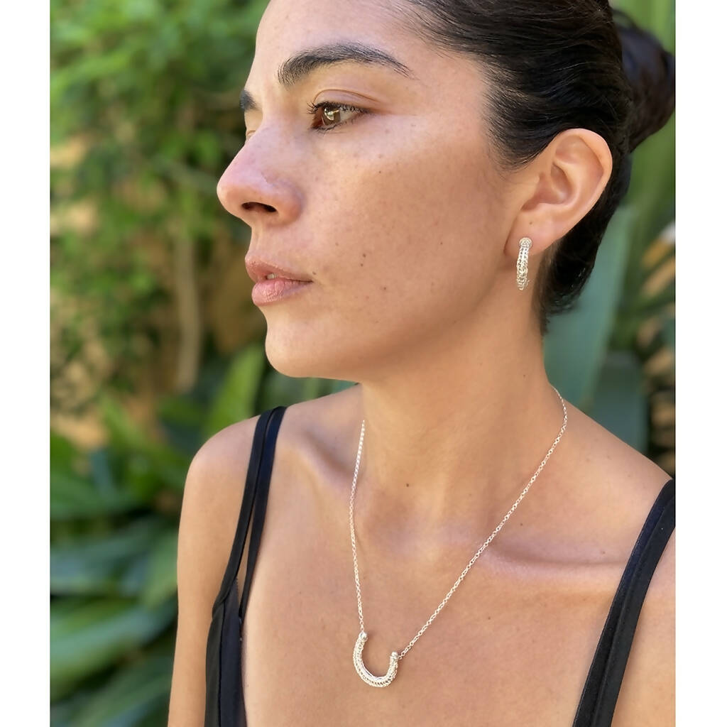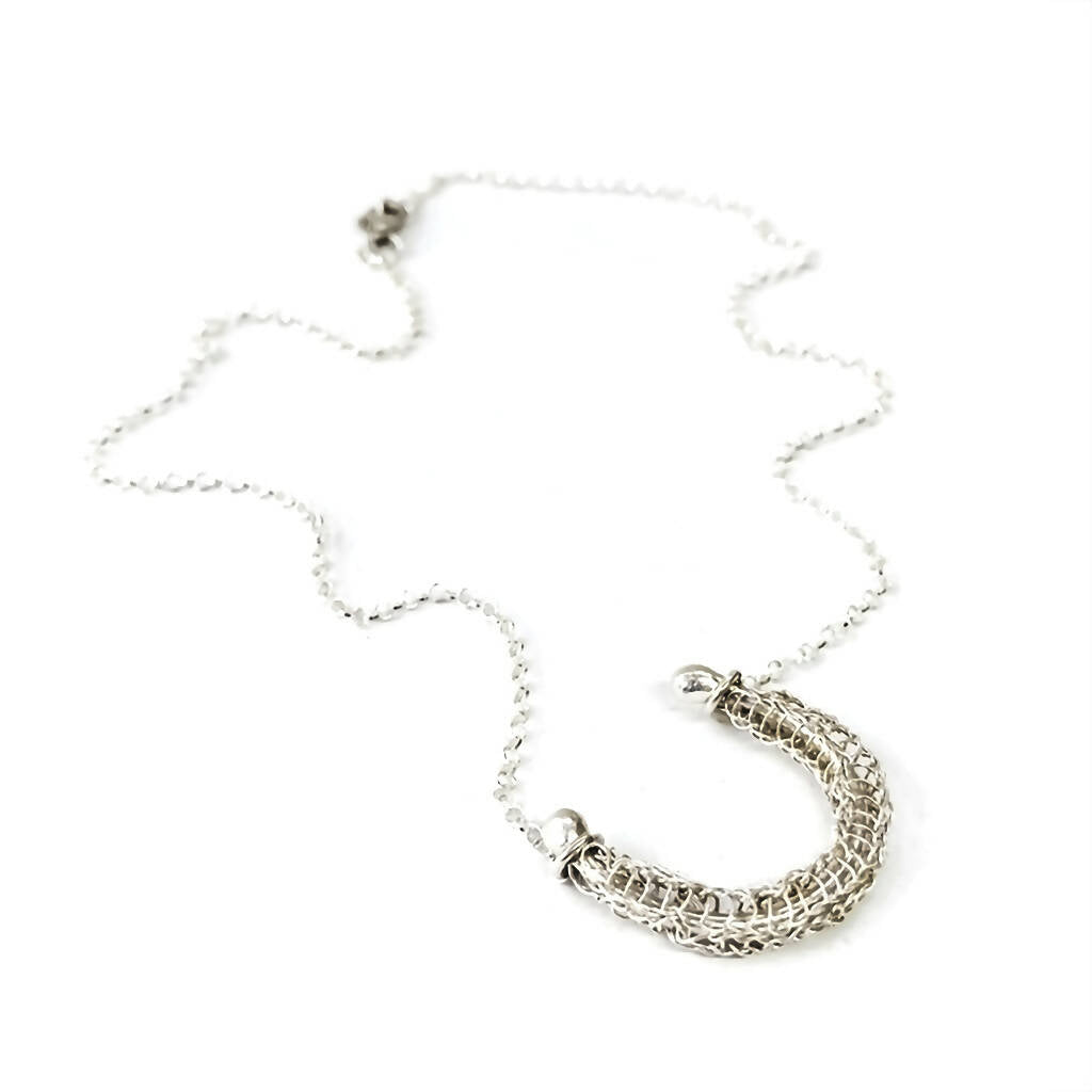 La pieza central está tejida en Plata pura, con estructura en plata 950, hecha a mano. Cadena y broche en Plata 950.