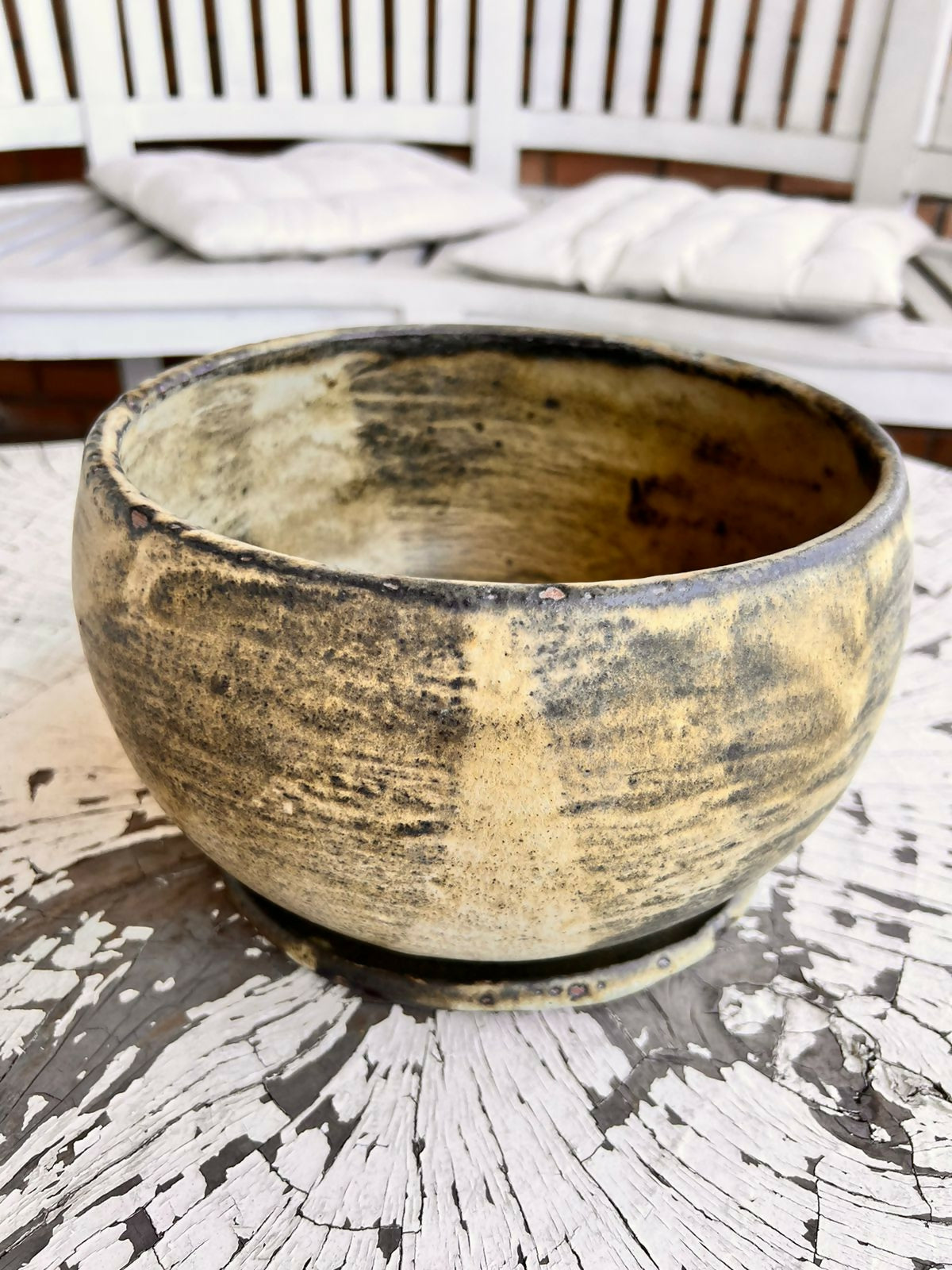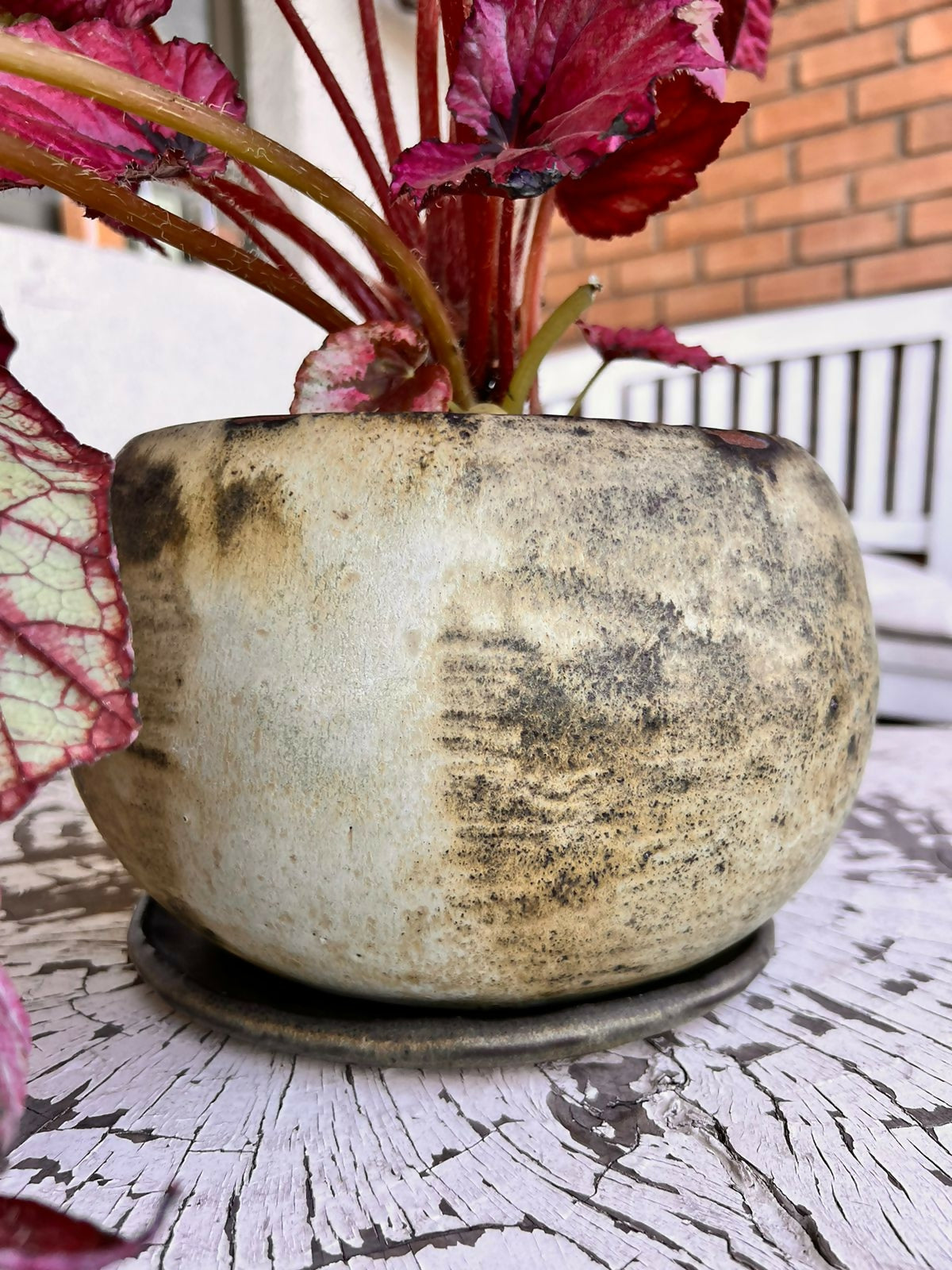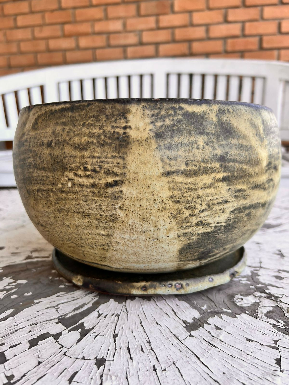 Lindo Macetero de bola materialidad ceramica gres, hecho a mano,  esmalte verdoso mate ideal para decorar espacios únicos y originales