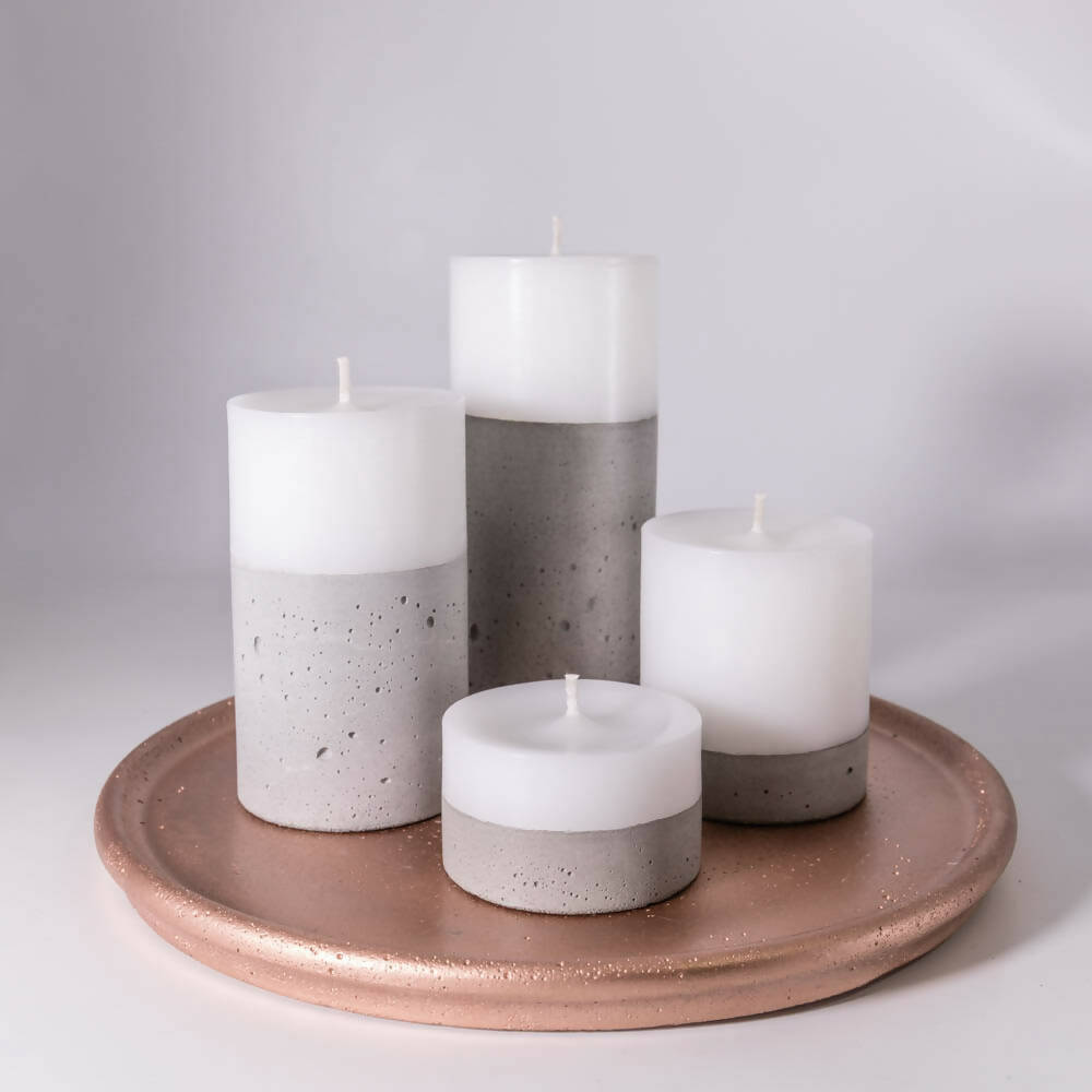 Conjunto de velas con base de Hormigón Natural en bandeja de hormigón color cobre. Productos 100% hechos a mano en Chile, súper decorativos y de muy buena calidad, los fabricamos con los mejores materiales para lograrlo. Perfecto para hacer un lindo y original regalo, para la decoración de los diferentes espacios de tu hogar ( jardín, terraza, mesa de centro, arrimo, etc...), o para lograr un momento acogedor con la rica luz de las velas.