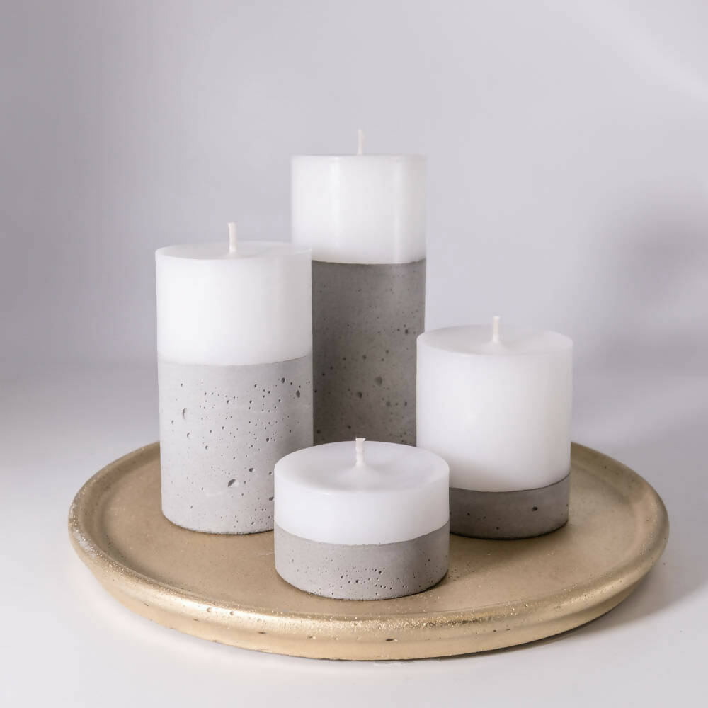 Conjunto de velas con base de Hormigón Natural en bandeja de hormigón color dorado. Productos 100% hechos a mano en Chile, súper decorativos y de muy buena calidad, los fabricamos con los mejores materiales para lograrlo. Perfecto para hacer un lindo y original regalo, para la decoración de los diferentes espacios de tu hogar ( jardín, terraza, mesa de centro, arrimo, etc...), o para lograr un momento acogedor con la rica luz de las velas.