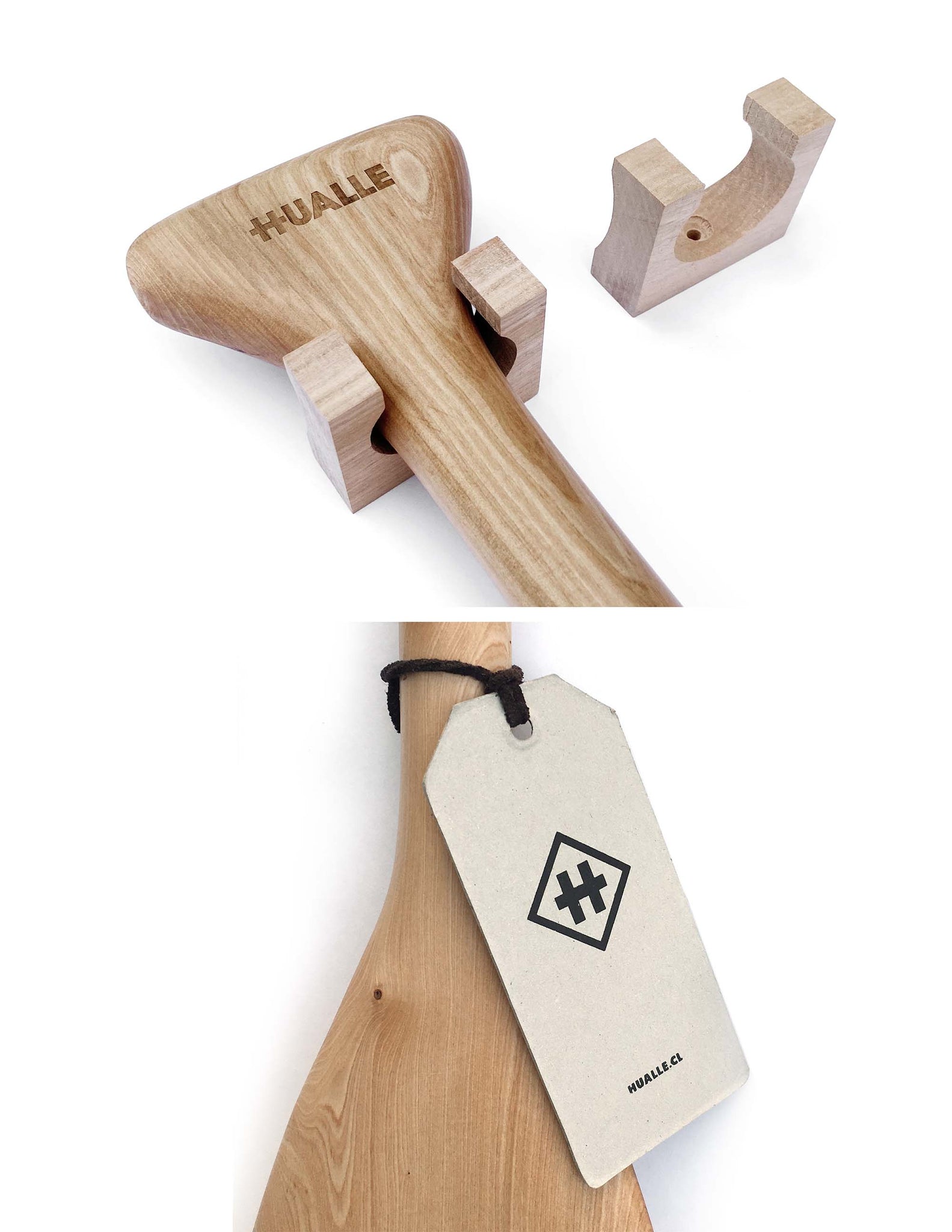 El diseño de este remo pintado representa la señal náutica "Juliett" y significa: Tengo un incendio y llevo mercancías peligrosas. Manténgase alejado. Cada pieza está hecha a partir de maderas recuperadas, entre las cuales destacan el Lingue, Mañío, Raulí y Radal.