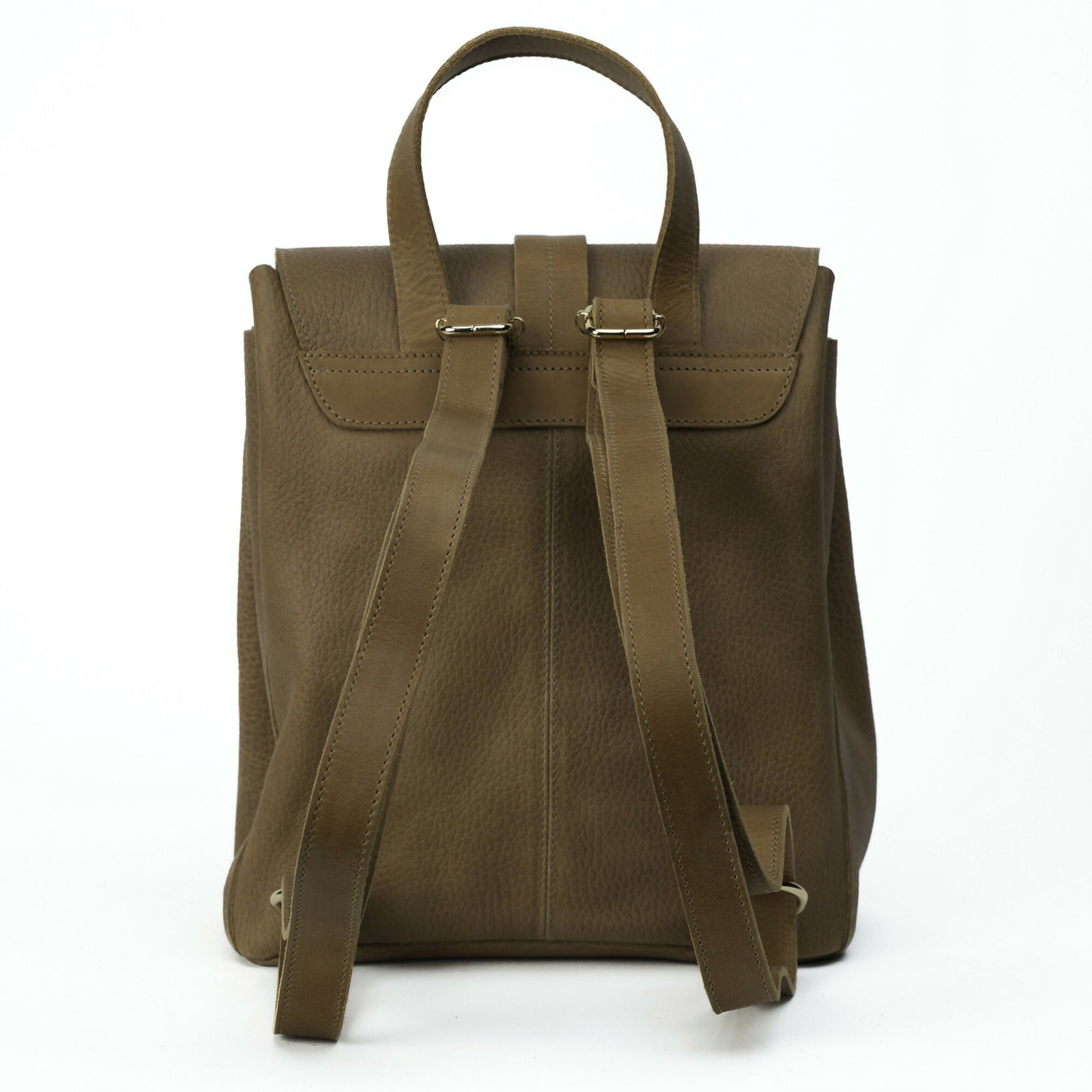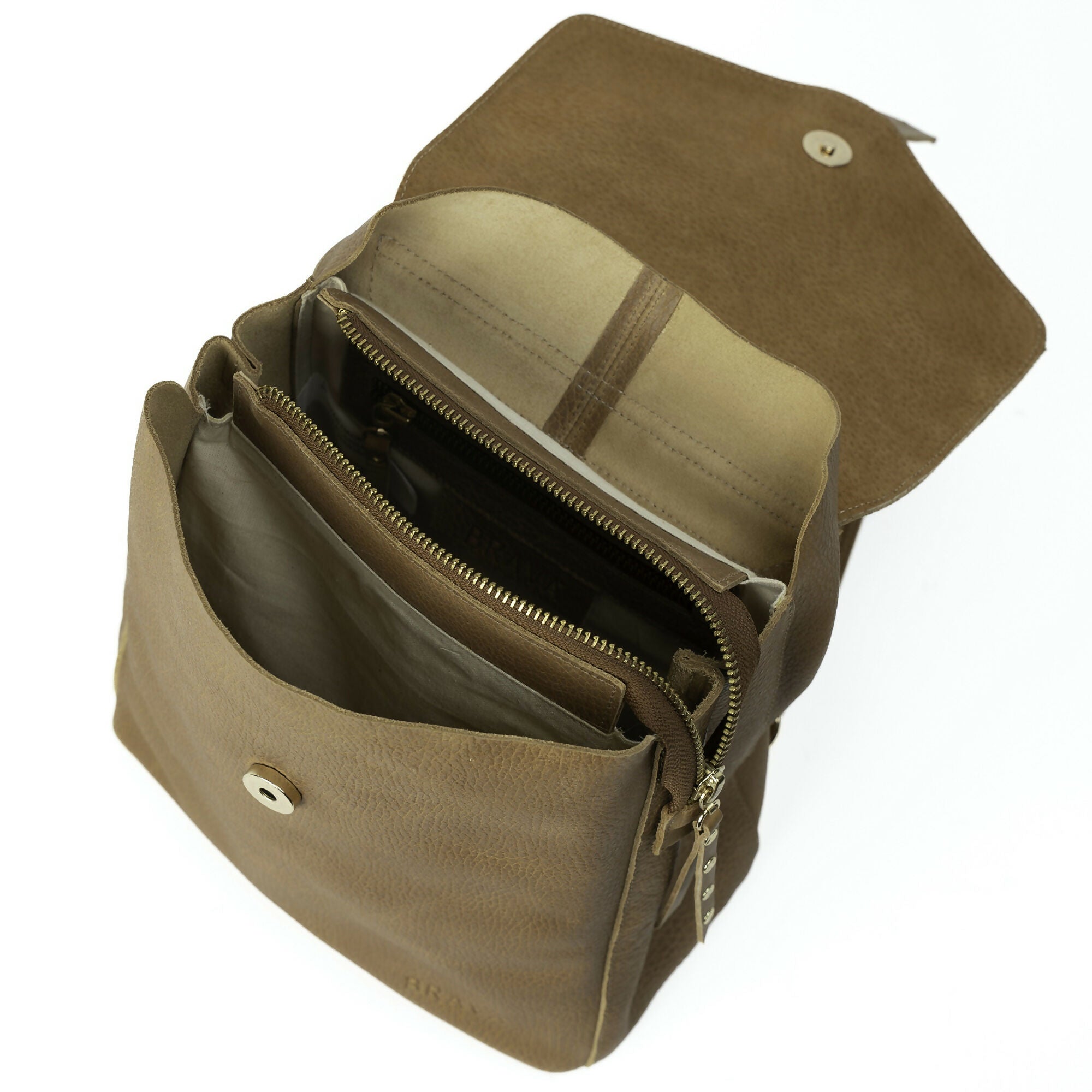 Posee tres compartimientos interiores, el compartimiento central es forrado con tela crea algodón, cuenta con bolsillo interior y cierre superior para resguardar tus esenciales. Adicionalmente cuenta con un broche magnético ubicado en la tapa. Posee 2 straps ajustables para cargarla en tu espalda o si prefieres puedes llevarla colgada en tu muñeca utilizando el asa superior.