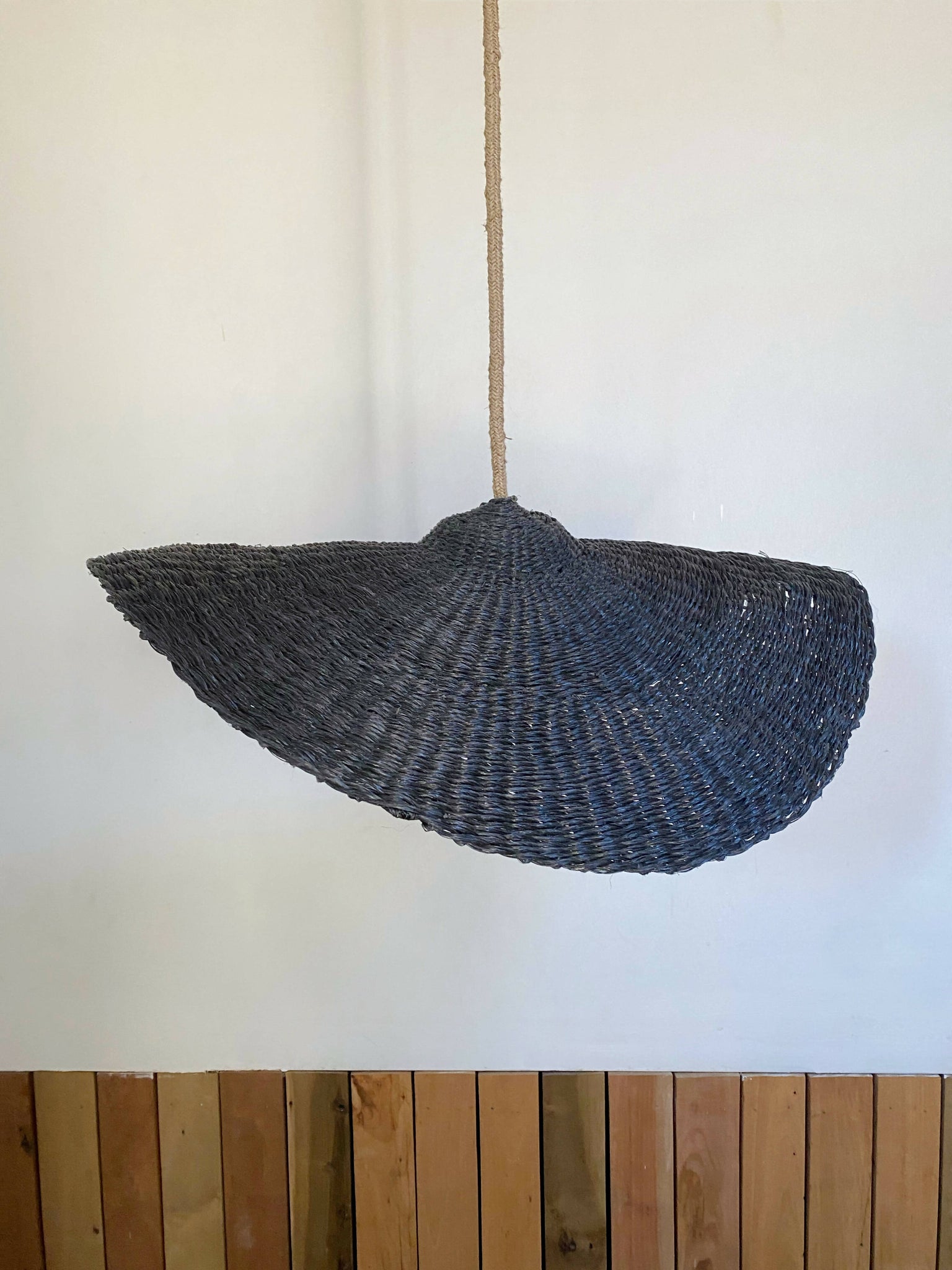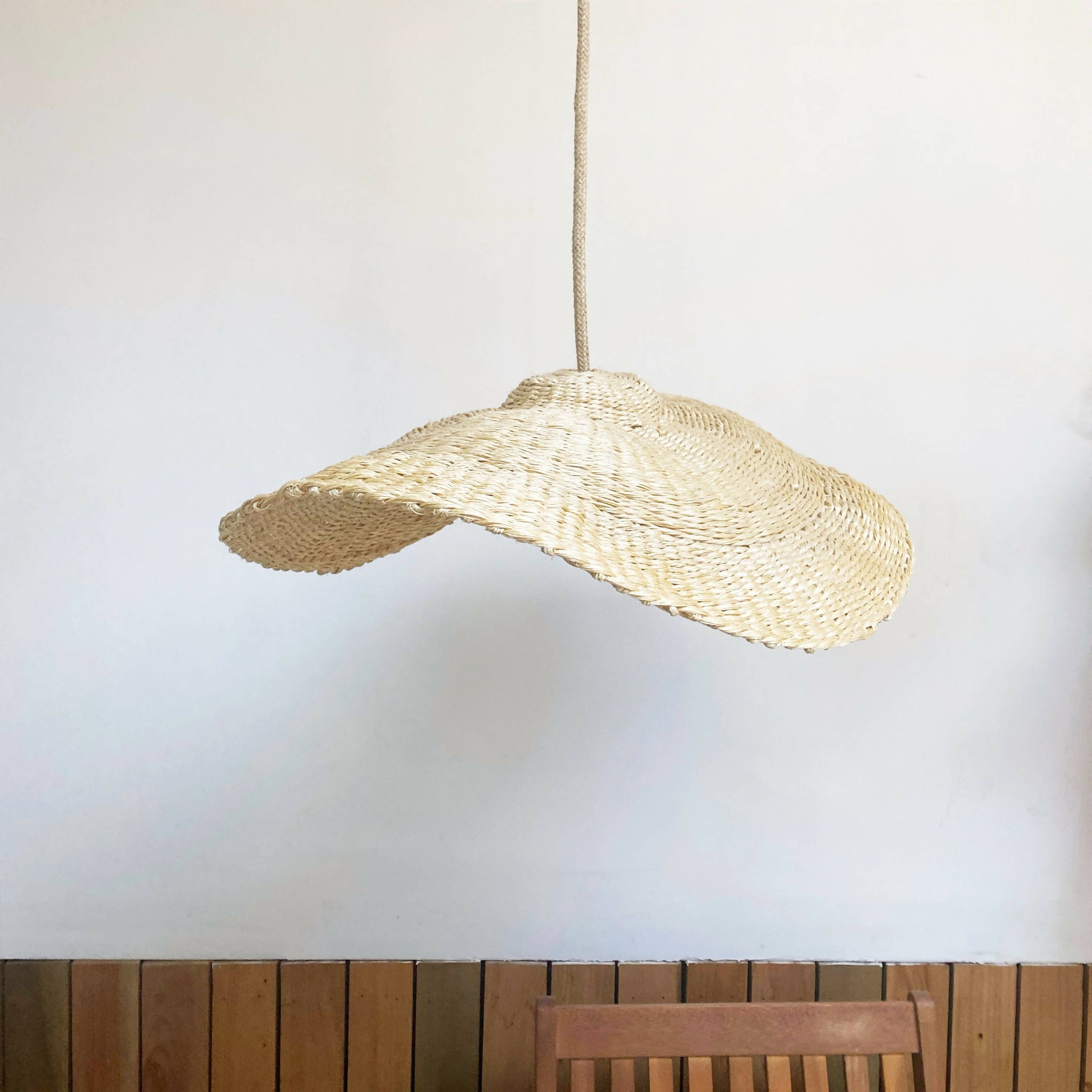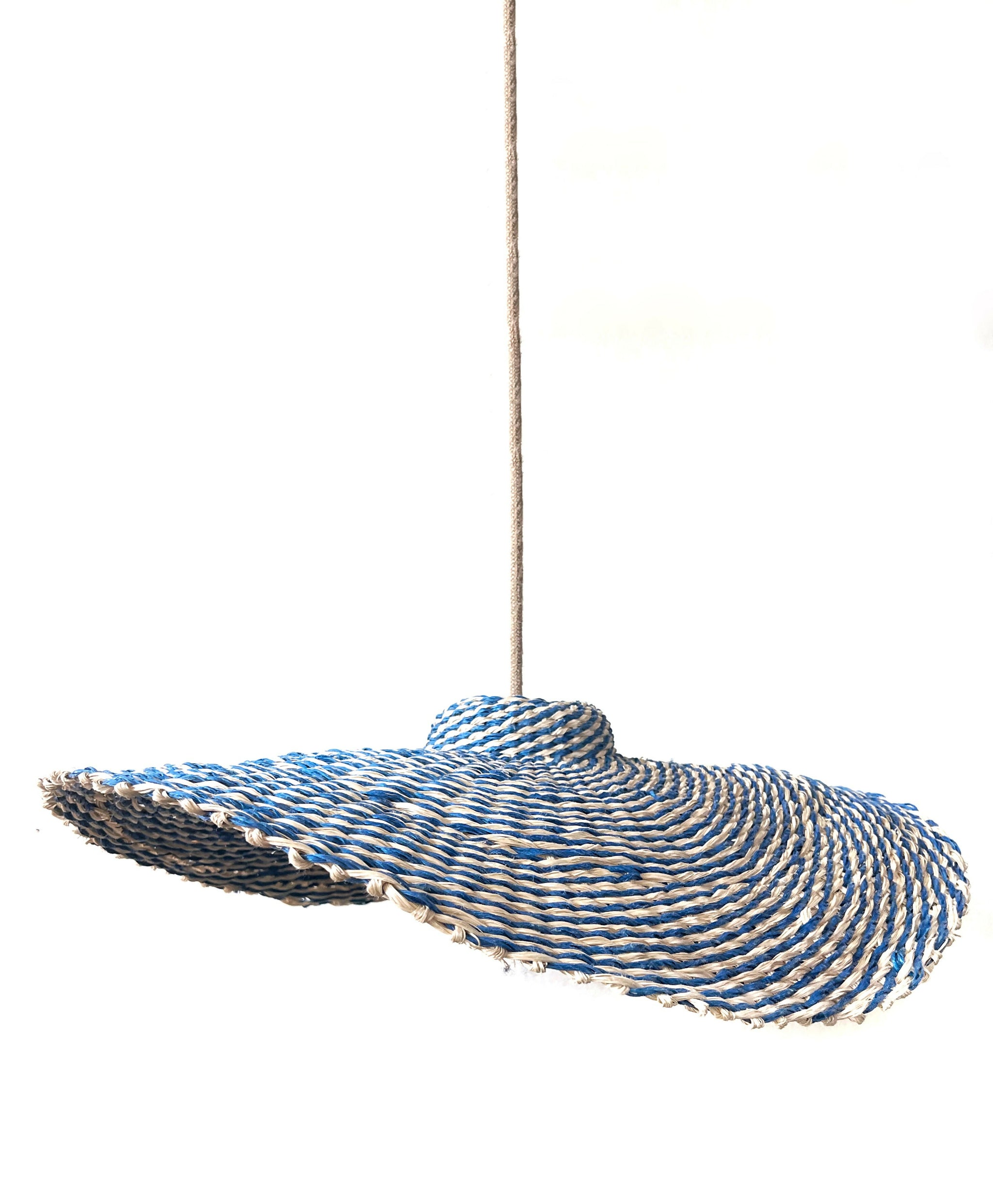 Viene con cable electrico recibierto en yute de 2, y soporte metalico blanco al techo.