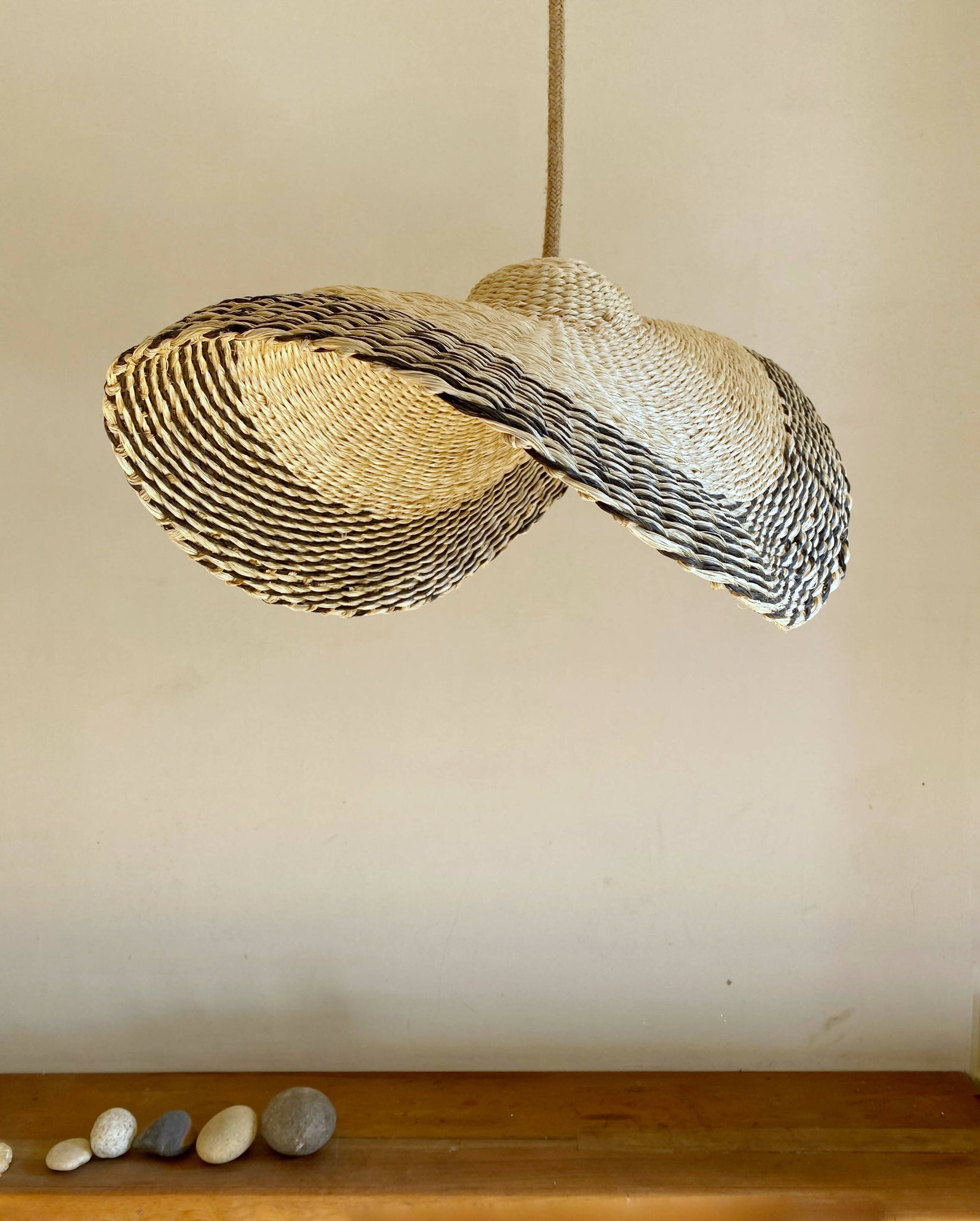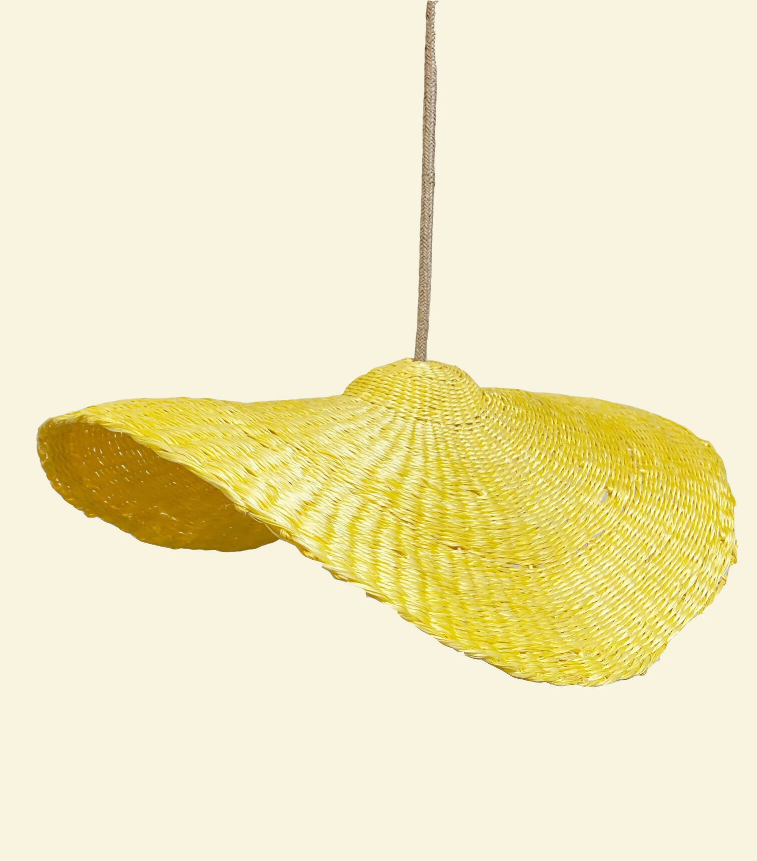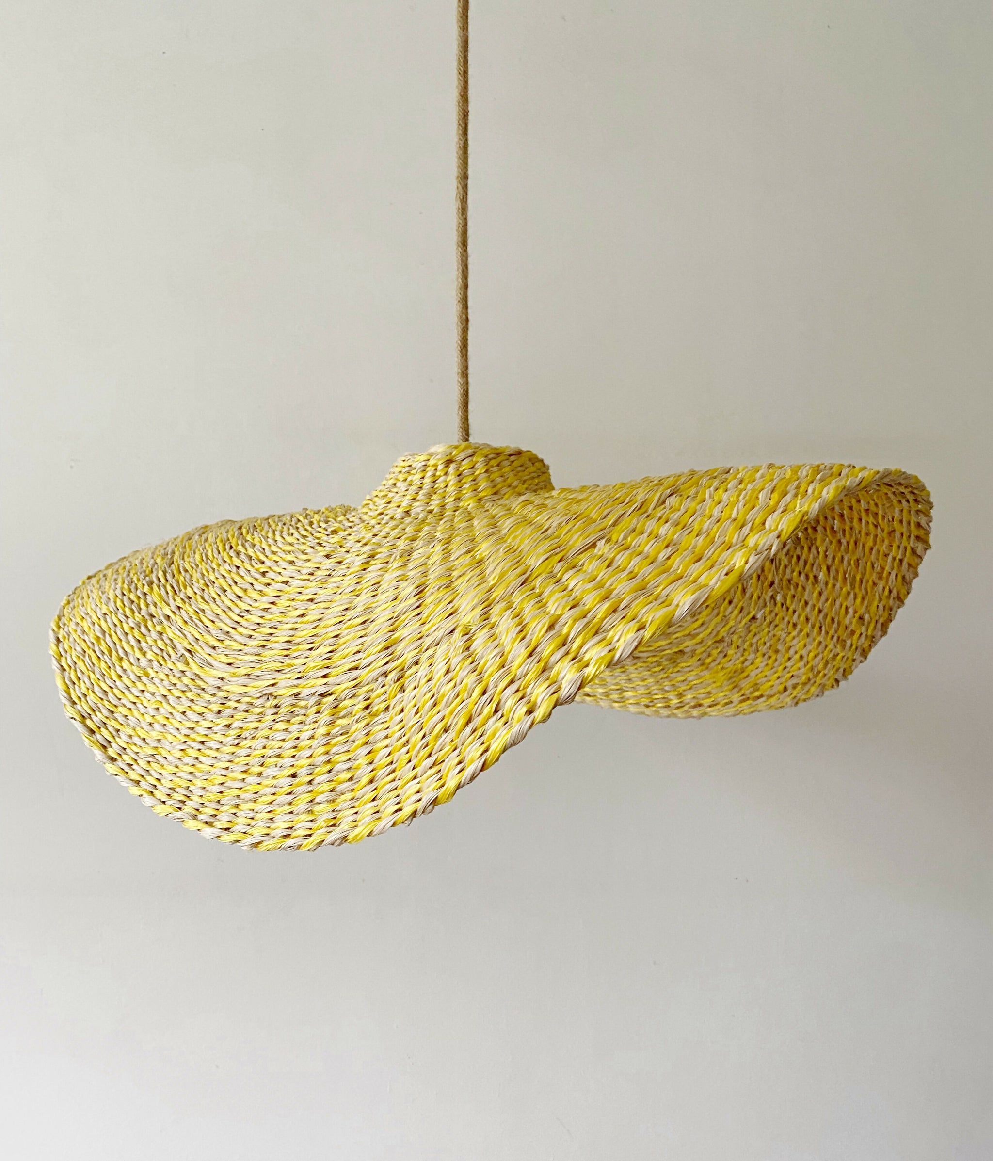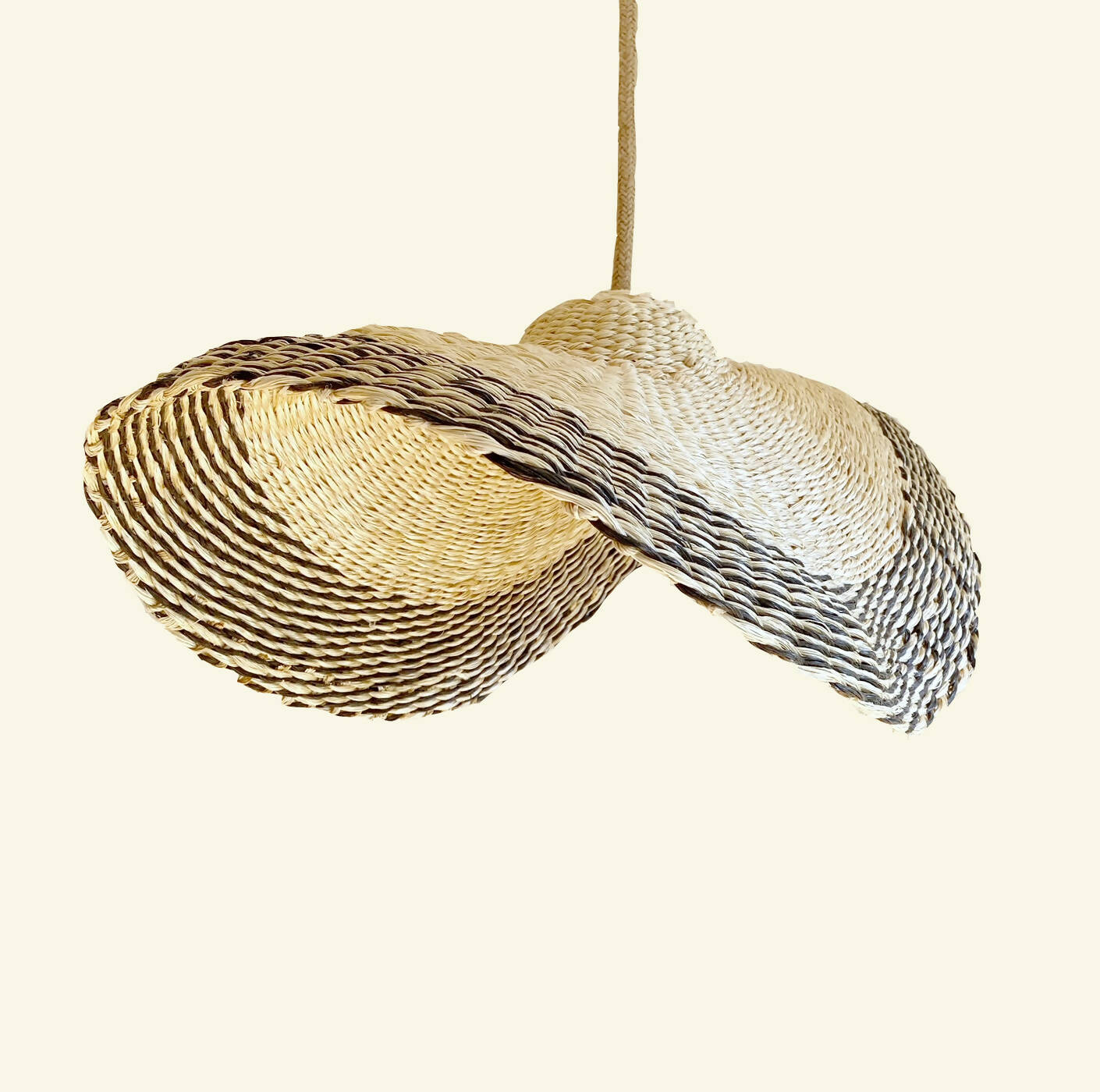 Lampara Nalca tejida en cuerda plástica reciclada beige en tecnica de cesteria .