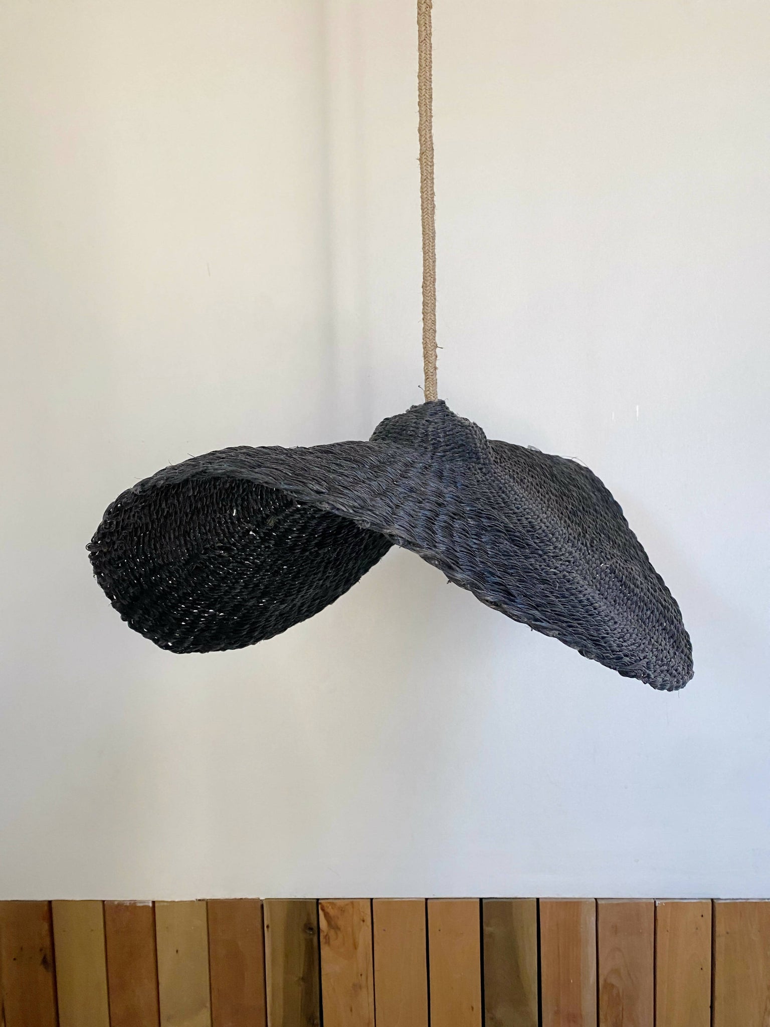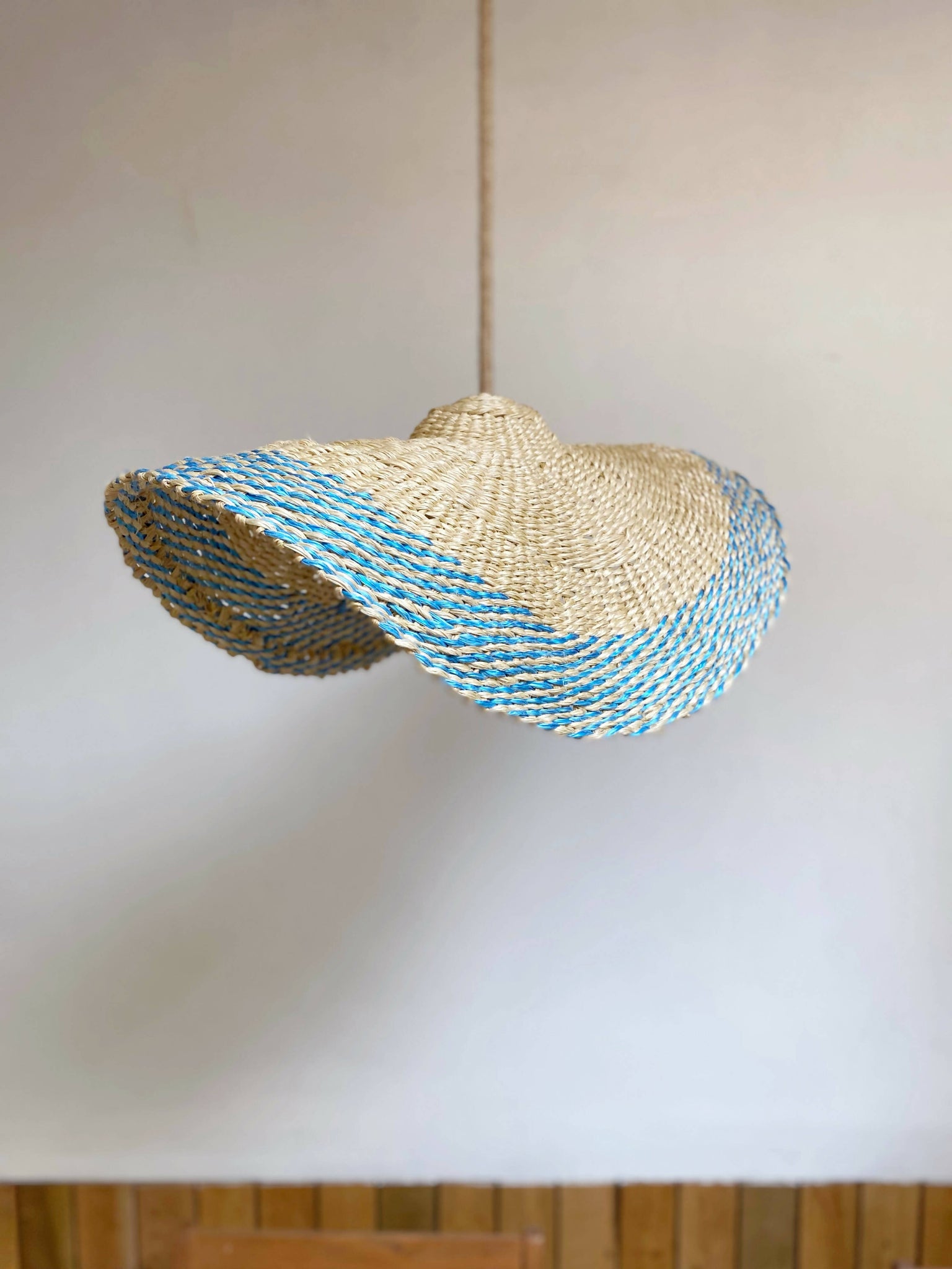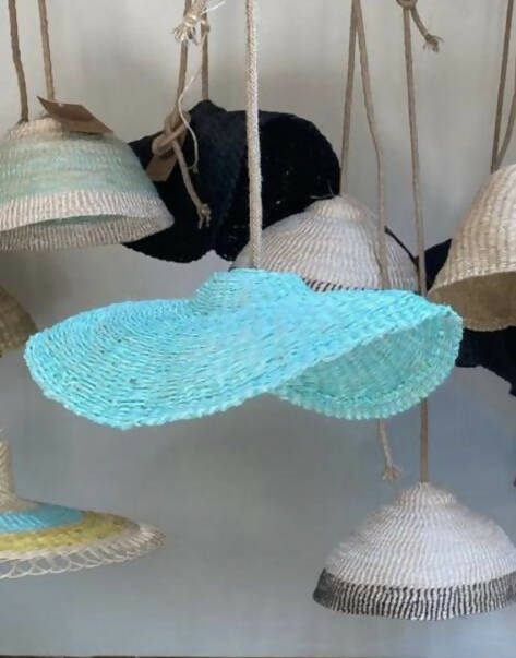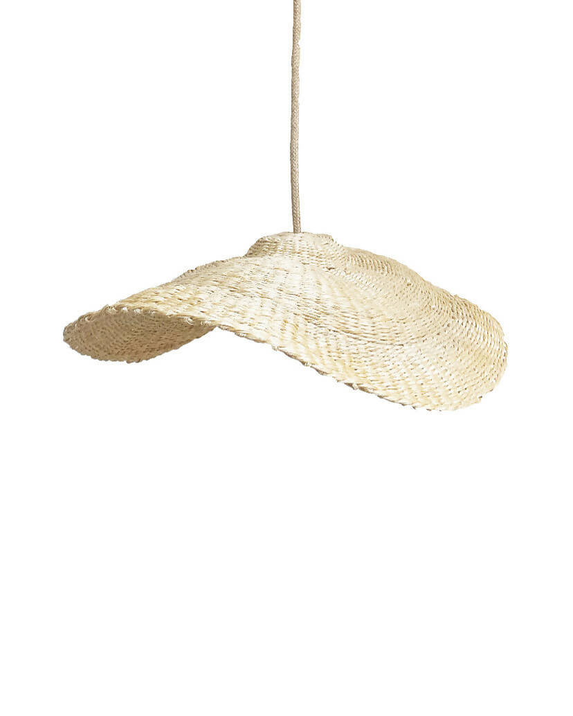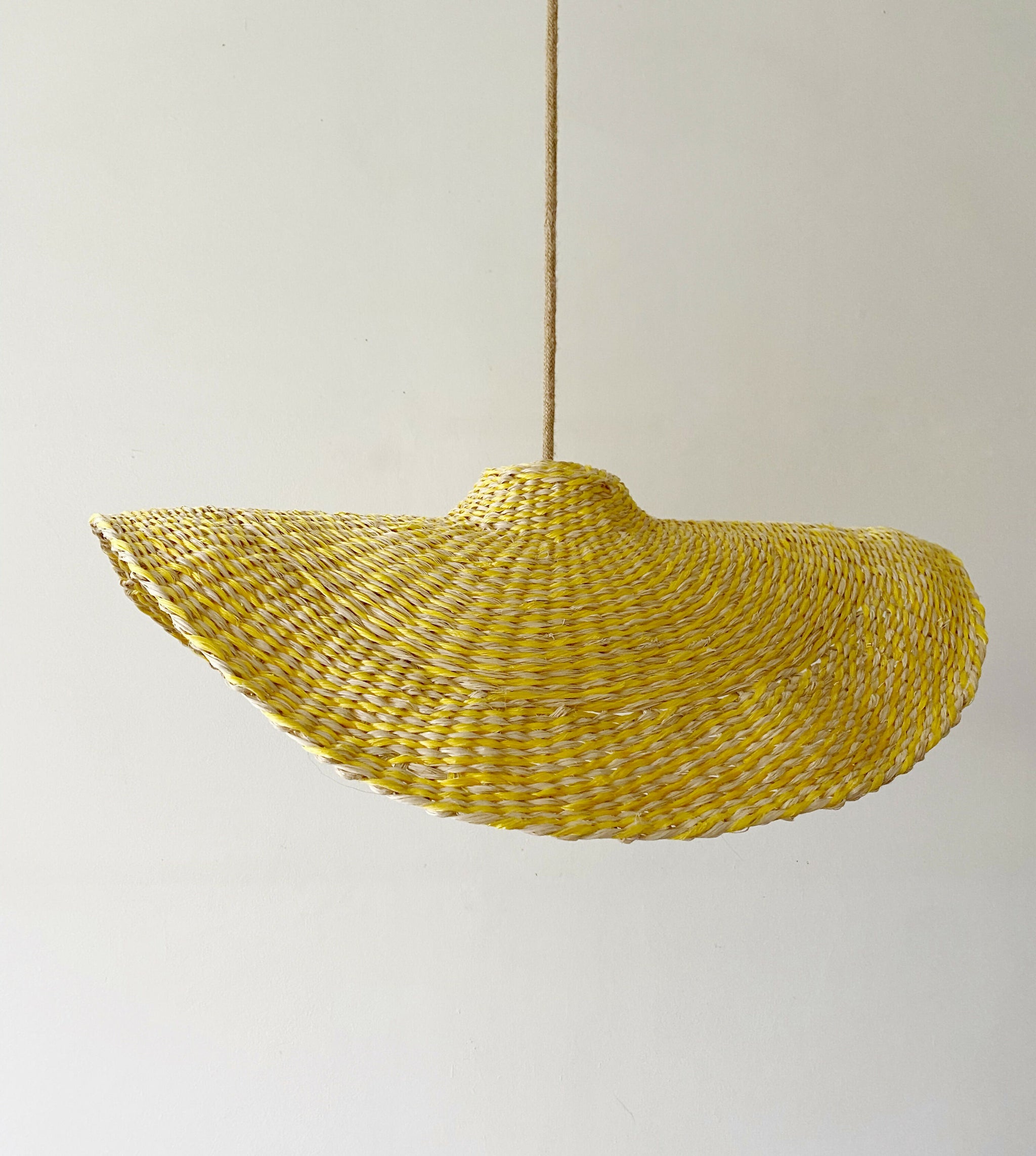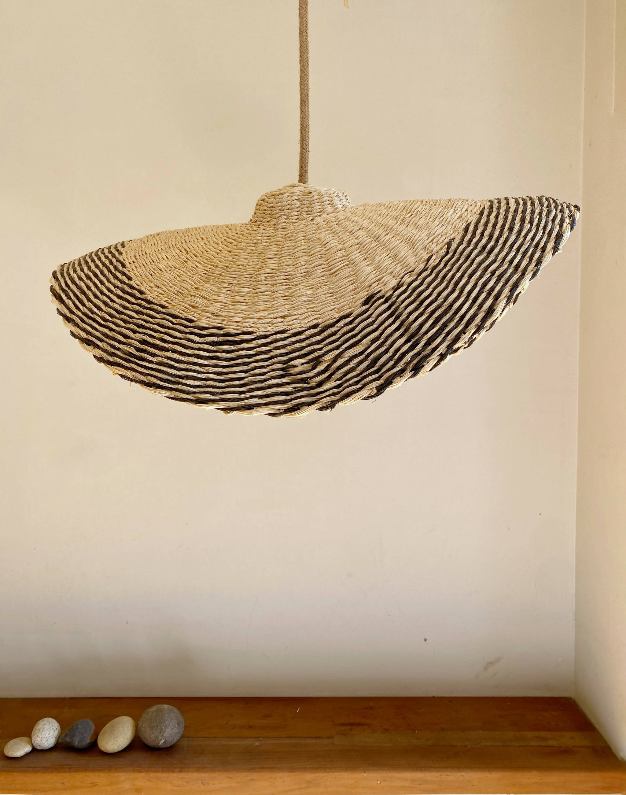 Lampara Nalca tejida en cuerda plástica reciclada beige en tecnica de cesteria .