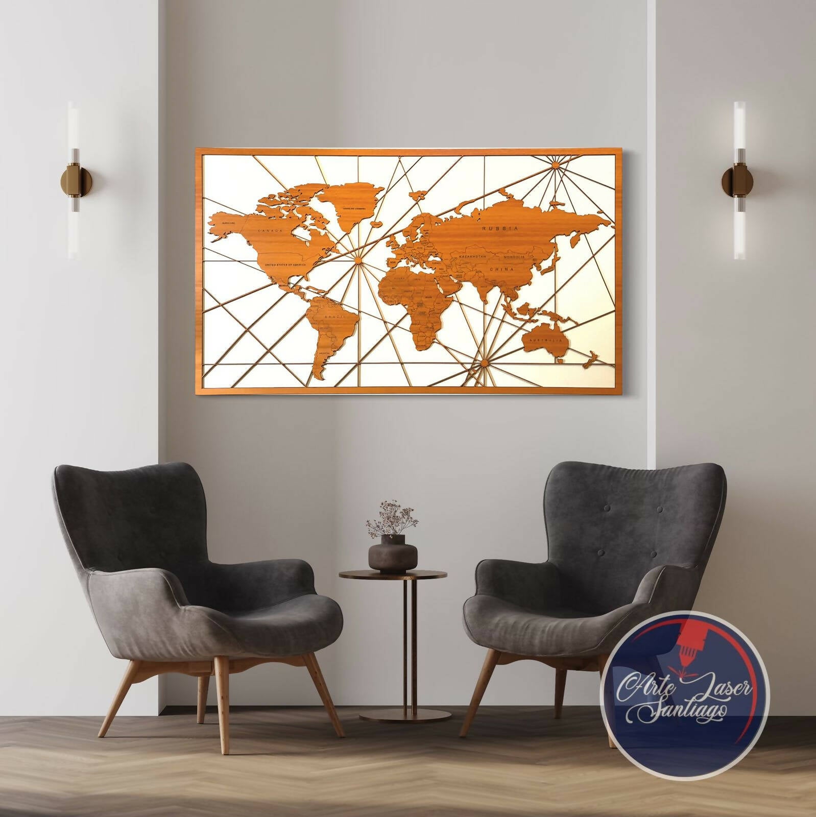 Hermoso planisferio en madera MDF de 6 mm de grosor, en color café y fondo blanco, con Paìses grabados, tamaño 120x70cm.