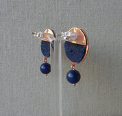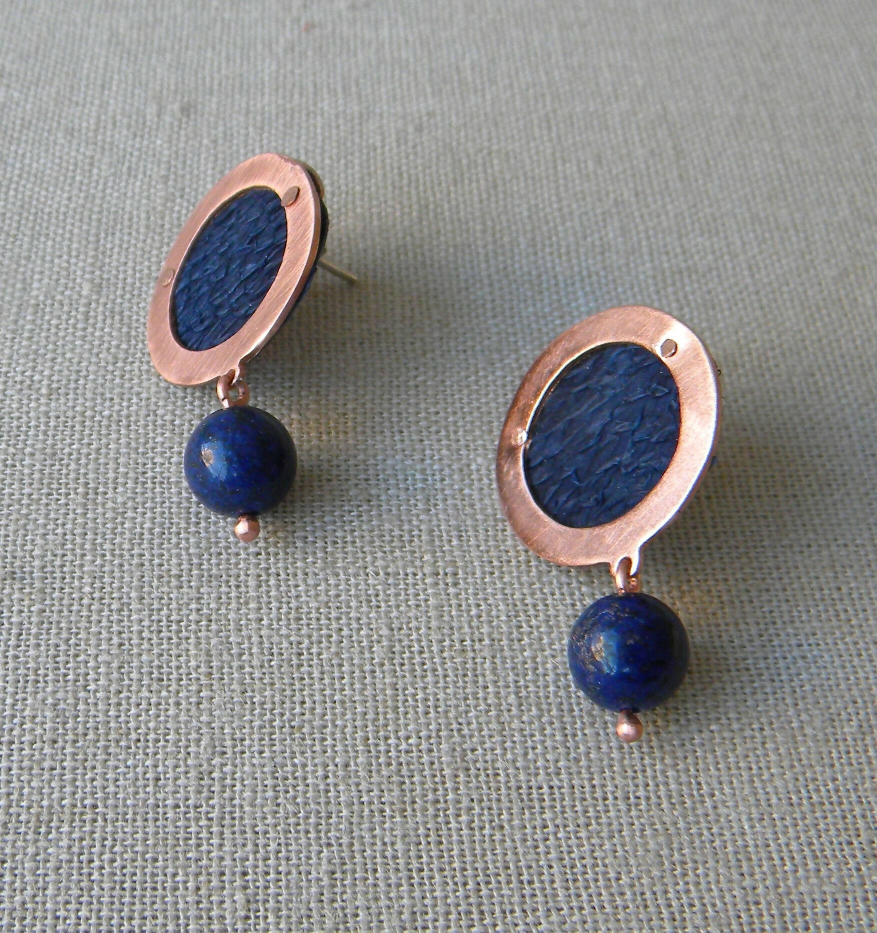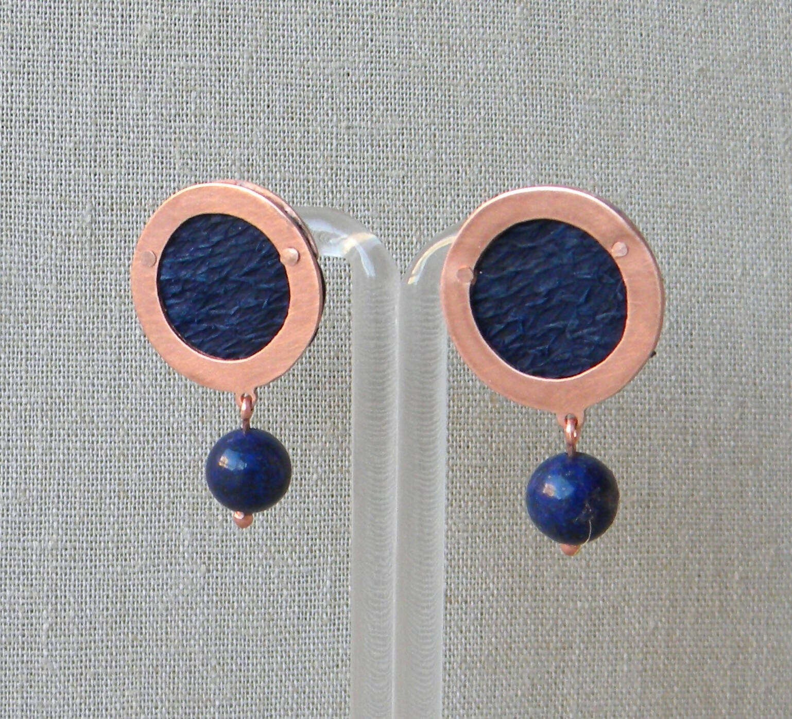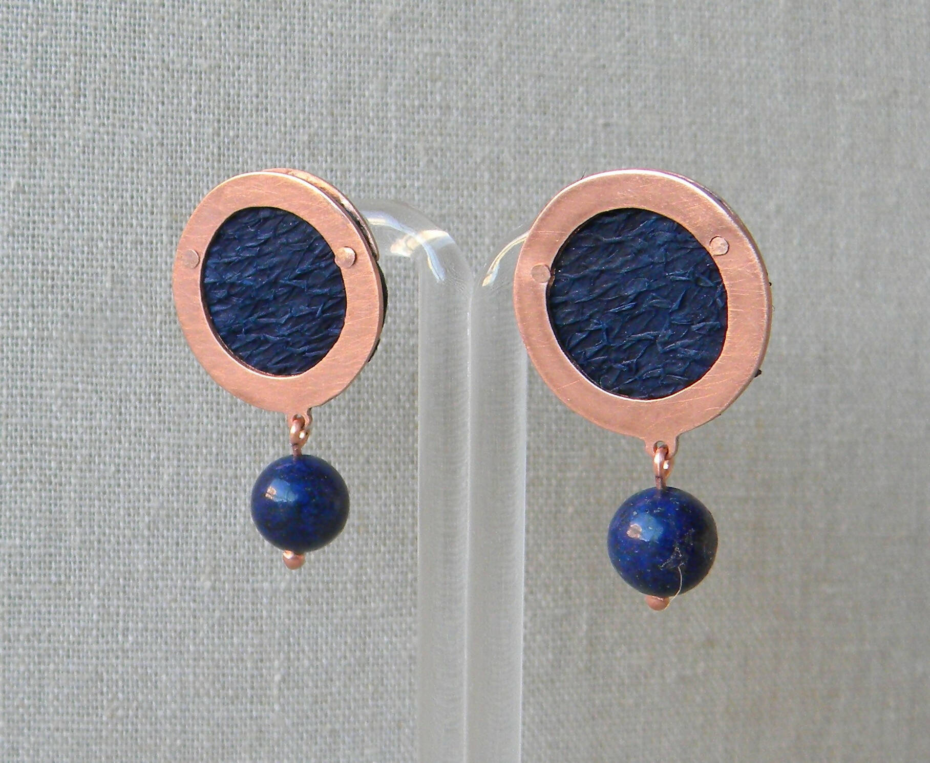 Aros con un diseño diferente y original que combina cobre, cuero de salmón y piedra semipreciosa de lapislázuli creados por Alwa.