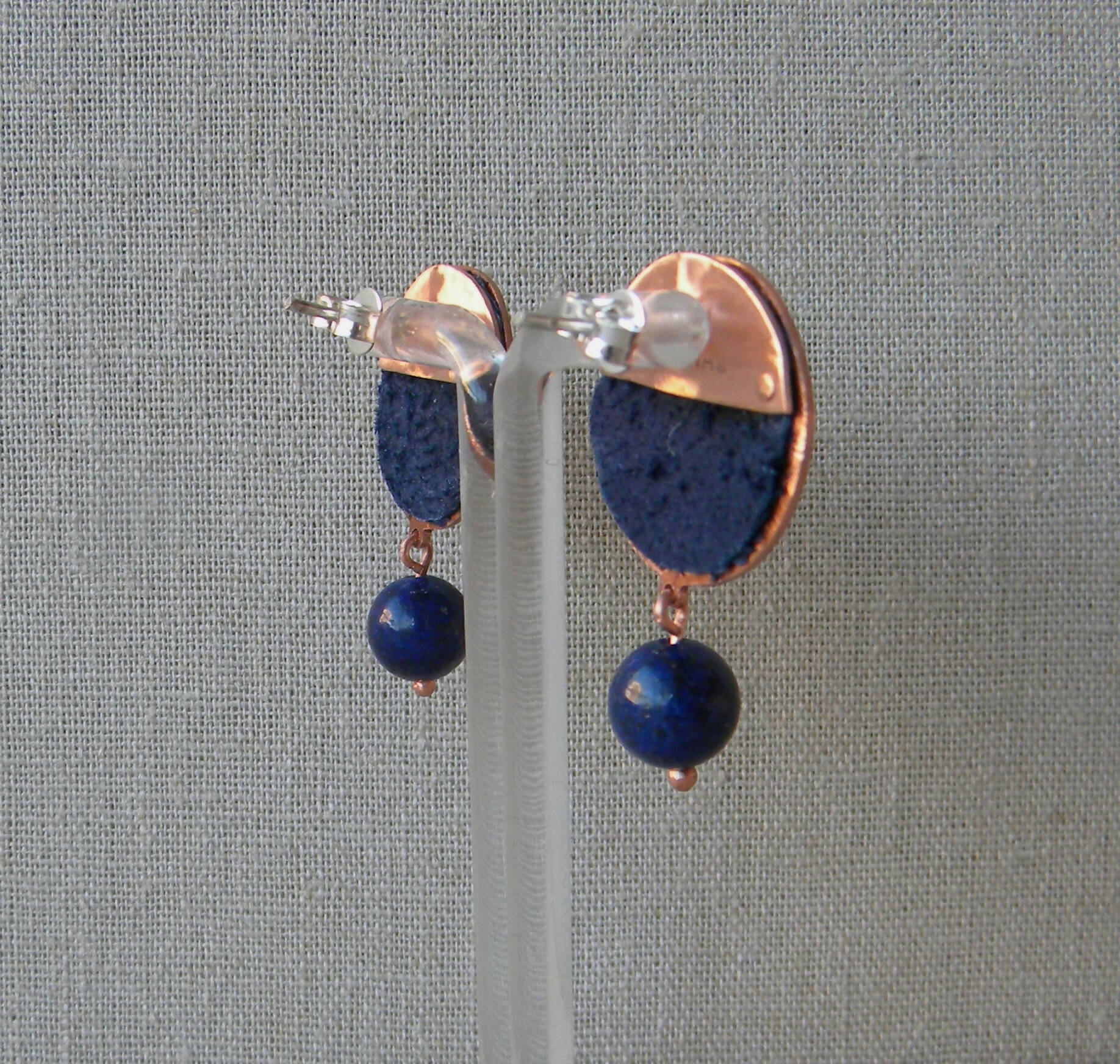 Están hechos en cobre con base redonda de 2cm de diámetro con cuero de salmón azul en su interior y piedra semipreciosa de lapislázuli en forma de pelota en tamaño mediano de 0,8cm de diámetro.