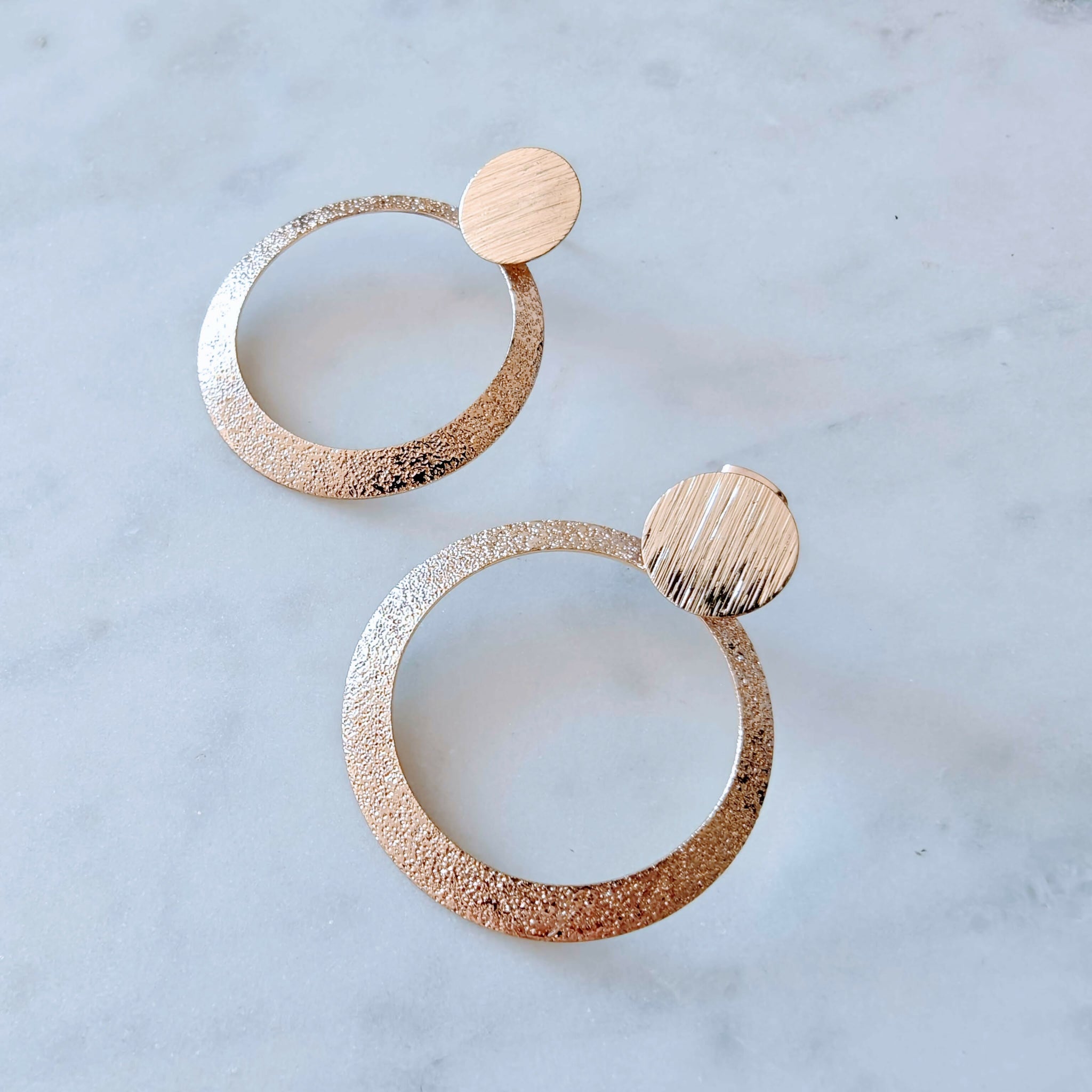 Aros en forma de O, bañados en oro con elegante terminación mate. Livianos, muy cómodos.