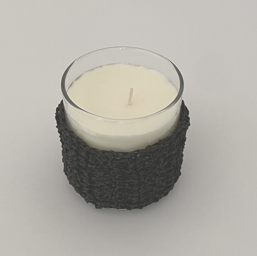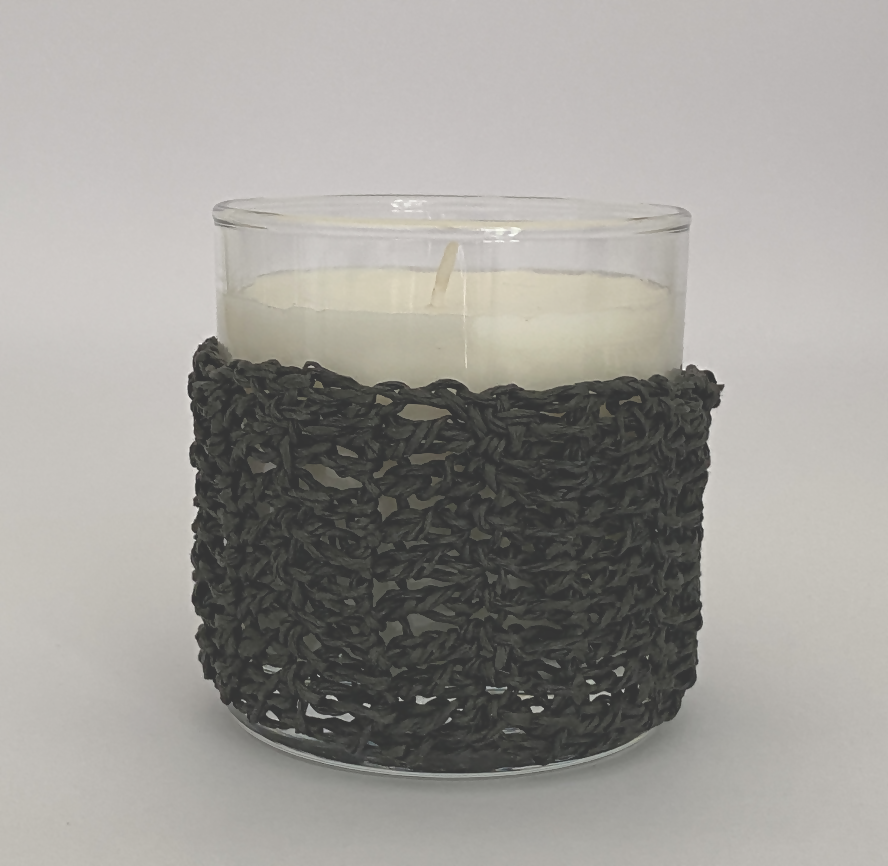Vela de cera de soja en vaso de vidrio con aplicación de tejido artesanal.