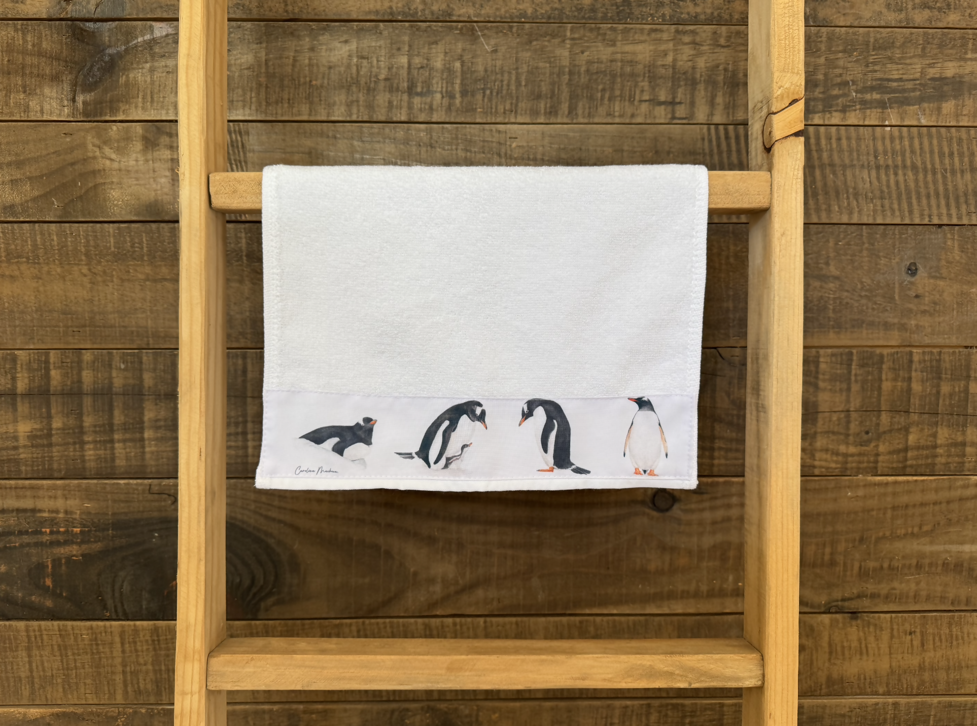 Toallas de visita para decorar tu baño con aplicación de ilustraciones de aves de Chile realizadas en acuarela por la artista Carolina Machuca.
