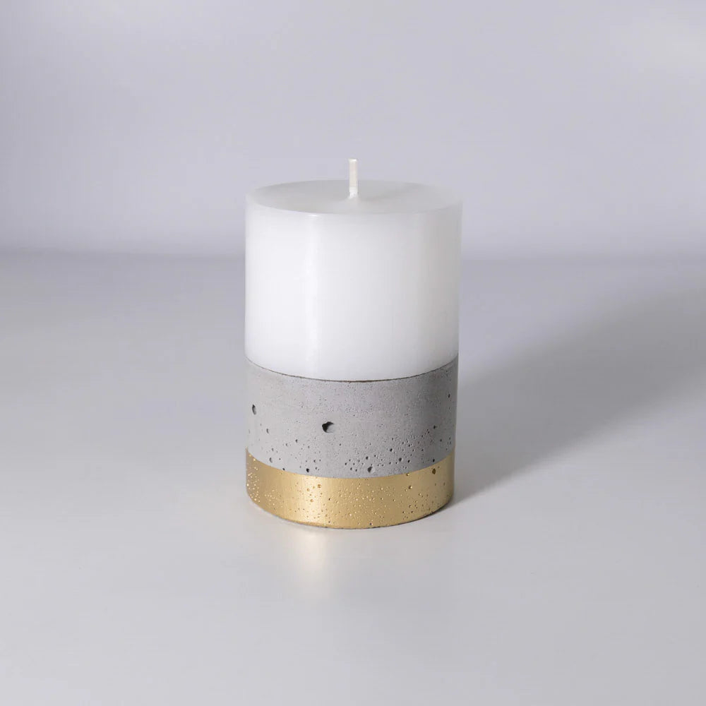 Vela con base de Hormigón y línea dorada, 100% hecha a mano en Chile, súper decorativa y de muy buena calidad, las fabricamos con los mejores productos para lograrlo. Perfecta para hacer un lindo y original regalo, para la decoración de los diferentes espacios de tu hogar o para lograr un momento acogedor con la rica luz de las velas. Ideal para armar conjuntos de velas sobre una bandeja en tu casa, jardín, mesa de centro, arrimo etc...