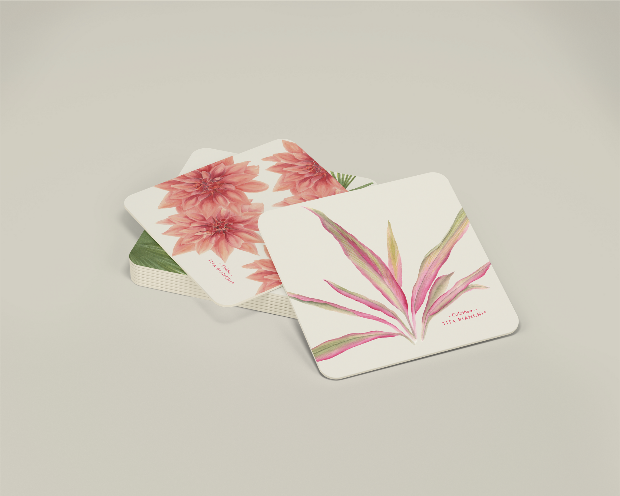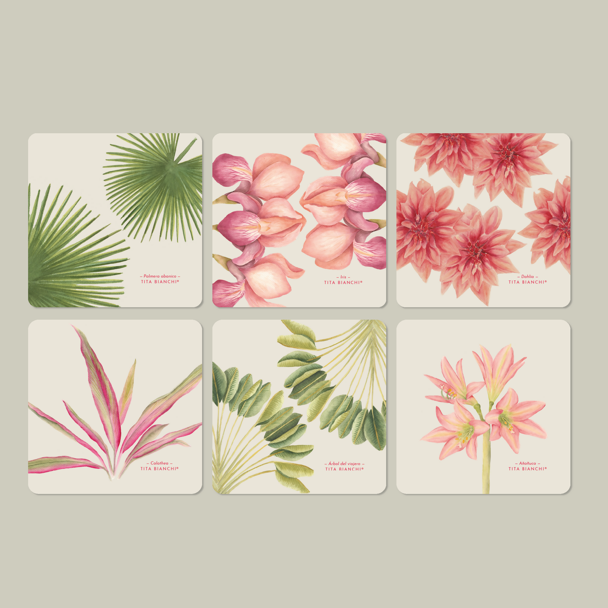 Pack de 6 posavasos inspirados en el mundo de las plantas y flores, con ilustraciones pintadas en acuarela. Lavables.