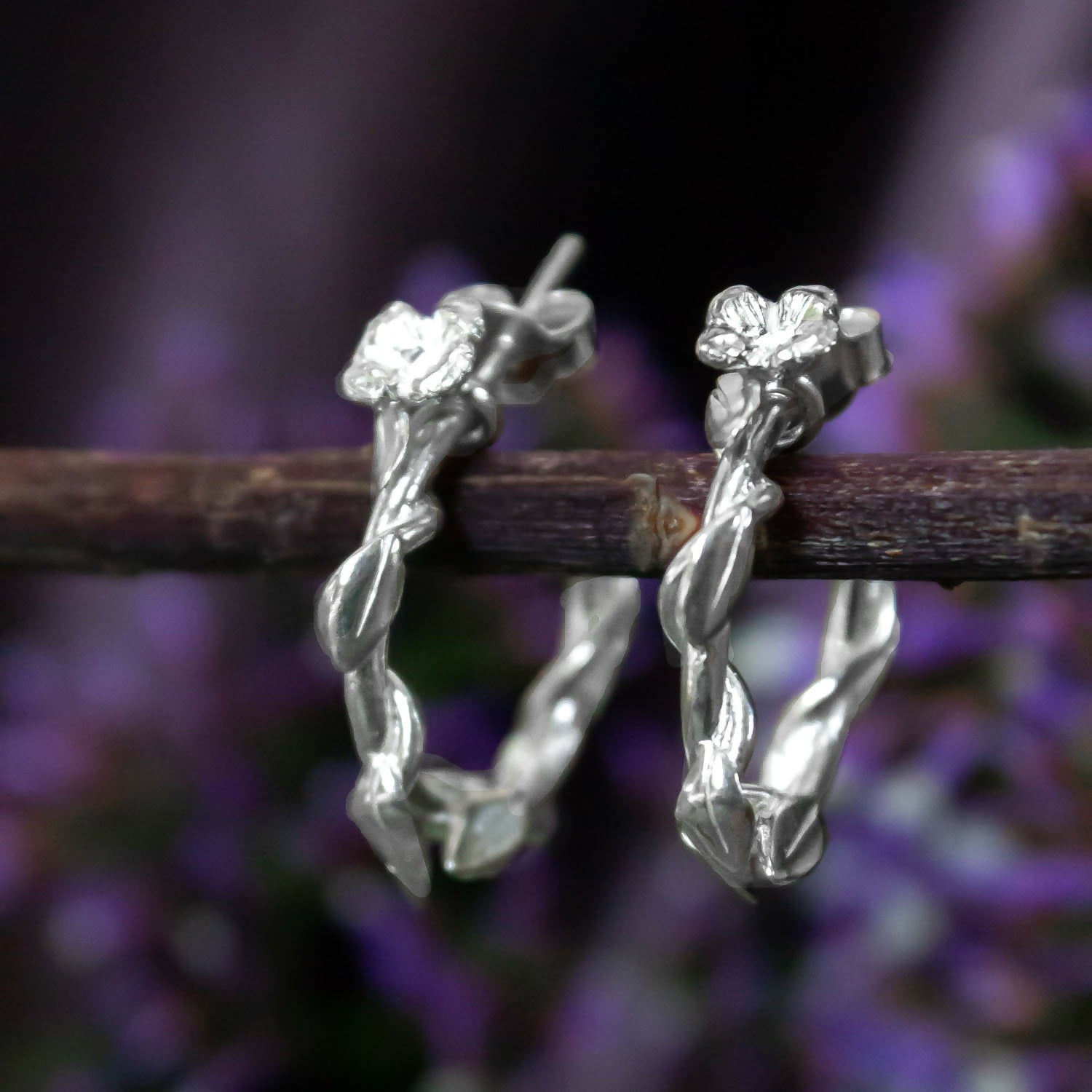 Argolla construida a mano imitando plantas del jardín que rodean un tronco. Hecha en plata 950.