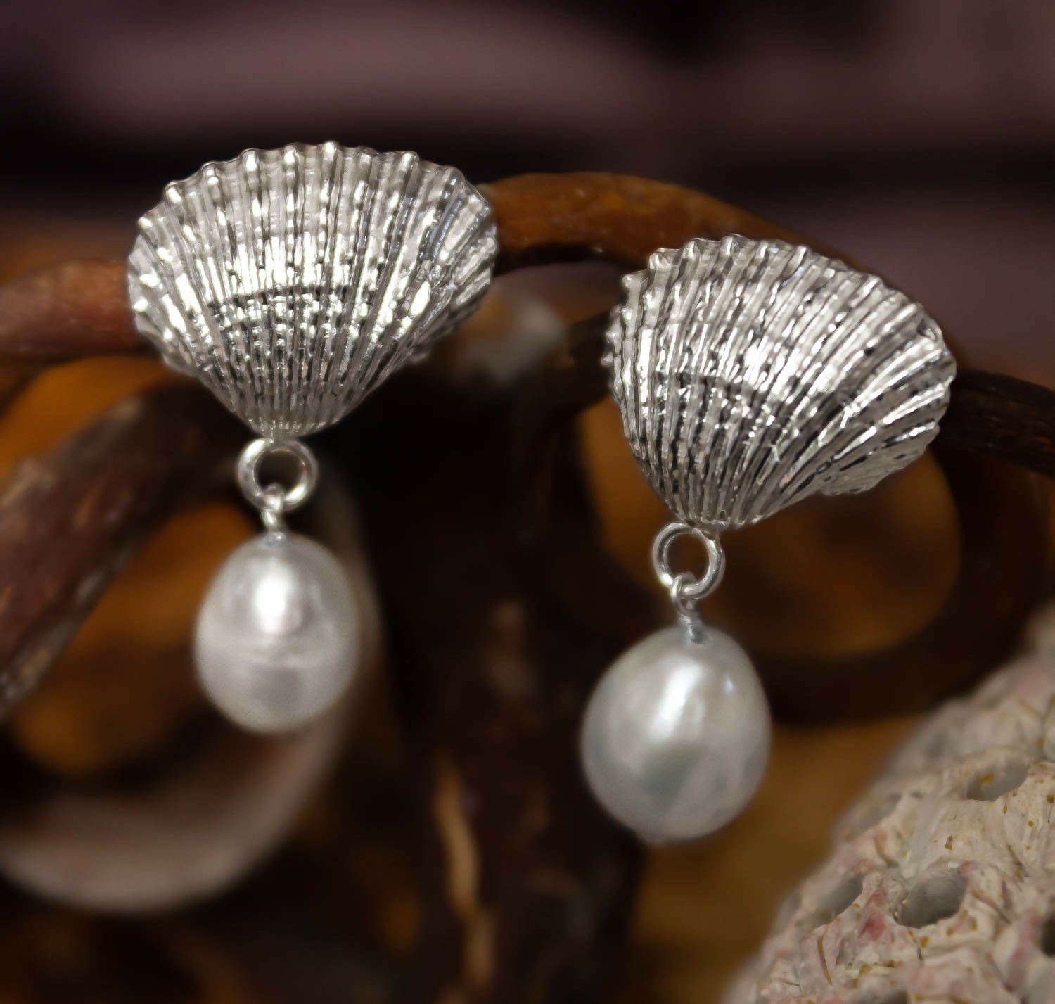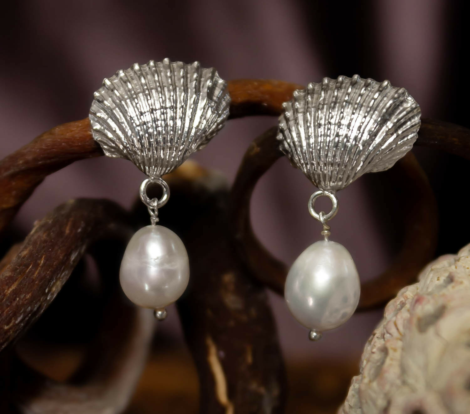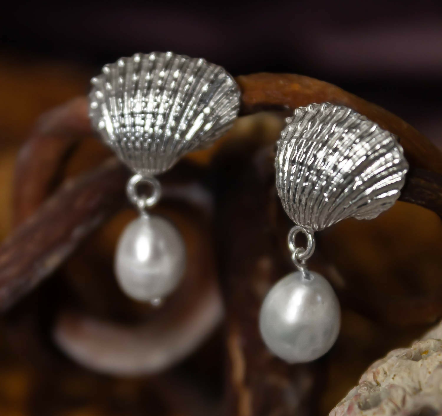 Aros en forma de conchita de almeja con perlas naturales. Pertenece a la colección Bosque de Midas, donde trabajamos con la matriz de la semilla real. Hechos en plata 950.