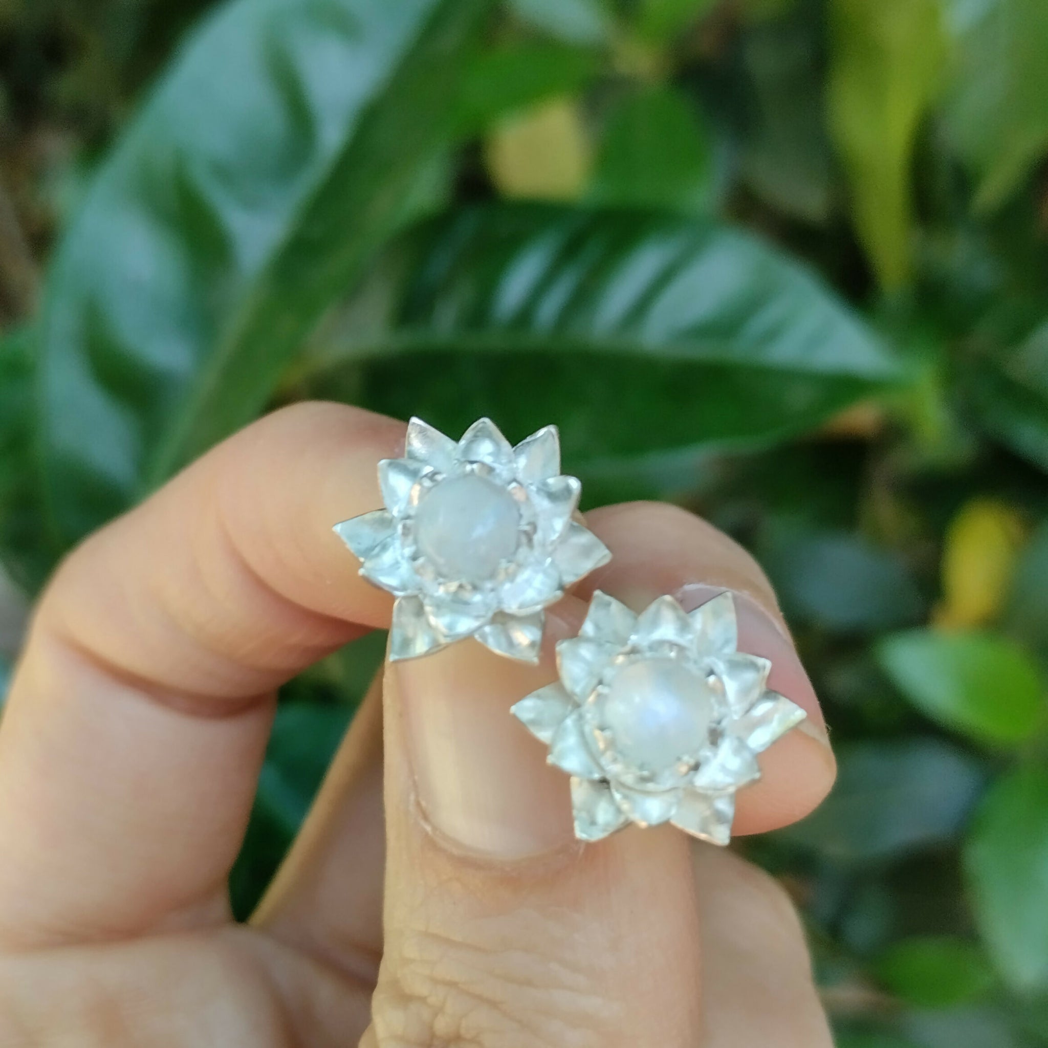 Aros basados en la flor de Loto, hechos en plata con dos capas de pétalos y engaste engrifa de piedra central de 5 milímetros. La piedra en este caso es piedra luna.