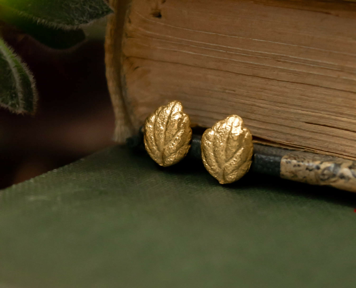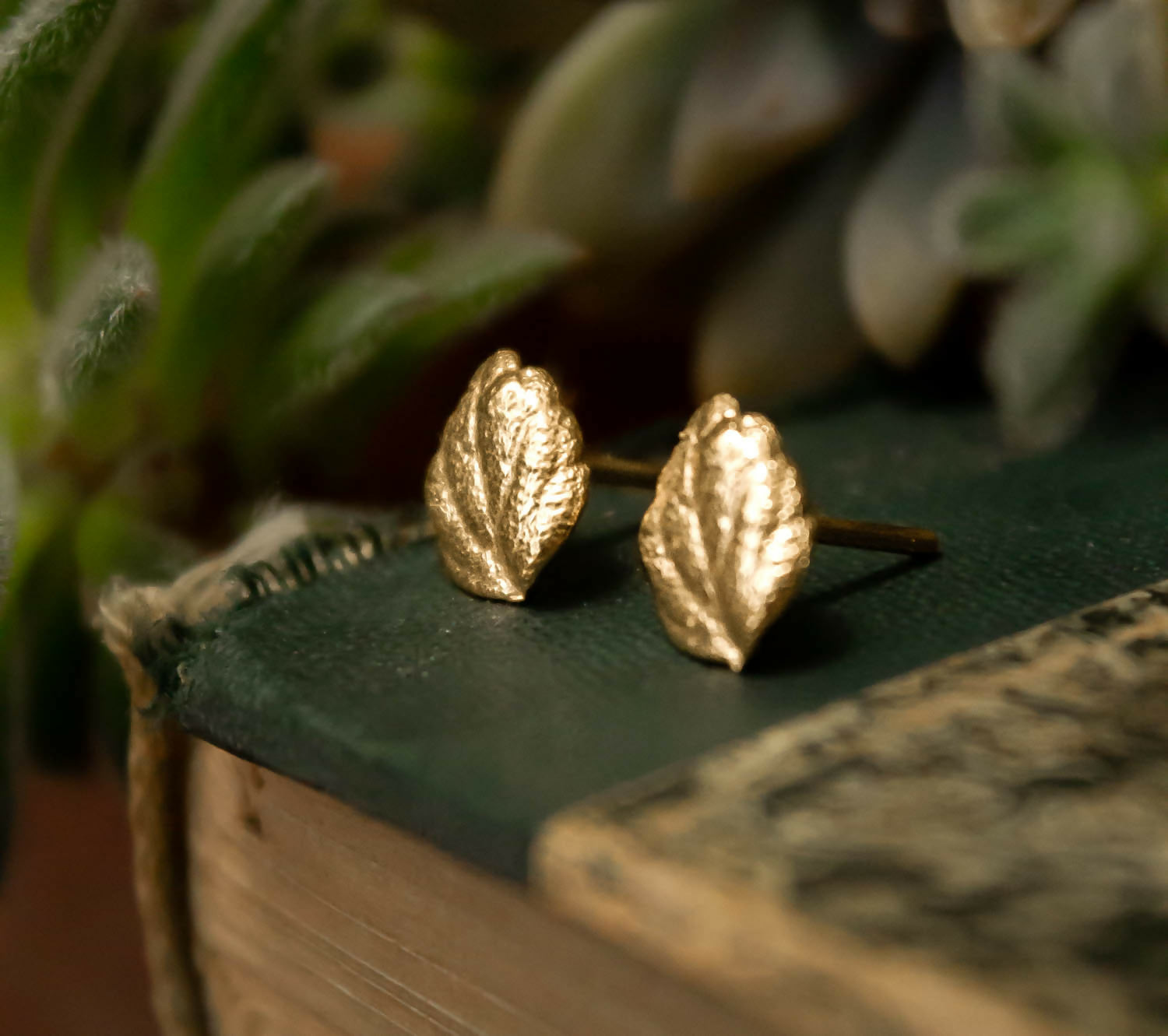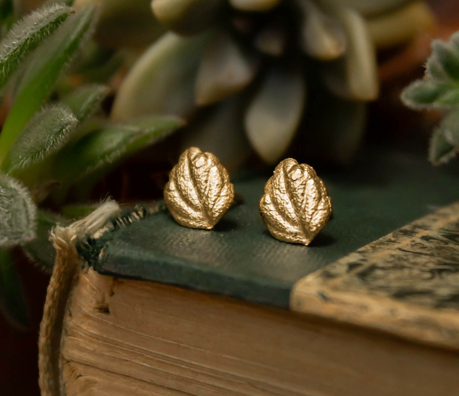 Aritos de hoja de Suculenta. Están hechos en bronce y enchapados en oro. Pertenecen a la colección Bosque de Midas, donde trabajamos con la matriz de la hoja real.