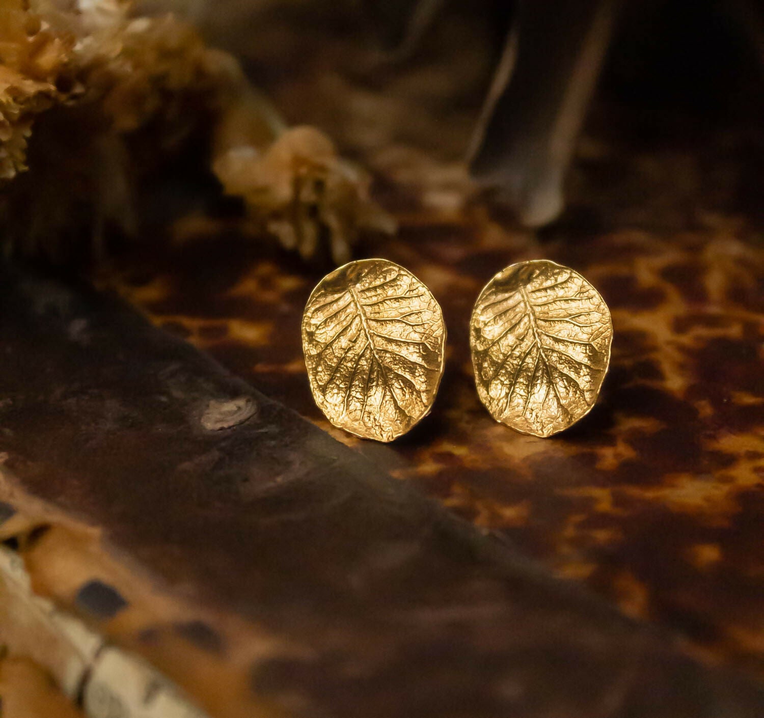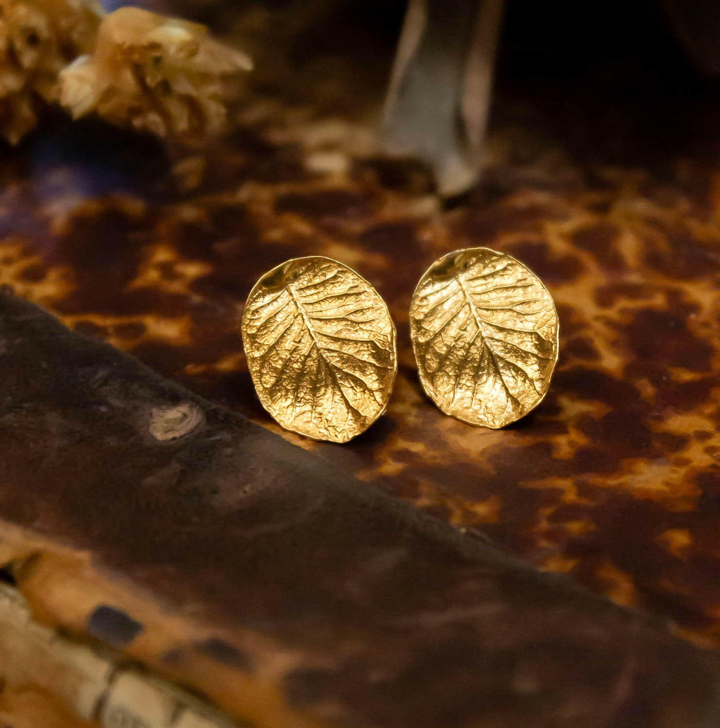 Aros de hoja tamaño pequeño, basados en el árbol de Ulmo del sur de Chile. Pertenece a la colección Bosque de Midas, donde trabajamos con la matriz de la hoja real, hecho en plata 950 con enchape en oro de 24 kilates.