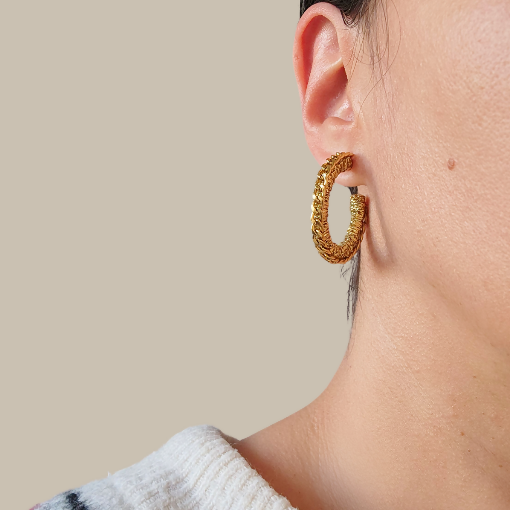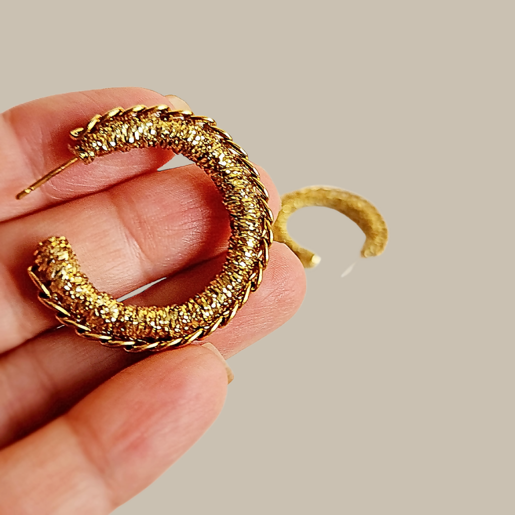 La combinación de Lurex y cadena de acero quirúrgico les confiere un brillo y una resistencia excepcionales. No solo estarás a la moda, sino que también disfrutarás de la durabilidad de estos pendientes.
