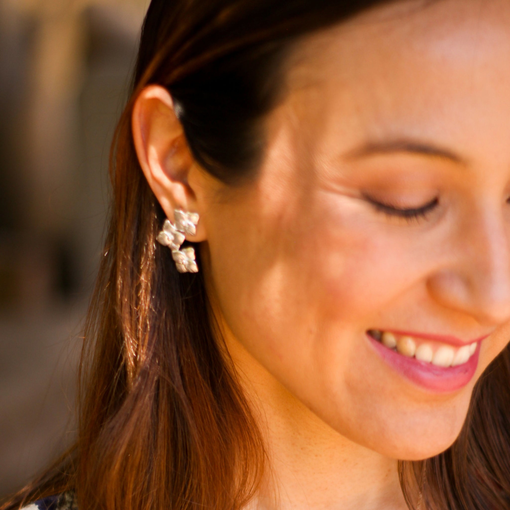 Aros inspirados en la flor de Hortensia, para tener más detalles solo hicimos 3 flores del buquet. Pertenecen a nuestra colección flores llamada Blossom. Están hechos a mano construidos a partir de distintas técnicas en metal. Hechos en plata 950.