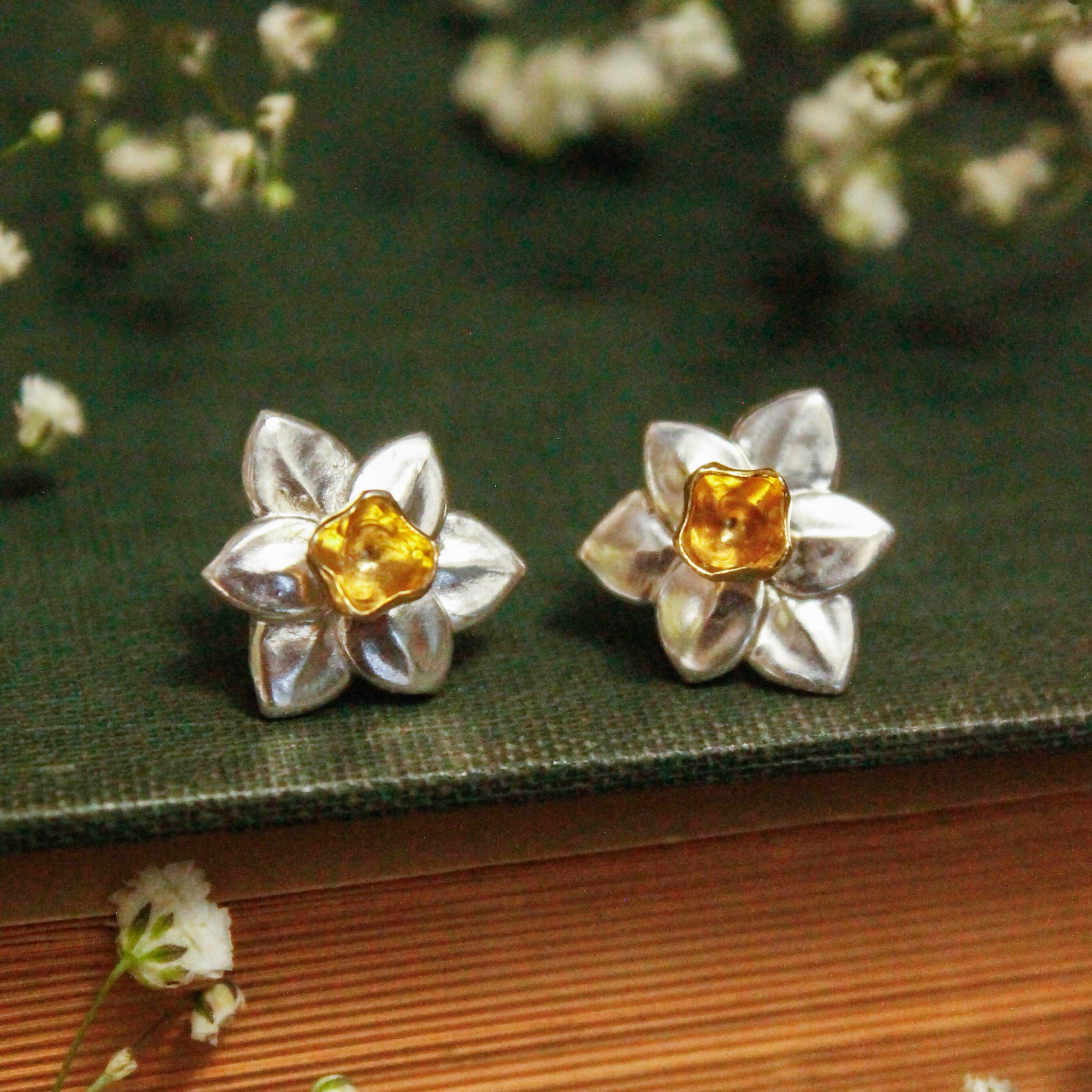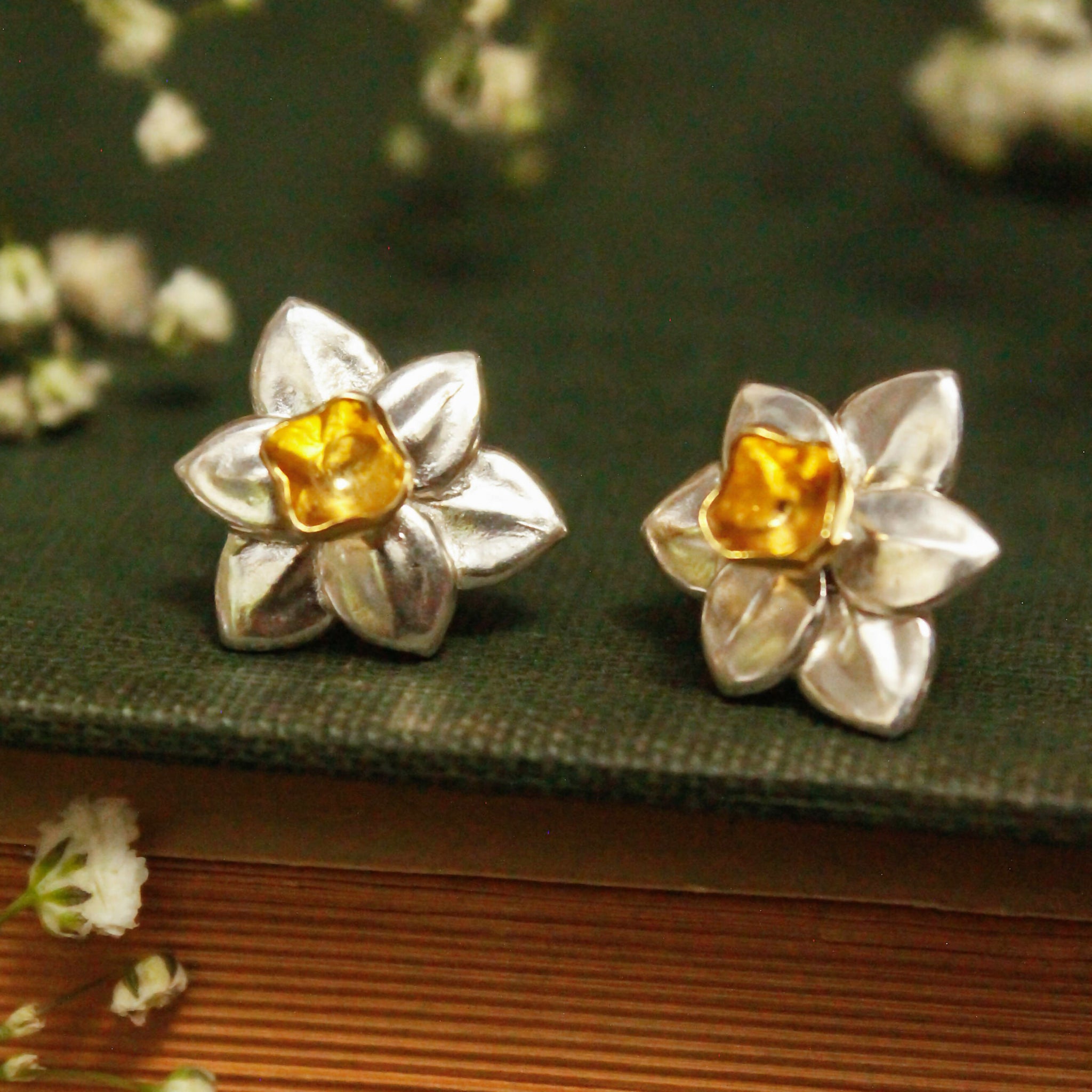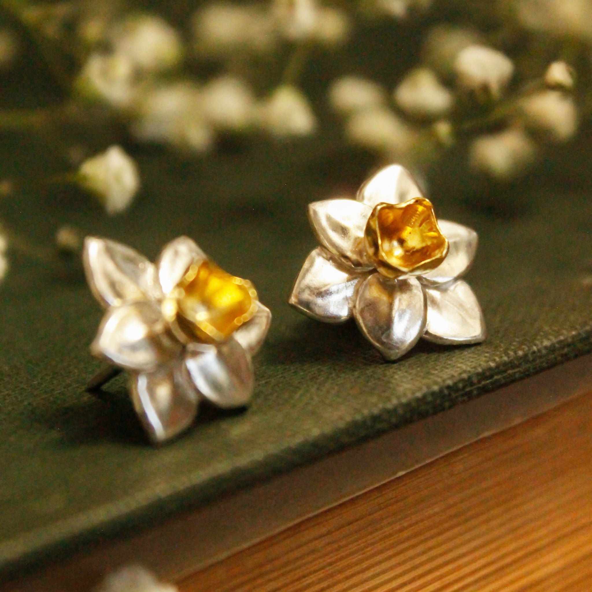 Aros inspirados en la flor de Narciso. Pertenecen a nuestra colección flores llamada Blossom. Están hechos a mano construidos a partir de distintas técnicas en metal. Hechos en plata 950 y el centro está además enchapado en oro.