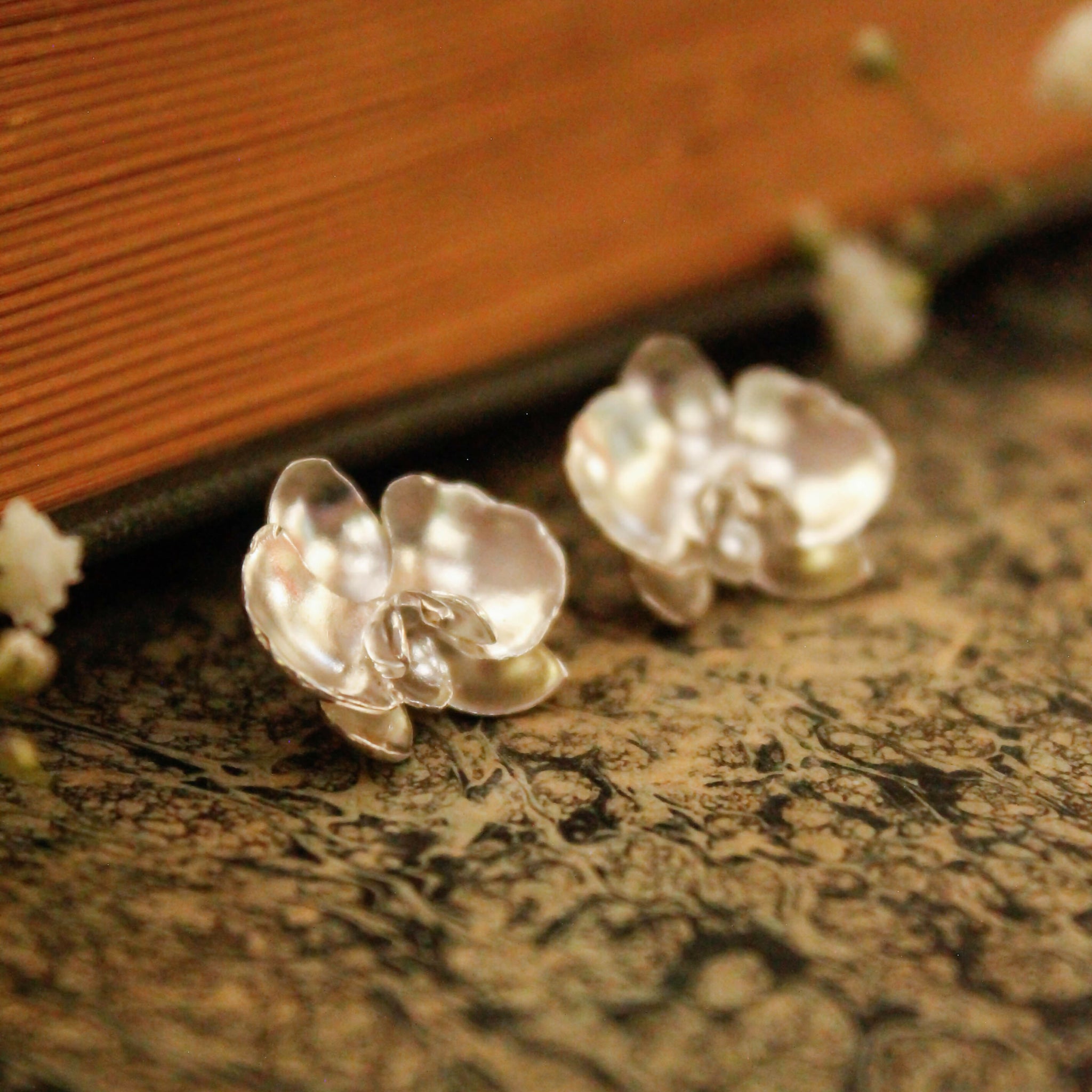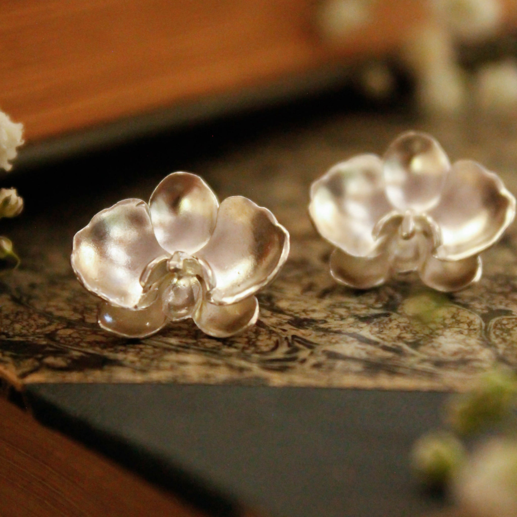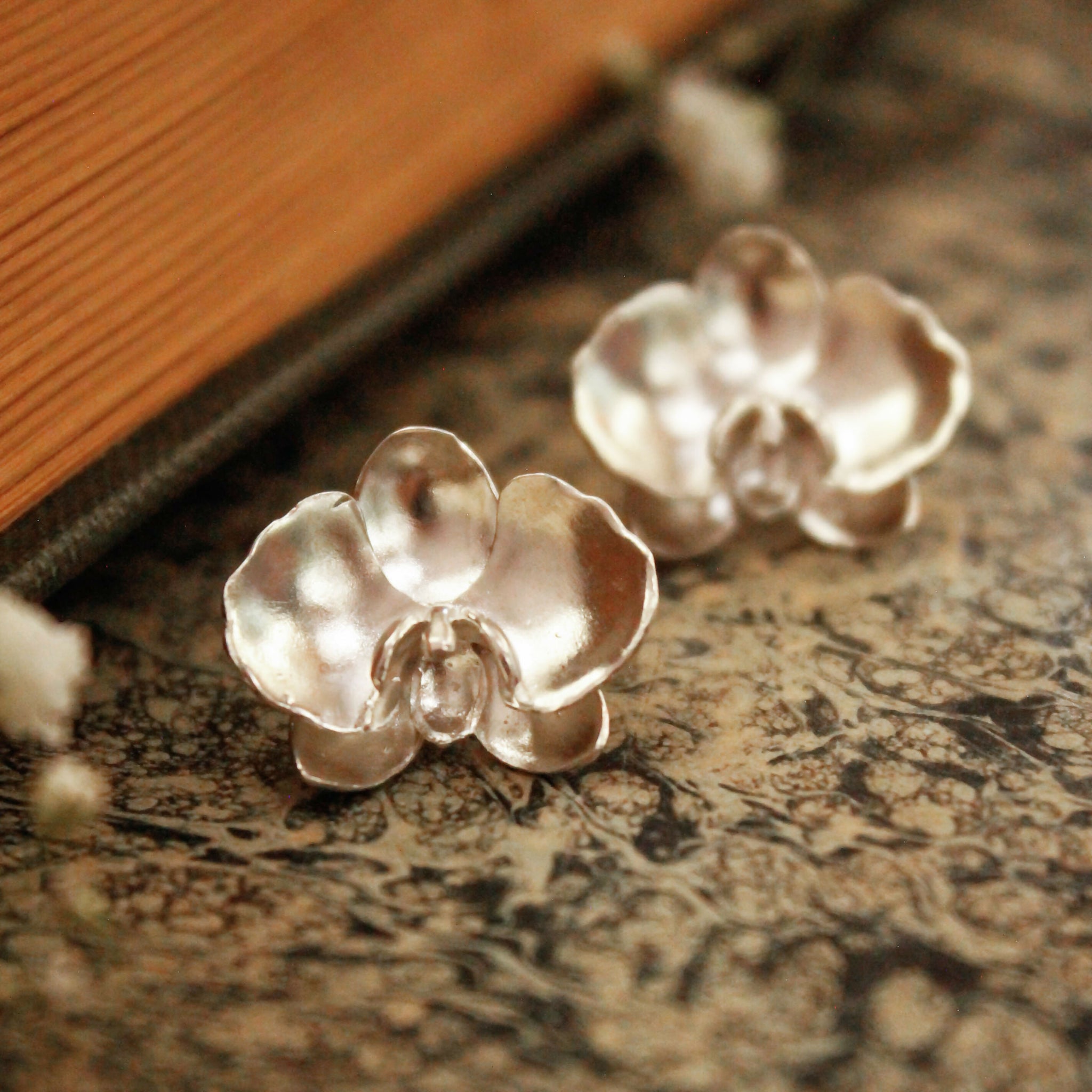 Aros inspirados en la flor de la Orquídea. Pertenecen a nuestra colección flores llamada Blossom. Están hechos a mano construidos a partir de distintas técnicas en metal. Hechos en plata 950.