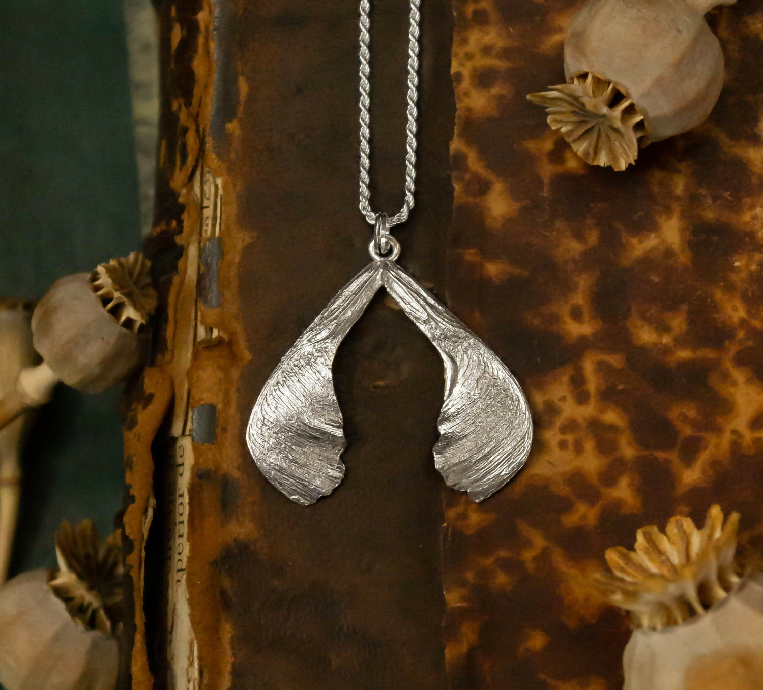 Colgante basado en la semilla de Arce, popularmente llamada helicóptero. Pertenece a la colección Bosque de Midas, donde trabajamos con la matriz de la semilla real, hecho en plata 950.