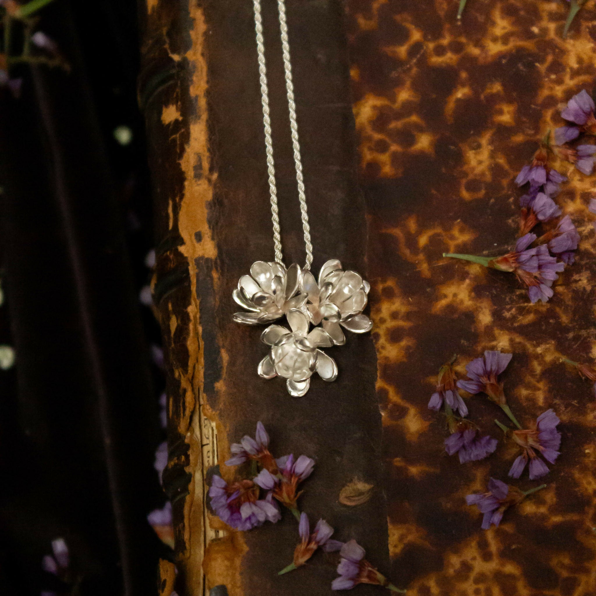 este arbusto es parte de la biodiverasidad botánica de nuestro país, habita el sur de Chiloé y zonas cordilleranas. Está hecho a mano construido a partir de distintas técnicas en metal. Hecho en plata 950.