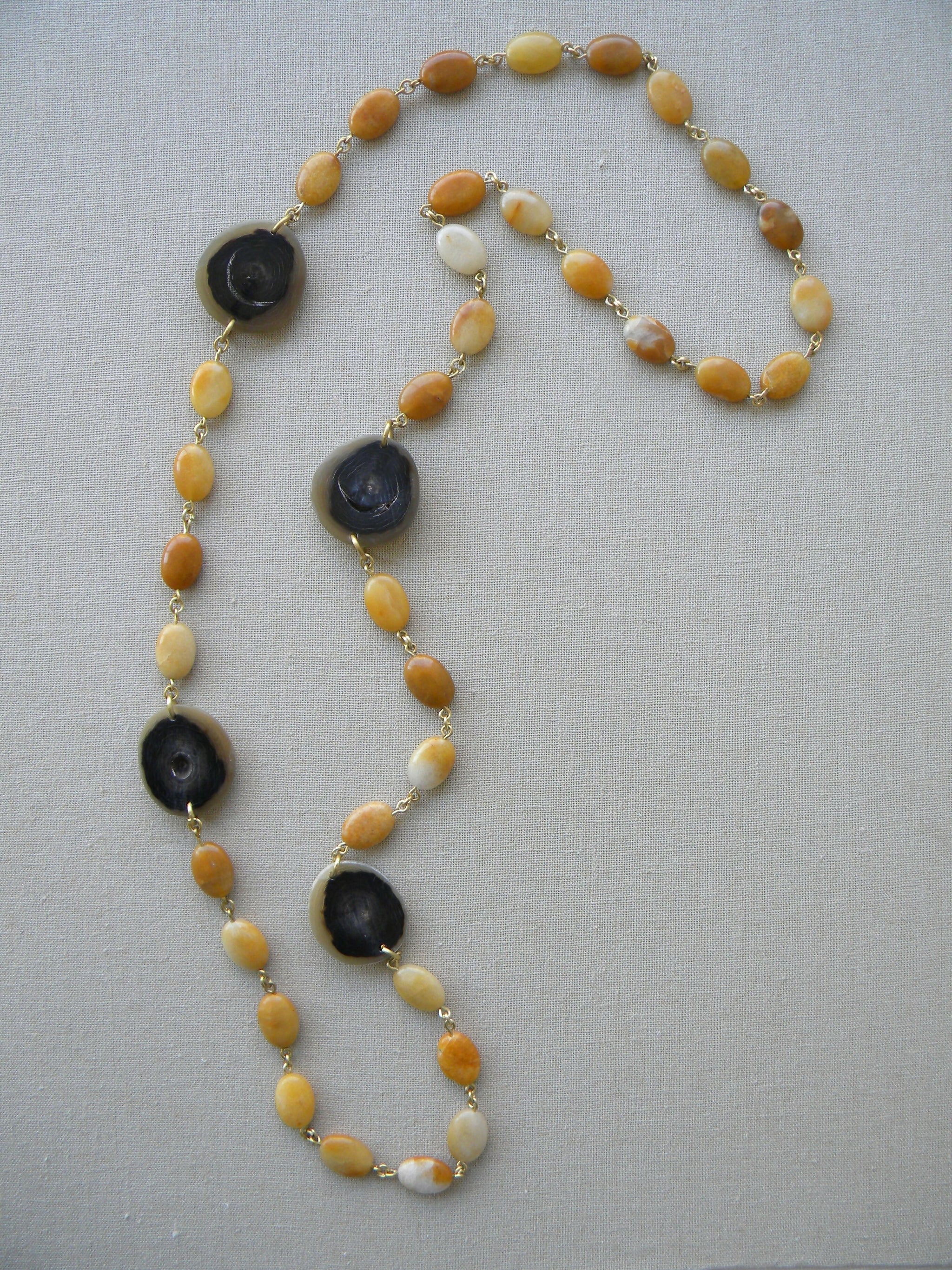 Está hecho en bronce con ágatas ovaladas en tonos ocres y beiges, combinadas con cuatro piezas de cuerno de vaca en tono negro y beige en forma de ovalada.