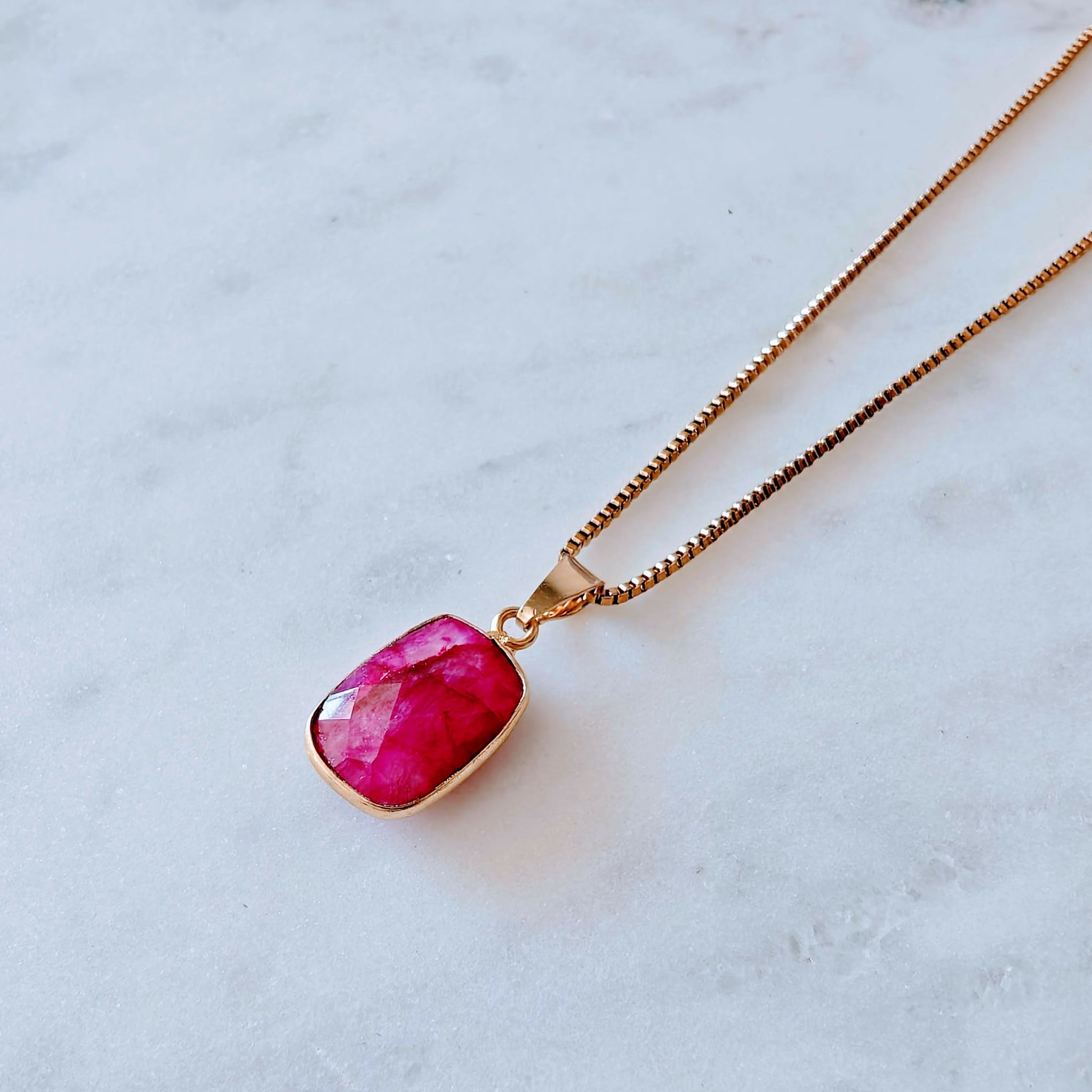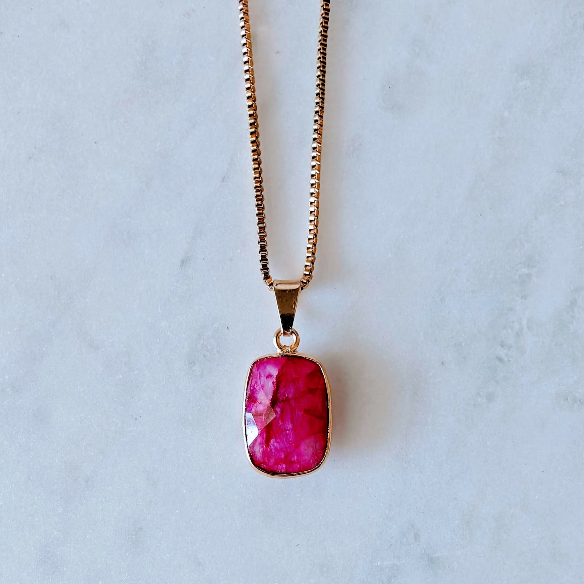 Extraordinario collar de Rubí natural de raíz, en forma rectangular con engaste y cadena enchapados en oro. Precioso, elegante y contemporáneo, los rubíes nunca pasarán de moda.